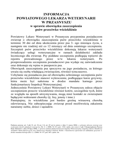 INFORMACJA POWIATOWEGO LEKARZA WETERYNARII W PRZASNYSZU w sprawie obowiązku zaszczepienia psów przeciwko wściekliźnie Powiatowy Lekarz Weterynarii w Przasnyszu przypomina posiadaczom zwierząt o obowiązku zaszczepienia psów przeciwko wściekliźnie w terminie 30 dni od dnia ukończenia przez psa 3- ego miesiąca życia, a następnie nie rzadziej niż co 12 miesięcy od dnia ostatniego szczepienia. Szczepień psów przeciwko wściekliźnie dokonują lekarze weterynarii świadczący usługi weterynaryjne w ramach działalności zakładu leczniczego dla zwierząt. Psy poddane szczepieniu podlegają wpisowi do rejestru prowadzonego przez w/w lekarza weterynarii. Po przeprowadzeniu szczepienia posiadaczowi psa wydaje się zaświadczenie oraz dokonuje się wpisu w paszporcie psa. Obowiązek zaszczepienia psa spoczywa na jego posiadaczu, za którego uważa się osobę władającą zwierzęciem, również tymczasowo. Uchylanie się posiadacza psa od obowiązku ochronnego szczepienia psów przeciwko wściekliźnie stanowi wykroczenie, podlegające karze grzywny, która może być nałożona w drodze mandatu karnego przez funkcjonariuszy Inspekcji Weterynaryjnej. Jednocześnie Powiatowy Lekarz Weterynarii w Przasnyszu zaleca objęcie szczepieniem przeciw wściekliźnie również kotów, szczególnie tych, które ze względu na sposób utrzymywania, mogą mieć kontakt ze zwierzętami będącymi wektorami choroby (tj. lisy, jenoty i inne.) Pamiętajmy, że wścieklizna jest bardzo groźną wirusową chorobą odzwierzęcą. Nie zabezpieczając zwierząt przed możliwością zakażenia narażamy siebie, dzieci i sąsiadów. Podstawa prawna: art. 2 pkt 33, art. 56 ust. 2-4, art. 85 ust.1a ustawy z dnia 11 marca 2004r. o ochronie zdrowia zwierząt oraz zwalczaniu chorób zakaźnych zwierząt (t.j. Dz. U. z 2008r. Nr 213, poz. 1342 z późn. zm.) oraz § 2 pkt 5 Rozporządzenia Prezesa Rady Ministrów z dnia 28 lipca 2008r. w sprawie nadania funkcjonariuszom Inspekcji Weterynaryjnej, Inspekcji Jakości Handlowej Artykułów Rolno-Spożywczych oraz Państwowej Inspekcji Ochrony Roślin i Nasiennictwa uprawnień do nakładania grzywien w drodze mandatu karnego (Dz. U. z 2008r. Nr 137, poz. 861 z późn. zm
