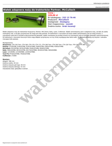 Informacje o produkcie Utworzono 02-03-2017 Wałek adapnera noży do traktorków Partner, McCulloch Cena : 109,00 zł Nr katalogowy : 532 13 76-46 Producent : McCulloch Dostępność : Dostępny Stan magazynowy : wysoki Średnia ocena : brak recenzji er m ar k Wałek adapnera noży do traktorków Husqvarna, Partner, McCulloch, Rally, Lazer, Craftsman. Wałek zamontowany jest w adapterze noży, od dołu do wałka montujemy nóż, a od góry przykręcone do niego jest koło pasowe. W traktorkach z wyrzutem do kosza wałek zamontowany jest po lewej stronie, a mocowanie noża jest w kształcie pięcioramiennej gwiazdki, wałek montowany po prawej stronie na mocowanie noża w kształcie gwiazdki sześcioramiennej. W traktorkach z wyrzutem bocznym które mają adapter przykręcony na trzy śruby występują dwa takie wałki. W zestawie znajdują się łożyska i nakrętka mocująca koło pasowe. Występowanie: Husqvarna: CTH 150 Twin, CTH 160, CTH 170, CTH 171, CTH 180 Twin, CTH 200 Twin, CTH 220 Twin, YTH 130, YTH 180. Partner: P12597RB, P14H107RB, P145107HRB, P18H107RB, P185107HRB, P200107HRB. McCulloch: M12597RB, M155107HRB, M185107HRB, M200107HRB. Rally: REN145HRB, RE155107RB, RE175H107RBK, RE20H107RBK, REN20HRBK. Lazer: LZ1292RB, LZ13592RBK, LZ20H107RBK. Yard Pro:YP165107HRB, YP200107HRB. Craftsman: LT1000 w at Wymiary: długość: 180 mm średnica wałka: 20 mm średnica łożyska górnego: 40 mm średnica łożyska dolnego: 47 mm mocowanie noża: gwiazdka 5 ramion Wygenerowano w programie www.oscGold.com