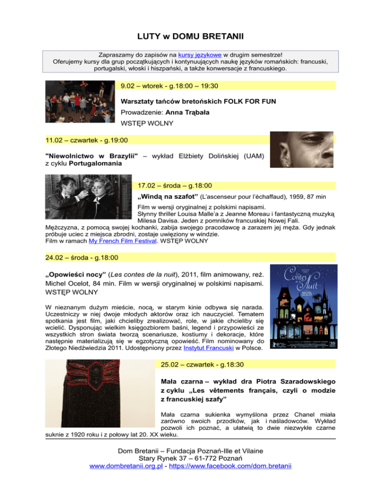 LUTY w DOMU BRETANII Zapraszamy do zapisów na kursy językowe w drugim semestrze! Oferujemy kursy dla grup początkujących i kontynuujących naukę języków romańskich: francuski, portugalski, włoski i hiszpański, a także konwersacje z francuskiego. 9.02 – wtorek - g.18:00 – 19:30 Warsztaty tańców bretońskich FOLK FOR FUN Prowadzenie: Anna Trąbała WSTĘP WOLNY 11.02 – czwartek - g.19:00 "Niewolnictwo w Brazylii" – wykład Elżbiety Dolińskiej (UAM) z cyklu Portugalomania 17.02 – środa – g.18:00 „Windą na szafot” (L’ascenseur pour l’échaffaud), 1959, 87 min Film w wersji oryginalnej z polskimi napisami. Słynny thriller Louisa Malle’a z Jeanne Moreau i fantastyczną muzyką Milesa Davisa. Jeden z pomników francuskiej Nowej Fali. Mężczyzna, z pomocą swojej kochanki, zabija swojego pracodawcę a zarazem jej męża. Gdy jednak próbuje uciec z miejsca zbrodni, zostaje uwięziony w windzie. Film w ramach My French Film Festival. WSTĘP WOLNY 24.02 – środa - g.18:00 „Opowieści nocy” (Les contes de la nuit), 2011, film animowany, reż. Michel Ocelot, 84 min. Film w wersji oryginalnej w polskimi napisami. WSTĘP WOLNY W nieznanym dużym mieście, nocą, w starym kinie odbywa się narada. Uczestniczy w niej dwoje młodych aktorów oraz ich nauczyciel. Tematem spotkania jest film, jaki chcieliby zrealizować, role, w jakie chcieliby się wcielić. Dysponując wielkim księgozbiorem baśni, legend i przypowieści ze wszystkich stron świata tworzą scenariusze, kostiumy i dekoracje, które następnie materializują się w egzotyczną opowieść. Film nominowany do Złotego Niedźwiedzia 2011. Udostępniony przez Instytut Francuski w Polsce. 25.02 – czwartek - g.18:30 Mała czarna – wykład dra Piotra Szaradowskiego z cyklu „Les vêtements français, czyli o modzie z francuskiej szafy” Mała czarna sukienka wymyślona przez Chanel miała zarówno swoich przodków, jak i naśladowców. Wykład pozwoli ich poznać, a ułatwią to dwie niezwykłe czarne suknie z 1920 roku i z połowy lat 20. XX wieku. Dom Bretanii – Fundacja Poznań-Ille et Vilaine Stary Rynek 37 – 61-772 Poznań www.dombretanii.org.pl - https://www.facebook.com/dom.bretanii