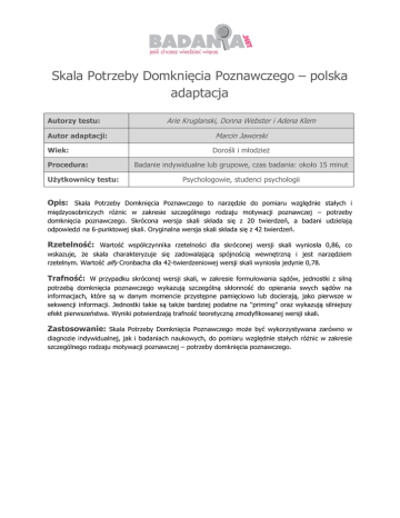 Skala Potrzeby Domknięcia Poznawczego – polska adaptacja Autorzy testu: Autor adaptacji: Wiek: Procedura: Użytkownicy testu: Arie Kruglanski, Donna Webster i Adena Klem Marcin Jaworski Dorośli i młodzież Badanie indywidualne lub grupowe, czas badania: około 15 minut Psychologowie, studenci psychologii Opis: Skala Potrzeby Domknięcia Poznawczego to narzędzie do pomiaru względnie stałych i międzyosobniczych różnic w zakresie szczególnego rodzaju motywacji poznawczej – potrzeby domknięcia poznawczego. Skrócona wersja skali składa się z 20 twierdzeń, a badani udzielają odpowiedzi na 6-punktowej skali. Oryginalna wersja skali składa się z 42 twierdzeń. Rzetelność: Wartość współczynnika rzetelności dla skróconej wersji skali wyniosła 0,86, co wskazuje, że skala charakteryzuje się zadowalającą spójnością wewnętrzną i jest narzędziem rzetelnym. Wartość alfy Cronbacha dla 42-twierdzeniowej wersji skali wyniosła jedynie 0,78. Trafność: W przypadku skróconej wersji skali, w zakresie formułowania sądów, jednostki z silną potrzebą domknięcia poznawczego wykazują szczególną skłonność do opierania swych sądów na informacjach, które są w danym momencie przystępne pamięciowo lub docierają, jako pierwsze w sekwencji informacji. Jednostki takie są także bardziej podatne na "priming" oraz wykazują silniejszy efekt pierwszeństwa. Wyniki potwierdzają trafność teoretyczną zmodyfikowanej wersji skali. Zastosowanie: Skala Potrzeby Domknięcia Poznawczego może być wykorzystywana zarówno w diagnozie indywidualnej, jak i badaniach naukowych, do pomiaru względnie stałych różnic w zakresie szczególnego rodzaju motywacji poznawczej – potrzeby domknięcia poznawczego.