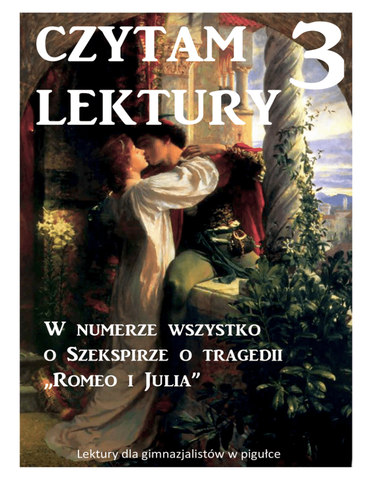 CZYTAM LEKTURY W numerze wszystko o Szekspirze o tragedii „Romeo i Julia” Lektury dla gimnazjalistów w pigułce 3 William Shakespeare, artysta wszechczasów, jego biografia jak i twórczość owiana jest tajemnicami oraz kontrowersjami, i można powiedzieć, że jest on wciąż na językach. Nie tylko jako autor lektur szkolnych, ale jako inspiracja ludzi filmu, teatru, musicalu, jednym słowem – ludzi sztuki. zajmował się również poezją. I tu wkraczamy w kontrowersje związane z życiem autora „Romea i Julii”. Swoje sonety, a jest ich razem 154, dedykował miłości do innego mężczyzny. Czy faktycznie tak jest? W dobie Shakespeare’a homoseksualizm był zakazany, ale był też praktykowany (echo starożytności). Więc nie wyklucza to możliwości, że w teatrze, gdzie praktycznie „pracowali” sami mężczyźni, William Shakespeare nie mógłby… . Zwolennicy tradycjonalizmu wolą raczej wersję miłości heteroseksualnej. Ale jak było naprawdę? W każdym razie, w sonetach również zrywa autor „Burzy” z tradycyjną czterostrofową budową i podziałem na opis i refleksje. Rewolucjonista pełną parą! Urodził się w Stratford - upon - Avon w 1564 roku. W 1582 roku poślubił o osiem lat starszą Anne Hathaway, Skąd czerpał tematy? Z życia, a głównie z historii. Sięgał która urodziła mu najpierw córkę Zuzannę, później po kroniki i wyciągał z nich najbardziej „plastyczne” bliźnięta: Hamneta i Judytę. Prawdopodobnie ok. 1590 historie, które urabiał po swojemu, wplatając postaci roku przeniósł się do stolicy Anglii i dołączył do trupy fikcyjne, często magiczne, ale zawsze o głębokim rysie teatralnej Słudzy Lorda Szambelana. psychologicznym. Stąd też Theodore Chasseriau, Romeo i Julia Jego rodzina pozostała w Stratfordzie, mówi się o Shakespearze jako ale Shakespeare przez cały czas dbał o o twórcy tragedii nią finansowo. Początkowo zajmował namiętności, ponieważ jego się końmi przybyłych na spektakl bohaterowie właśnie przez widzów. Później otrzymywał najsilniejsze ludzkie słabości epizodyczne rólki. Swoje londyńskie dążyli niechybnie ku życie związał również z teatrem „The samozagładzie. A skoro mowa Globe”, w którym grywał jako aktor, o ludzkich namiętnościach - te ale najpierw pełnił funkcję suflera. O się do dziś nie zmieniły, więc wiele lepiej poszczęściło mu się niż Shakespeare jest wciąż Molierowi, nie tylko w życiu, jak i w aktualny, i dlatego na twórczości literackiej. Molier marzył o językach. Zmarł w 1616 roku. tragediach, ale jego geniusz kierował się tylko ku Do dziś trudno ustalić chronologię jego dzieł oraz fakt, wesołemu naigrywaniu się z ludzkich wad. Shakespeare czy Shakespeare jest ich prawdziwym autorem. był geniuszem w obu gatunkach - tragedii i komedii, Stradforczyk nie wspomina o nich w swoim mało tego - on te dwa gatunki splótł, wyłamując się z testamencie. Jedynie wiadomo, że przyjaciele wielkiego prastarych zasad budowy dramatu, najbardziej z zasady twórcy teatru elżbietańskiego wydali je zbiorczo, decorum, która polega na dopasowaniu stylu do rękopisy się nie dochowały. Istnieją też hipotezy, że tematu, np. w tragedii musiało być bardzo smutnie Shakespeare to pseudonim innego wybitnego artysty i patetycznie, w komedii - bardzo śmiesznie ówczesnej Anglii. i niepoważnie. W ten sposób zrewolucjonizował i wykreował swój własny teatr, ku pamięci nazwany WAŻNE DZIEŁA: jednak teatrem elżbietańskim. Wyższość Moliera polegała mimo wszystko na grze aktorskiej, był w tym Poskromienie złośnicy 1594 świetny, błogosławieństwem dla trupy Shakespeare’a Romeo i Julia 1595 było jego przejście z aktora na autora sztuk. Królowa Elżbieta, ostatnia z rodu Tudorów, upodobała sobie sztuki Williama Shakespeare’a. Napisał ich podobno mnóstwo, jednak za jego życia wydrukowano zaledwie kilkanaście. Oprócz komedii i tragedii Sen nocy letniej 1595 Hamlet 1601 Otello 1604 Makbet 1606 Burza 1611 Romeo i Julia geneza tragedii: prawdopodobnie Shakespeare zainspirował się wcześniej opisaną przez Luigiego da Portę nieszczęśliwą miłością dwojga sienejczyków. Przeniósł historię do Werony, ale dodać trzeba, że bohaterowie istnieli naprawdę, ich skłócone rodziny również i finał też. Shakespeare wykorzystał, jak zawsze, cudze dzieła, historie rodem z kronik. Sztuka ukazała się drukiem prawdopodobnie w 1597 roku w wersji okrojonej. miejsce i czas wydarzeń: akcja rozgrywa się w niedzielę rano i trwa do piątkowego poranku. Przekracza to znacznie ustalony schemat tragedii antycznej, której czas nie powinien przekroczyć 24 godzin. Z jednością miejsca również autor „Romea i Julii” zrywa. Akcja toczy się na ulicach Werony, w domu Capuletów, pokoju Julii, ogrodzie, celi Ojca Laurentego, cmentarzu i grobowcu Capuletów, a także w akcie V akcja przenosi się do Mantui. Bohaterowie: z domu Montekich: Romeo - popędliwy, w gorącej wodzie kąpany, wrażliwy, impulsywny, nie brak jego czynom szlachetnych pobudek, mści się za śmierć przyjaciela, żałuje za błędy; chociaż ma złe przeczucia, podąża za głosem serca, nie rozumu Merkucjo - wierny i oddany przyjaciel Romea, wesoły, patrzy z dystansem na świat; to on pociesza młodego Monteki po nieszczęśliwej miłości do Rosaliny; jest inteligentny, błyskotliwy, swawolny, rubaszny, ale honorowy Benvolio - również lojalny przyjaciel Romea, broni go po nieszczęsnym zajściu na ulicy Werony; próbuje zawsze ostudzić emocje między Montekimi a Capuletami; ceni honor i wierność Monteki - troskliwy ojciec, ale zapamiętały w nienawiści do Capuletów Pani Monteki - kochająca matka, martwi się o syna z domu Capuletów: Julia - czternastolatka z zamożnego rodu Capuletów; wrażliwa, szybko ulega emocjom, choć nie brak jej rozsądku; cierpi na typowe rozterki; jak to nastolatka, boi się pochopnej miłości i deklara