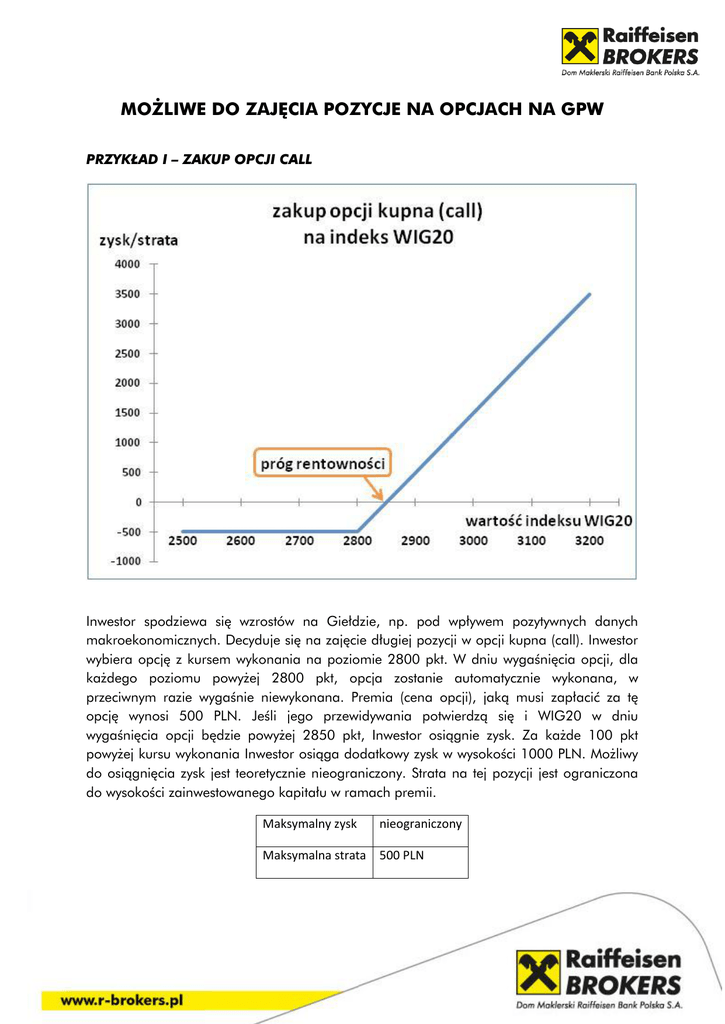 MOŻLIWE DO ZAJĘCIA POZYCJE NA OPCJACH NA GPW PRZYKŁAD I – ZAKUP OPCJI CALL Inwestor spodziewa się wzrostów na Giełdzie, np. pod wpływem pozytywnych danych makroekonomicznych. Decyduje się na zajęcie długiej pozycji w opcji kupna (call). Inwestor wybiera opcję z kursem wykonania na poziomie 2800 pkt. W dniu wygaśnięcia opcji, dla każdego poziomu powyżej 2800 pkt, opcja zostanie automatycznie wykonana, w przeciwnym razie wygaśnie niewykonana. Premia (cena opcji), jaką musi zapłacić za tę opcję wynosi 500 PLN. Jeśli jego przewidywania potwierdzą się i WIG20 w dniu wygaśnięcia opcji będzie powyżej 2850 pkt, Inwestor osiągnie zysk. Za każde 100 pkt powyżej kursu wykonania Inwestor osiąga dodatkowy zysk w wysokości 1000 PLN. Możliwy do osiągnięcia zysk jest teoretycznie nieograniczony. Strata na tej pozycji jest ograniczona do wysokości zainwestowanego kapitału w ramach premii. Maksymalny zysk nieograniczony Maksymalna strata 500 PLN PRZYKŁAD II – SPRZEDAŻ OPCJI CALL Inwestor decydujący się na powyższą strategię przewiduje, że wartość indeksu WIG20 pozostanie stabilna lub obniży się. W zamian za wystawienie opcji otrzymuje premię opcyjną w wysokości 500 PLN. Ponadto jest zobowiązany do wniesienia depozytu zabezpieczającego w wysokości ustalanej przez KDPW. Otrzymana premia wspomaga zasilenie depozytu. Aktualny arkusz do obliczenia depozytu zabezpieczającego można pobrać ze strony KDPW. Progiem rentowności jest tu podobnie jak w przykładzie I poziom 2850 pkt. Wystawienie opcji jest bardziej ryzykowne niż jej zakup, ponieważ możliwe straty są nieograniczone, maksymalny do osiągnięcia zysk jest ograniczony do wysokości otrzymanej premii opcyjnej. Maksymalny zysk 500 PLN Maksymalna strata nieograniczona PRZYKŁAD III – ZAKUP OPCJI PUT Inwestor wybierze długą pozycję w opcji sprzedaży tzn. kupuje opcję put, gdy przewiduje, że na giełdzie będą dominowały spadki. Kurs wykonania opcji ustalony jest na poziomie 2900 pkt. Progiem rentowności opcji jest poziom 2850 pkt. Choć w praktyce spadek indeksu do zera jest trudny do wyobrażenia, to jednak ten poziom wyznacza maksymalny zysk Inwestora. Jak obliczyć maksymalny zysk? Maksymalny zysk = (kurs wykonania x mnożnik) – premia Maksymalny zysk = (2900 x 10) – 500 = 28500 Maksymalny zysk 28500 PLN Maksymalna strata 500 PLN PRZYKŁAD IV – SPRZEDAŻ OPCJI PUT Ostatnią z możliwych do zajęcia pozycji jest wystawienie opcji sprzedaży, czyli sprzedaż opcji put. Jest przeznaczona dla Inwestorów, którzy spodziewają się wzrostu indeksu WIG20. Kurs wykonania jest ustalony na poziomie 2900 pkt. Podobnie jak w poprzednich przykładach, również w tej pozycji otrzymana premia będzie wynosiła 500 PLN, co zmniejszy wysokość wymaganego depozytu zabezpieczającego do KDPW; próg rentowności wynosi 2850 pkt. Jak obliczyć maksymalną stratę? Maksymalny strata = (kurs wykonania x mnożnik) – premia Maksymalny strata = (2900 x 10) – 500 = 28500 Maksymalny zysk 500 PLN Maksymalna strata 28500 PLN
