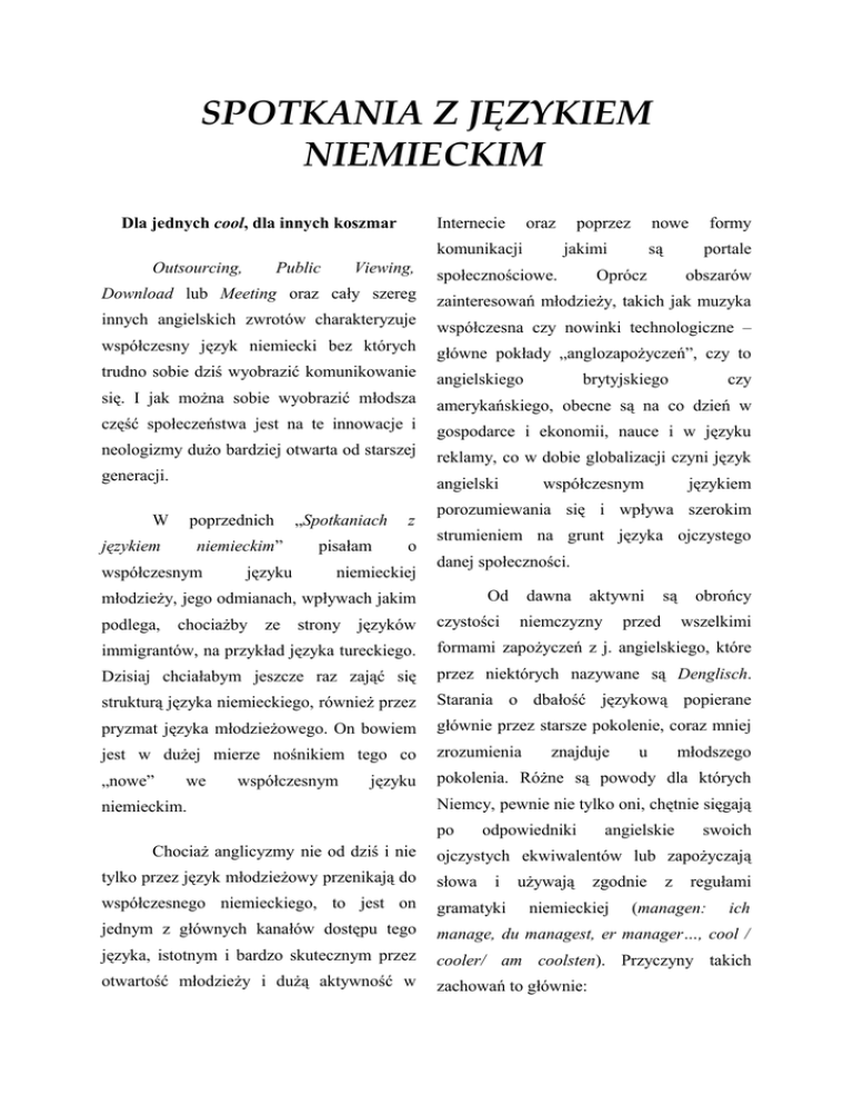 SPOTKANIA Z JĘZYKIEM NIEMIECKIM Dla jednych cool, dla innych koszmar Internecie oraz komunikacji Outsourcing, Public Viewing, poprzez nowe jakimi społecznościowe. są formy portale Oprócz obszarów Download lub Meeting oraz cały szereg zainteresowań młodzieży, takich jak muzyka innych angielskich zwrotów charakteryzuje współczesna czy nowinki technologiczne – współczesny język niemiecki bez których główne pokłady „anglozapożyczeń”, czy to trudno sobie dziś wyobrazić komunikowanie angielskiego się. I jak można sobie wyobrazić młodsza amerykańskiego, obecne są na co dzień w część społeczeństwa jest na te innowacje i gospodarce i ekonomii, nauce i w języku neologizmy dużo bardziej otwarta od starszej reklamy, co w dobie globalizacji czyni język generacji. angielski W poprzednich językiem niemieckim” współczesnym języku „Spotkaniach z pisałam o niemieckiej chociażby ze strony języków czy współczesnym językiem porozumiewania się i wpływa szerokim strumieniem na grunt języka ojczystego danej społeczności. Od młodzieży, jego odmianach, wpływach jakim podlega, brytyjskiego czystości dawna aktywni niemczyzny są przed obrońcy wszelkimi immigrantów, na przykład języka tureckiego. formami zapożyczeń z j. angielskiego, które Dzisiaj chciałabym jeszcze raz zająć się przez niektórych nazywane są Denglisch. strukturą języka niemieckiego, również przez Starania o dbałość językową popierane pryzmat języka młodzieżowego. On bowiem głównie przez starsze pokolenie, coraz mniej jest w dużej mierze nośnikiem tego co zrozumienia „nowe” pokolenia. Różne są powody dla których we współczesnym języku niemieckim. u młodszego Niemcy, pewnie nie tylko oni, chętnie sięgają po Chociaż anglicyzmy nie od dziś i nie znajduje odpowiedniki angielskie swoich ojczystych ekwiwalentów lub zapożyczają tylko przez język młodzieżowy przenikają do słowa współczesnego niemieckiego, to jest on gramatyki jednym z głównych kanałów dostępu tego manage, du managest, er manager…, cool / języka, istotnym i bardzo skutecznym przez cooler/ am coolsten). Przyczyny takich otwartość młodzieży i dużą aktywność w zachowań to głównie: i używają zgodnie niemieckiej z regułami (managen: ich - ekonomia językowa (szybko, szybko…) – Assessment-Center = Ausbildungs-, angielskie jednosylabowce: Trend, Kick, Prüf– oder Testcenter. Trip, Flop, Trick, Pop, Stop, Tip - inna forma ekspresji i wypowiedzenia się Folder = Faltbroschüre, Prospekt. („moda”) Launch = Start, Markteinführung - potrzeba użycia eufemizmu i obejścia tabu von Produkten. (nie nazwać sprawy po imieniu), np.: Teenager zamiast Backfisch Merchandising = Vermarkten von Produkten. - chęć zaistnienie w grupie, odróżniania się, Non-profit = Nicht auf Gewinn autonomiczność danej społeczności Najczęstsze trzech części zapożyczenia mowy: przymiotników i dotyczą rzeczowników, czasowników (story, abzielend. Outsourcing = Auslagerung von Betriebsfunktionen. feedback, clean, after shave, background, cash, date, fun, freecall, joke, kid, level, shop). Ponadto używane są Work-Out = Training angielskie wykrzykniki i partykuły (wow, well, shit, das Blaue vom Himmel versprechen anyway,), formy powitania i pożegnania ( hi, bye, hey, yoh, peace), popularne formułki i wyrażenia sloganowe (Good Staff, No Joke! = jm. ohne Hemmungen Unmögliches So what? Here we are!). W języku versprechen potocznym można zaobserwować wplatanie obiecywać gwiazdkę z nieba wyrażeń angielskich w tekst niemiecki, np.: „I don`t care, ob`s regnet oder nicht“, Der neue Chef hat das Blaue vom Himmel „Nicht schlecht, but not good enough“. Wszechobecny jest angielski ze swoimi określeniami w języku gospodarki i versprochen. Nowy szef obiecywał gwiazdkę z nieba. ekonomii: Accessibility = Verfügbarkeit bzw. Zugänglichkeit. Edyta Bielecka