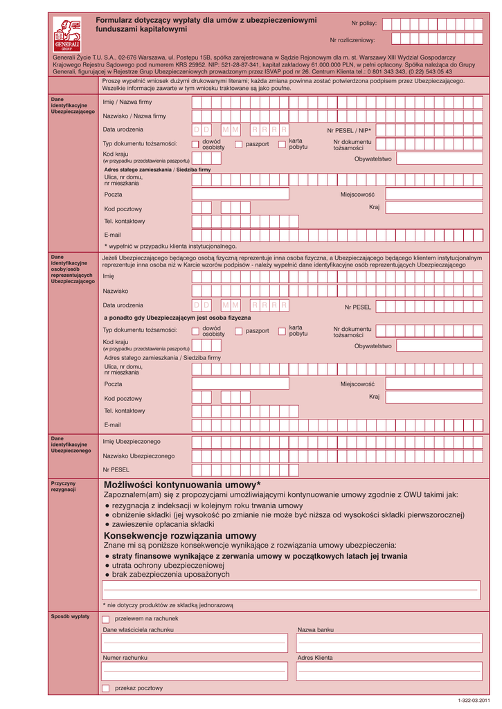 Formularz dotyczàcy wyp∏aty dla umów z ubezpieczeniowymi funduszami kapita∏owymi Nr polisy: Nr rozliczeniowy: Generali ˚ycie T.U. S.A., 02-676 Warszawa, ul. Post´pu 15B, spó∏ka zarejestrowana w Sàdzie Rejonowym dla m. st. Warszawy XIII Wydzia∏ Gospodarczy Krajowego Rejestru Sàdowego pod numerem KRS 25952. NIP: 521-28-87-341, kapita∏ zak∏adowy 61.000.000 PLN, w pe∏ni op∏acony. Spółka nale˝àca do Grupy Generali, figurujàcej w Rejestrze Grup Ubezpieczeniowych prowadzonym przez ISVAP pod nr 26. Centrum Klienta tel.: 0 801 343 343, (0 22) 543 05 43 Prosz´ wype∏niç wniosek du˝ymi drukowanymi literami; ka˝da zmiana powinna zostaç potwierdzona podpisem przez Ubezpieczajàcego. Wszelkie informacje zawarte w tym wniosku traktowane sà jako poufne. Dane identyfikacyjne Ubezpieczajàcego Imi´ / Nazwa firmy Nazwisko / Nazwa firmy Data urodzenia Typ dokumentu to˝samoÊci: D D M M dowód osobisty R R R R paszport Nr PESEL / NIP* karta pobytu Nr dokumentu to˝samoÊci Kod kraju Obywatelstwo (w przypadku przedstawienia paszportu) Adres sta∏ego zamieszkania / Siedziba firmy Ulica, nr domu, nr mieszkania Poczta MiejscowoÊç Kraj Kod pocztowy Tel. kontaktowy E-mail * wype∏niç w przypadku klienta instytucjonalnego. Dane identyfikacyjne osoby/osób reprezentujàcych Ubezpieczajàcego Je˝eli Ubezpieczajàcego b´dàcego osobà fizycznà reprezentuje inna osoba fizyczna, a Ubezpieczajàcego b´dàcego klientem instytucjonalnym reprezentuje inna osoba ni˝ w Karcie wzorów podpisów - nale˝y wypełniç dane identyfikacyjne osób reprezentujàcych Ubezpieczajàcego Imi´ Nazwisko Data urodzenia D D M M R R R R Nr PESEL a ponadto gdy Ubezpieczajàcym jest osoba fizyczna Typ dokumentu to˝samoÊci: dowód osobisty paszport karta pobytu Nr dokumentu to˝samoÊci Kod kraju Obywatelstwo (w przypadku przedstawienia paszportu) Adres sta∏ego zamieszkania / Siedziba firmy Ulica, nr domu, nr mieszkania Poczta MiejscowoÊç Kraj Kod pocztowy Tel. kontaktowy E-mail Dane identyfikacyjne Ubezpieczonego Imi´ Ubezpieczonego Nazwisko Ubezpieczonego Nr PESEL Przyczyny rezygnacji Mo˝liwoÊci kontynuowania umowy* Zapozna∏em(am) si´ z propozycjami umo˝liwiajàcymi kontynuowanie umowy zgodnie z OWU takimi jak: • rezygnacja z indeksacji w kolejnym roku trwania umowy • obni˝enie sk∏adki (jej wysokoÊç po zmianie nie mo˝e byç ni˝sza od wysokoÊci sk∏adki pierwszorocznej) • zawieszenie op∏acania sk∏adki Konsekwencje rozwiàzania umowy Znane mi sà poni˝sze konsekwencje wynikajàce z rozwiàzania umowy ubezpieczenia: • straty finansowe wynikajàce z zerwania umowy w poczàtkowych latach jej trwania • utrata ochrony ubezpieczeniowej • brak zabezpieczenia uposa˝onych * nie dotyczy produktów ze sk∏adkà jednorazowà Sposób wyp∏aty przelewem na rachunek Dane w∏aÊciciela rachunku Nazwa banku Numer rachunku Adres Klienta przekaz pocztowy 1-322-03.2011 Szczegó∏y dotyczàce wyp∏aty ca∏kowita wyp∏ata wartoÊci polisy ca∏kowita wyp∏ata wartoÊci dodatkowej cz´Êciowa wyp∏ata wartoÊci polisy* cz´Êciowa wyp∏ata wartoÊci dodatkowej** Prosz´ podaç wysokoÊç wyp∏aty z poszczególnych funduszy. WysokoÊç wyp∏aty nale˝y okreÊliç jako procent wyp∏acanych jednostek inwestycyjnych z danego funduszu lub wartoÊç kwotowà w z∏otych. Fundusze: Portfele modelowe polskie: UFK Generali (P_APEF) UFK Generali (P_BF) UFK Generali (P_MMF) UFK Generali (P_GF) Portfel Polski Akcyjny (P_A_POL) Portfel Polski Zrównowa˝ony (P_Z_POL) Portfel Polski Specjalistyczny (P_AMF) Agresywny Plus Mieszany Plus Obligacji Plus Gwarantowany Plus Fundusze zewn´trzne polskie: UFK Generali – Alior Selektywny (G_A_S) UFK Generali – Alior Short Equity (G_A_SE) UFK Generali – Arka BZ WBK Akcji (G_BZ_A) UFK Generali – Arka BZ WBK Zrównowa˝ony (G_BZ_Z) UFK Generali – Arka BZ WBK Obligacji (G_BZ_O) UFK Generali – Legg Mason Akcji (G_LEEG_A) UFK Generali – Legg Mason Zrównowa˝ony Ârodkowoeuropejski (G_LEGG_ZÂE) UFK Generali – Legg Mason Pieni´˝ny (G_LEGG_RP) UFK Generali – Skarbiec Akcja (G_SBC_A) UFK Generali – ING Akcji (G_ING_A) UFK Generali – Novo Akcji (G_SEB_A) UFK Generali – Novo Stabilnego Wzrostu (G_SEB_SW) UFK Generali – Novo Obligacji Przedsi´biorstw (G_SEB_O) UFK Generali – Investor Akcji Du˝ych Spó∏ek (G_DWS_A) UFK Generali – Investor Obligacji (G_DWS_DP) UFK Generali – Investor P∏ynna Lokata (G_DWS_LOK) UFK Generali – Noble Akcji (G_NOB_A) UFK Generali – Noble Mieszany (G_NOB_M) UFK Generali – UniKorona Akcji (G_UNIK_A) Portfele modelowe zagraniczne: Portfel Zagraniczny NieruchomoÊci (P_N_MNR) Portfel Zagraniczny “Cztery strony Êwiata” Akcyjny (P_A_MNR) Portfel Zagraniczny Surowcowy (P_S_MNR) Fundusze zewn´trzne zagraniczne: UFK Generali – BlackRock New Energy Fund (G_BR_EN) (EUR) UFK Generali – BlackRock World Gold Fund (G_BR_WG) (EUR) UFK Generali – BlackRock Asian Dragon Fund (G_BR_AD) (EUR) UFK Generali – Templeton Global Total Return Fund (G_TEMP_TR) (USD) UFK Generali – Templeton Latin America Fund (G_TEMP_LA) (USD) UFK Generali – Franklin India Fund (G_FRAN_I) (USD) UFK Generali – Franklin MENA Fund (G_FP_MENA) (EUR) UFK Generali – HSBC Global Emerging Markets Equity (G_HSBC_EMM) (USD) UFK Generali – HSBC BRIC Markets Equity (G_HSBC_BRIC) (USD) UFK Generali – HSBC Asia ex Japan Equity Smaller Companies (G_HSBC_AJS) (USD) UFK Generali – JPMorgan Pacific Equity Fund (G_JPM_PE) (USD) UFK Generali – JPMorgan US Dynamic Fund (G_JPM_US) (USD) UFK Generali – BNP Paribas L1 Equity Turkey (G_FOR_ETUR) (EUR) UFK Generali – BNP Paribas L1 OBAM Equity World(G_FOR_OBAM) (EUR) UFK Generali – East Capital Eastern European Fund (G_ECAP_EE) (EUR) UFK Generali – Schroder AS Commodity Fund (G_SCH_AS) (EUR) UFK Generali – Schroder ISF Greater China (G_SCH_ISF) (USD) UFK Generali – Schroder US Small&Mid-Cap Equity A1 Hedged (G_SCH_SMC) (EUR). * Przy wyp∏acie cz´Êciowej wa