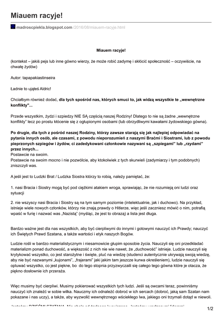 Miauem racyje! madroscpiekla.blogspot.com /2016/08/miauem-racyje.html Miauem racyje! (kontekst – jakiś pejs lub inne gówno wierzy, że może robić zadymę i skłócić społeczność – oczywiście, na chwałę żydów) Autor: tapapakiastinseira Ładnie to ująłeś Aldric! Chciałbym również dodać, dla tych spośród nas, których smuci to, jak widzą wszystkie te „wewnętrzne konflikty"... Przede wszystkim, żydzi i szpiedzy NIE SĄ częścią naszej Rodziny! Dlatego to nie są żadne „wewnętrzne konflikty” lecz po prostu kłócenie się z ogłupionymi osobami (lub obrzydliwymi kawałami żydowskiego gówna). Po drugie, dla tych z pośród naszej Rodziny, którzy zawsze starają się jak najlepiej odpowiadać na pytania innych osób, ale czasami, z powodu nieporozumień z naszymi Braćmi i Siostrami, lub z powodu pieprzonych szpiegów i żydów, ci zadedykowani członkowie nazywani są „szpiegami” lub „rzydami” przez innych... Postawcie na swoim. Postawcie na swoim mocno i nie pozwólcie, aby ktokolwiek z tych skurwieli (zadymiarzy i tym podobnych) zniszczyli was. A jeśli jest to Ludzki Brat / Ludzka Siostra którzy to robią, należy pamiętać, że: 1. nasi Bracia i Siostry mogą być pod ciężkimi atakiem wroga, sprawiając, że nie rozumieją oni ludzi oraz sytuacji 2. nie wszyscy nasi Bracia i Siostry są na tym samym poziomie (intelektualnie, jak i duchowo). Na przykład, istnieje wiele nowych członków, którzy nie znają prawdy o Hitlerze, więc jeśli zaczniesz mówić o nim, potrafią wpaść w furię i nazwać was „Nazistą” (myśląc, że jest to obrazą) a lista jest długa. Bardzo ważne jest dla nas wszystkich, aby być cierpliwymi do innymi i gotowymi nauczyć ich Prawdy; nauczyć ich Świętych Prawd Szatana, a także wartości i etyk naszych Bogów. Ludzie rośli w bardzo materialistycznym i niesamowicie głupim sposobie życia. Nauczyli się oni przedkładać materializm ponad duchowość, a większość z nich nie wie nawet, że „duchowość” istnieje. Ludzie nauczyli się krytykować wszystko, co jest starożytne i święte, pluć na wiedzę (studenci autentycznie ukrywają swoją wiedzę, aby nie być nazwanymi „kujonami”, „frajerami” jaki jakim tam jeszcze kurwa określeniem), ludzie nauczyli się opluwać wszystko, co jest piękne, bo do tego stopnia przyzwyczaili się całego tego gówna które je otacza, że piękno dosłownie ich przeraża. Więc musimy być cierpliwi. Musimy pokierować wszystkich tych ludzi. Jeśli są owcami teraz, powinniśmy nauczyć ich znaleźć w sobie wilka. Nauczmy ich odnaleźć dobroć w ich sercach (dobroć, jaką sam Szatan nam pokazane i nas uczy), a także, aby wyzwolić wewnętrznego wściekłego lwa, jakiego oni trzymali dotąd w niewoli. Jesteśmy DZIEĆMI SZATANA. Nie obelg od żadnego kurwiszona. Jesteśmy urodzonymi liderami, 1/2 Jesteśmy DZIEĆMI SZATANA. Nie obelg od żadnego kurwiszona. Jesteśmy urodzonymi liderami, nauczycielami, artystami, naukowcami, wszystkim pięknym, co Szatan i Bogowie uczyli nas tak wiele lat temu. Stworzymy świat na nowo. Wróg upada (SZYBKO), a wraz z nim cała brzydota jaką otoczył nasz świat. Jedyne, co musimy zrobić, to wytrwać, być mocni ramię przy ramieniu, uczyć innych, tworząc Satanistyczną społeczność oraz Rodzinę, jaką zawsze powinniśmy być, i dumnie wykrzykiwać, dopóki nie zobaczymy każdego wroga jak pluje krwią i zdycha na ziemi: SŁAWA SZATAN! 2/2