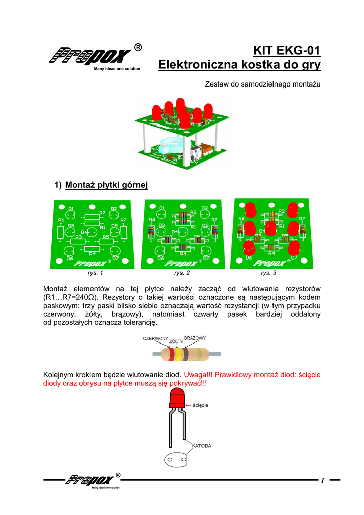KIT EKG-01 Elektroniczna kostka do gry Zestaw do samodzielnego montaŜu 1) MontaŜ płytki górnej rys. 1 rys. 2 rys. 3 MontaŜ elementów na tej płytce naleŜy zacząć od wlutowania rezystorów (R1…R7=240Ω). Rezystory o takiej wartości oznaczone są następującym kodem paskowym: trzy paski blisko siebie oznaczają wartość rezystancji (w tym przypadku czerwony, Ŝółty, brązowy), natomiast czwarty pasek bardziej oddalony od pozostałych oznacza tolerancję. Kolejnym krokiem będzie wlutowanie diod. Uwaga!!! Prawidłowy montaŜ diod: ścięcie diody oraz obrysu na płytce muszą się pokrywać!!! 1 2) MontaŜ płytki dolnej rys. 4 rys. 5 rys. 6 MontaŜ płyty dolnej rozpoczynamy podobnie jak poprzednio lutując w pierwszej kolejności rezystory R8 i R9 o wartości 10kΩ. Rezystory o takiej wartości oznaczone są następującym kodem paskowym: brązowy, czarny, pomarańczowy. Kolejnym krokiem będzie wlutowanie układu scalonego U1. Uwaga!!! NaleŜy zwrócić uwagę na jego prawidłowy montaŜ!!! PIN1 oznaczony jest kropką!!! Patrz rysunek 6!!! rys. 7 rys. 8 rys. 9 Następnie naleŜy wlutować podstawkę pod baterię (BT1) oraz przycisk (S1). Ostatnim etapem będzie montaŜ metalowych tulejek dystansowych i skręcenie obu płytek ze sobą. Tulejki wykonano z metalu z uwagi na fakt, Ŝe stanowią połączenie sygnałów między płytkami. Prawidłowo zmontowany układ działa od razu i powinien wyglądać tak jak na rysunku poniŜej. 2 3) Opis układu i schemat ideowy Urządzenie to słuŜy do losowania liczb z określonego przedziału (1 - 6). MoŜe ono zastąpić zwykłą kostkę do gry. Wciśnięcie i przytrzymanie przycisku powoduje miganie wszystkich diod (pozwala to sprawdzić m.in. prawidłowość montaŜu oraz działania diod), natomiast po jego puszczeniu następuje wylosowanie liczby i jej wyświetlenie. Liczba ta wyświetlana jest przez ok. 8 sekund, po czym następuje przejście układu w tryb oszczędzania energii. Zaletą opisywanej kostki jest prosta konstrukcja oraz bardzo mały pobór energii ze źródła zasilania. Główne cechy układu • Sygnalizacja liczby oczek za pomocą diod LED • Sterowanie za pomocą 1 przycisku • Atrakcyjny kształt (forma) • Zasilanie bateryjne (3V) • Tryb oszczędzania energii (automatyczny wyłącznik zasilania) • Wymiary 36x36x32 mm • W zestawie płytka drukowana, komplet elementów (w tym zaprogramowany mikrokontroler), dokumentacja Schemat ideowy 3 Płytki drukowane Strona elementów: Strona lutowania: Wykaz elementów zestawu U1…………...ATTINY13-20PU S1…………...Przycisk impulsowy kątowy R1-R7……….240R, 0.25W R8-R9……….10k, 0.25W D1-D7………..LED czerwone 5mm BT1……….Bateria 3V CR2032 Podstawka pod baterię CR2032 Tuleje dystansowe (30mm,M3) Śrubki M3 Płytki drukowane 4
