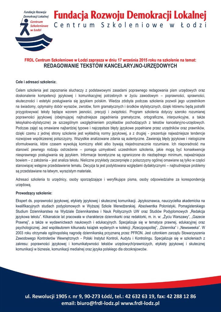 FRDL Centrum Szkoleniowe w Łodzi zaprasza w dniu 17 września 2015 roku na szkolenie na temat: REDAGOWANIE TEKSTÓW KANCELARYJNO-URZĘDOWYCH Cele i adresaci szkolenia:. Celem szkolenia jest zapoznanie słuchaczy z podstawowymi zasadami poprawnego redagowania pism urzędowych oraz doskonalenie kompetencji językowej i komunikacyjnej potrzebnych w życiu zawodowym – poprawności, sprawności, skuteczności i estetyki posługiwania się językiem polskim. Wiedza zdobyta podczas szkolenia pozwoli jego uczestnikom na świadomy, optymalny dobór wyrazów, zwrotów, form gramatycznych i środków stylistycznych, dzięki któremu będą potrafili przygotowywać teksty będące wzorem jasności, precyzji i zwięzłości. Program szkolenia dotyczy szeroko rozumianej poprawności językowej (obejmującej najtrudniejsze zagadnienia gramatyczne, ortograficzne, interpunkcyjne, a także leksykalno-stylistyczne) ze szczególnym uwzględnieniem przykładów pochodzących z tekstów kancelaryjno-urzędowych. Podczas zajęć są omawiane najbardziej typowe i najczęstsze błędy językowe popełniane przez urzędników oraz prawników, dzięki czemu z jednej strony szkolenie jest wykładnią normy językowej, a z drugiej - prezentuje najważniejsze tendencje rozwojowe współczesnej polszczyzny. Wszystkie analizowane zdania są autentyczne. Zawierają błędy językowe i nielogiczne sformułowania, które czasem wywołują komiczny efekt albo bywają niejednoznacznie rozumiane. Ich nieporadność ma stanowić pewnego rodzaju ostrzeżenie – pomaga uzmysłowić uczestnikom szkolenia, jakie mogą być konsekwencje niesprawnego posługiwania się językiem. Informacje teoretyczne są ograniczone do niezbędnego minimum, najważniejsza bowiem – z założenia – jest analiza tekstu. Nieliczne przykłady zaczerpnięte z polszczyzny ogólnej omawiane są tylko w części stanowiącej wstępne przedstawienie tematu. Decyzja ta jest podyktowana względami dydaktycznymi – najtrudniejsze problemy są przedstawiane na łatwym, wyrazistym materiale. Adresaci szkolenia to urzędnicy, osoby sporządzające i weryfikujące pisma, osoby odpowiedzialne za korespondencję urzędową. Prowadzący szkolenie: Ekspert ds. poprawności językowej, etykiety językowej i skutecznej komunikacji. Językoznawca, nauczycielka akademicka na kwalifikacyjnych studiach podyplomowych w Wyższej Szkole Menedżerskiej. Absolwentka Polonistyki, Pomagisterskiego Studium Dziennikarstwa na Wydziale Dziennikarstwa i Nauk Politycznych UW oraz Studiów Podyplomowych „Redakcja językowa tekstu”. Kilkanaście lat pracowała w charakterze dziennikarki oraz redaktorki, m. in. w: „Życiu Warszawy”, „Gazecie Prawnej”, a także w wydawnictwach naukowych i edukacyjnych. Specjalizuje się w tematyce prawnej, edukacyjnej oraz psychologicznej. Jest współautorem kilkunastu książek wydanych w kolekcji „Rzeczpospolitej”, „Dziennika” i „Newsweeka”. W 2003 roku otrzymała ogólnopolską nagrodę dziennikarską przyznaną przez PFRON. Jest członkiem zarządu Stowarzyszenia Zawodowego Kontrolerów Wewnętrznych - Polski Instytut Kontroli, Audytu i Kontrolingu. Specjalizuje się w szkoleniach z zakresu: poprawności językowej i komunikatywności tekstów urzędowych/prawniczych, etykiety językowej i skutecznej komunikacji w biznesie, komunikacji medialnej oraz języka polskiego dla obcokrajowców. ul. Rewolucji 1905 r. nr 9, 90-273 Łódź, tel.: 42 632 63 19, fax: 42 288 12 86 email: [email protected] www.frdl-lodz.pl Program szkolenia: Moduł 1. – Poprawność gramatyczna oraz ortograficzno-interpunkcyjna. 1. Wprowadzenie. Zapoznanie z podstawowymi elementami wzorcowego tekstu urzędowego. 2. Ortografia (użycie wielkich i małych liter, pisownia łączna i rozdzielna, pisownia partykuły przeczącej nie, pisownia cząstki by z różnymi częściami mowy) i interpunkcja, najnowsze zmiany w zakresie ortografii – minidyktando urzędowe. 3. Odmiana wyrazów kłopotliwych (m. in. odmiana nazwisk i nazw miejscowości). 4. Składnia – związek zgody, związek rządu, zasady używania wyrazów funkcyjnych, szyk wyrazów w zdaniu, użycie imiesłowowych równoważników zdań. 5. Kompozycja zdania złożonego – głównie zasady porządkowania treści, skróty składniowe. 6. Skróty i skrótowce w zdaniu – skrótowce naruszające normę, różnica między skrótem a skrótowcem. Moduł 2. – poprawność leksykalno-stylistyczna. 1. Dobór wyrazów i związków frazeologicznych – zgodność ze znaczeniem, zharmonizowanie z kontekstem, wieloznaczność, użycie synonimów, łączliwość. 2. Ekonomiczność treściowa, szablon językowy, wyrazy nadużywane. 3. Styl tekstów urzędowych – cechy stylu komunikatywnego, styl „ciężki”, struktury opisowe i rozwlekłe, nieuzasadniona podniosłość, nieuzasadniona potoczność. 4. Spójność i kompozycja tekstu. 5. Środki stylistyczne w tekstach użytkowych. 6. Najnowsze polskie słownictwo (m. in. zapożyczenia, wyrazy „modne”). Moduł 3. – etykieta językowa 1. Korespondencja oficjalna (maile, pisma formalne) – struktura, formuły rozpoczynające i kończące (drukowane bądź odręczne). 2. Tytulatura – sposoby zwracania się w mowie i w piśmie do osób pełniących różnego typu funkcje publiczne. 3. Sytuacje problemowe – jak zachować się w przykładowych sytuacjach, które ze względów etykietalnych mogą sprawić nam problem. . ul. Rewolucji 1905 r. nr 9, 90-273 Łódź, tel.: 42 632 63 19, fax: 42 288 12 86 email: [email protected] www.frdl-lodz.pl Informacje organizacyjne i warunki zgłoszeń: Szkolenie odbędzie się w siedzibie FRDL Centrum Szkoleniowego w Łodzi, ul. Rewolucji 1905 roku nr 9, II PIĘTRO (DOMOFON NR 36) 17 września 2015 r. w godzinach 10.00 – 15.00. Cena szkolenia wynosi 290 zł netto przy zgłoszeniu do 7 września. Cena po 7 września wynosi 319 zł netto. RABAT 10% dla drugiej i następnej osoby z tej samej instytucji. Zw