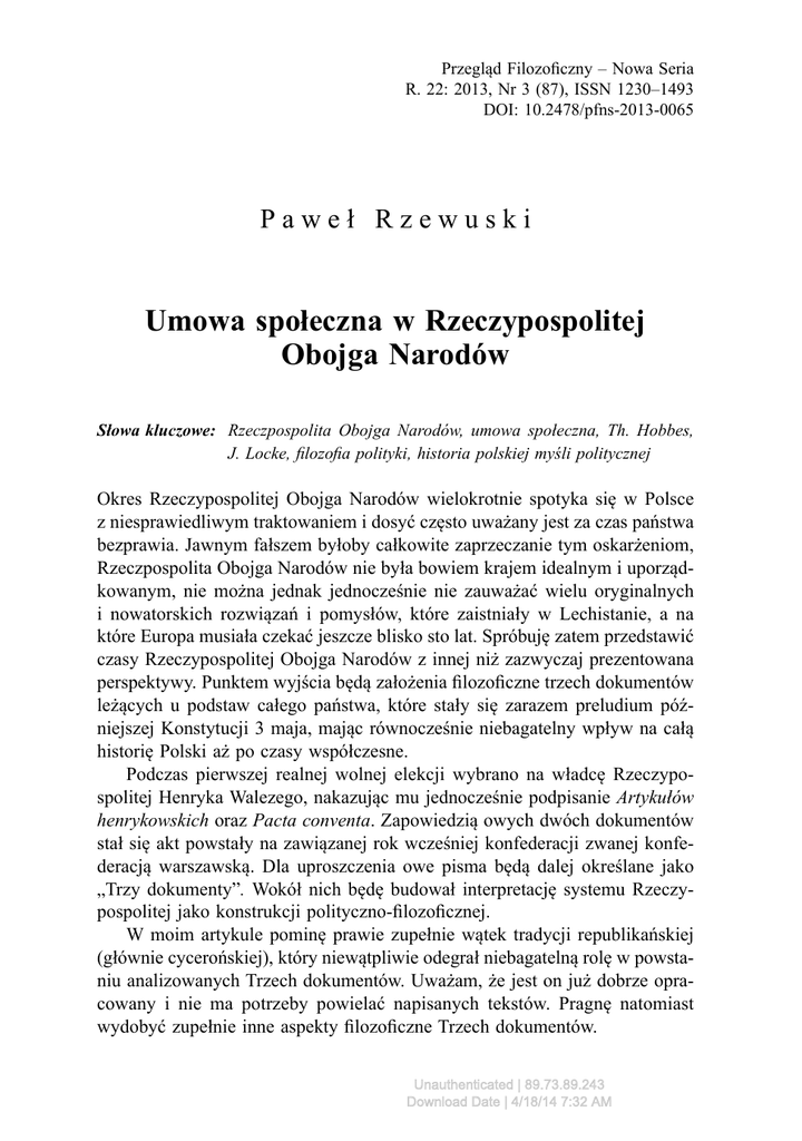 Przegląd Filozoficzny – Nowa Seria R. 22: 2013, Nr 3 (87), ISSN 1230–1493 DOI: 10.2478/pfns-2013-0065 Paweł Rzewuski Umowa społeczna w Rzeczypospolitej Obojga Narodów Słowa kluczowe: Rzeczpospolita Obojga Narodów, umowa społeczna, Th. Hobbes, J. Locke, filozofia polityki, historia polskiej myśli politycznej Okres Rzeczypospolitej Obojga Narodów wielokrotnie spotyka się w Polsce z niesprawiedliwym traktowaniem i dosyć często uważany jest za czas państwa bezprawia. Jawnym fałszem byłoby całkowite zaprzeczanie tym oskarżeniom, Rzeczpospolita Obojga Narodów nie była bowiem krajem idealnym i uporządkowanym, nie można jednak jednocześnie nie zauważać wielu oryginalnych i nowatorskich rozwiązań i pomysłów, które zaistniały w Lechistanie, a na które Europa musiała czekać jeszcze blisko sto lat. Spróbuję zatem przedstawić czasy Rzeczypospolitej Obojga Narodów z innej niż zazwyczaj prezentowana perspektywy. Punktem wyjścia będą założenia filozoficzne trzech dokumentów leżących u podstaw całego państwa, które stały się zarazem preludium późniejszej Konstytucji 3 maja, mając równocześnie niebagatelny wpływ na całą historię Polski aż po czasy współczesne. Podczas pierwszej realnej wolnej elekcji wybrano na władcę Rzeczypospolitej Henryka Walezego, nakazując mu jednocześnie podpisanie Artykułów henrykowskich oraz Pacta conventa. Zapowiedzią owych dwóch dokumentów stał się akt powstały na zawiązanej rok wcześniej konfederacji zwanej konfederacją warszawską. Dla uproszczenia owe pisma będą dalej określane jako „Trzy dokumenty”. Wokół nich będę budował interpretację systemu Rzeczypospolitej jako konstrukcji polityczno-filozoficznej. W moim artykule pominę prawie zupełnie wątek tradycji republikańskiej (głównie cycerońskiej), który niewątpliwie odegrał niebagatelną rolę w powstaniu analizowanych Trzech dokumentów. Uważam, że jest on już dobrze opracowany i nie ma potrzeby powielać napisanych tekstów. Pragnę natomiast wydobyć zupełnie inne aspekty filozoficzne Trzech dokumentów. Unauthenticated | 89.73.89.243 Download Date | 4/18/14 7:32 AM 28 Paweł Rzewuski Postaram się udowodnić, że umowa społeczna, zawarta między szlachtą polską i litewską a królem elekcyjnym podczas pierwszej wolnej elekcji, była w stosunku do napisanego 78 lat później dzieła Thomasa Hobbesa Lewiatan, czyli materia, forma i władza państwa kościelnego i świeckiego (1651) koncepcją nowatorską i postępową, równocześnie zaznaczając, że pierwszym dziełem, którego założenia można by uznać za zbliżone do założeń Trzech dokumentów, są dopiero Dwa traktaty o rządzie Johna Locke’a z roku 1690. Czas Rzeczypospolitej Obojga Narodów nie był okresem, który można lekkomyślnie nazywać czasem anarchii i powszechnego nierządu. Pomimo chaosu panującego na „statku Sarmatia” okres ten wolno uważać za jeden z najpiękniejszych w całej historii Polski z racji jego bogactwa i nowatorstwa intelektualnego. Części czytelników może wydać się dziwne, że chcę porównywać dzieła o charakterze czysto teoretycznym, jakimi są pisma Hobbesa i Locke’a, z tekstami, które miały wymiar praktyczny, czyli Trzema dokumentami. Na podjęcie takiej decyzji wpłynęły dwa fakty. Po pierwsze, wszystkie owe dokumenty łączy bogactwo założeń filozoficznych – zarówno w pismach teoretycznych dwóch angielskich myślicieli, jak i w Trzech dokumentach odnaleźć można niezwykłe bogactwo na poziomie założeń ontologicznych, czego próżno szukać na przykład w angielskiej Magna Charta Libertatum z 1251 r. czy nawet w innych dokumentach z czasów Rzeczypospolitej Obojga Narodów. Po drugie, dają się zauważyć wyraźne rozbieżności między teorią zapisaną w Trzech dokumentach a praktyką życia politycznego w Rzeczypospolitej Obojga Narodów. Trzy dokumenty, czyli Konfederacja warszawska, Artykuły henrykowskie i Pacta conventa, leżą u podłoża myśli politycznej Rzeczypospolitej Obojga Narodów i mogą być źródłem namysłu o charakterze filozoficznym nad całą formacją kulturową, jaką był sarmatyzm. W szczególności istotną rolę odgrywa tutaj problematyka umowy społecznej, znana z pism siedemnastowiecznych filozofów. W przeciwieństwie jednak do Lewiatana Hobbesa oraz traktatów Johna Locke’a Trzy dokumenty są pismami politycznymi o charakterze konstytucyjnym, których postanowienia zostały wcielone w życie, a co za tym idzie, stanowiły prawo. Inaczej niż w klasycznych teoriach umowy społecznej, były one nie tylko traktatami o charakterze teoretycznym, ale także dokumentami państwowymi, stanowiącymi o prawie Rzeczypospolitej. Zarówno Lewiatan (który mógł inspirować Cromwella), jak i traktaty Locke’a (niezwykle ważne m.in. przy tworzeniu konstytucji amerykańskiej) nigdy nie stały się osobnymi dokumentami państwowymi – Trzy dokumenty natomiast nimi były. Rzeczpospolita Obojga Narodów, państwo powstałe na mocy Unii Lubelskiej, pozornie nie wydawała się ewenementem w szesnastowiecznej Europie. Do czasów pierwszej wolnej elekcji nic nie wskazywało na jej niezwykłość Unauthenticated | 89.73.89.243 Download Date | 4/18/14 7:32 AM Umowa społeczna w Rzeczypospolitej Obojga Narodów 29 względem innych państw. Miała podobny sam system prawny – w kraju panowała monarchia dziedziczna. Sytuacja zmieniła się w roku 1572, gdy bezpotomnie zmarł Zygmunt August i zaszła potrzeba wyłonienia nowego władcy na tron polsko-litewski. Jedynym wyjściem było zrealizowanie dawnych postanowień o wolnej elekcji, istniejących wcześniej jedynie w formule vivente rege. Aby wprowadzić w życie ową koncepcję, należało określić dokładnie, jak ma wyglądać umowa króla z poddanymi. Służyć miał temu dokument poprzedzający dokumenty elekcyjne, tak zwana Confederatio generalis Varsoviae, która z perspektywy czasu okazała się zapowiedzi