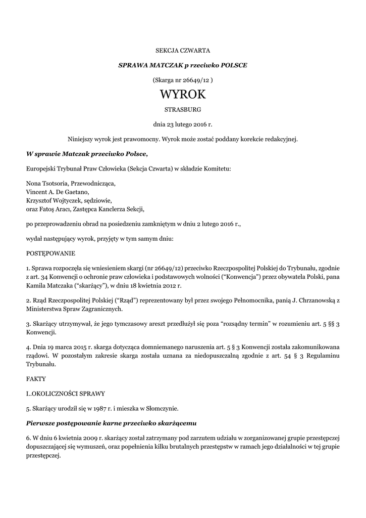 SEKCJA CZWARTA SPRAWA MATCZAK p rzeciwko POLSCE (Skarga nr 26649/12 ) WYROK STRASBURG dnia 23 lutego 2016 r. Niniejszy wyrok jest prawomocny. Wyrok może zostać poddany korekcie redakcyjnej. W sprawie Matczak przeciwko Polsce, Europejski Trybunał Praw Człowieka (Sekcja Czwarta) w składzie Komitetu: Nona Tsotsoria, Przewodnicząca, Vincent A. De Gaetano, Krzysztof Wojtyczek, sędziowie, oraz Fatoş Aracı, Zastępca Kanclerza Sekcji, po przeprowadzeniu obrad na posiedzeniu zamkniętym w dniu 2 lutego 2016 r., wydał następujący wyrok, przyjęty w tym samym dniu: POSTĘPOWANIE 1. Sprawa rozpoczęła się wniesieniem skargi (nr 26649/12) przeciwko Rzeczpospolitej Polskiej do Trybunału, zgodnie z art. 34 Konwencji o ochronie praw człowieka i podstawowych wolności (“Konwencja") przez obywatela Polski, pana Kamila Matczaka (“skarżący”), w dniu 18 kwietnia 2012 r. 2. Rząd Rzeczpospolitej Polskiej (“Rząd”) reprezentowany był przez swojego Pełnomocnika, panią J. Chrzanowską z Ministerstwa Spraw Zagranicznych. 3. Skarżący utrzymywał, że jego tymczasowy areszt przedłużył się poza “rozsądny termin” w rozumieniu art. 5 §§ 3 Konwencji. 4. Dnia 19 marca 2015 r. skarga dotycząca domniemanego naruszenia art. 5 § 3 Konwencji została zakomunikowana rządowi. W pozostałym zakresie skarga została uznana za niedopuszczalną zgodnie z art. 54 § 3 Regulaminu Trybunału. FAKTY I..OKOLICZNOŚCI SPRAWY 5. Skarżący urodził się w 1987 r. i mieszka w Słomczynie. Pierwsze postępowanie karne przeciwko skarżącemu 6. W dniu 6 kwietnia 2009 r. skarżący został zatrzymany pod zarzutem udziału w zorganizowanej grupie przestępczej dopuszczającej się wymuszeń, oraz popełnienia kilku brutalnych przestępstw w ramach jego działalności w tej grupie przestępczej. 7. Śledztwo przeciwko skarżącemu i kilku innych osobom zostało przeprowadzone przez Prokuraturę Apelacyjną w Warszawie. 8. W dniu 8 kwietnia 2009 r. Sąd Rejonowy dla Warszawy – Woli wydał postanowienie o tymczasowym aresztowaniu skarżącego, powołując się na uzasadnione podejrzenie, że popełnił on zarzucane mu przestępstwa. Sąd uznał, że pomimo tego, iż kluczowym dowodem przeciwko skarżącemu były oświadczenia współoskarżonych, zostały one potwierdzone przez inne dowody zgromadzone w sprawie. Ponadto uznał, że zastosowanie tymczasowego aresztowania wobec skarżącego było niezbędne do zapewnienia prawidłowego toku postępowania. Zdaniem sądu ryzyko, że skarżący mógłby utrudniać postępowanie wynikało z faktu, że został on oskarżony o udział w zorganizowanej grupie przestępczej. W związku z tym sąd odnotował także, że jeden z zarzutów wobec skarżącego dotyczył manipulowania świadkiem z użyciem przemocy. Sąd podkreślił również iż grożąca podejrzanemu surowa kara mogłaby skłaniać go do utrudniania postępowania. 9. W dniu 5 czerwca 2009 r. Sąd Okręgowy w Warszawie oddalił nie uwzględnił zażalenia na to postanowienie. Sąd podkreślił w szczególności, że wiarygodność oświadczeń współoskarżonych została potwierdzona przez zeznania kilku świadków. W związku z tym podejrzenia wobec skarżącego mogły zostać faktycznie uznane za uzasadnione. Sąd Okręgowy zgodził się również z Sądem Rejonowym co do tego, że okoliczności sprawy uzasadniały podejrzenie, że skarżącmu może zostać wymierzona surowa kara. 10. Tymczasowe aresztowanie skarżącego było następnie kolejno przedłużane przez Sąd Okręgowy w Warszawie w dniach 2 lipca, 28 września i 7 grudnia 2009 r. oraz 18 stycznia 2010 r. Sąd oparł się na tych samych przesłankach. Podkreślono również, że grożąca podejrzanemu surowa kara może skłaniać go do bezprawnego ingerowania w przebieg postępowania, zwłaszcza, że nie wszyscy członkowie przedmiotowej zorganizowanej grupy przestępczej byli wówczas tymczasowo aresztowani. Sąd stwierdził również, że ze względu na skomplikowany charakter sprawy postępowanie nie mogło być zakończone wcześniej, i że łagodniejsze środki zapobiegawcze nie zapewniłyby prawidłowego toku postępowania. 11. W dniu 19 marca 2010 r. do Sądu Okręgowego w Warszawie wpłynął akt oskarżenia przeciwko skarżącemu. Akt oskarżenia dotyczył w sumie dziewięciu oskarżonych, którym zarzucono popełnienie trzydziestu sześciu przestępstw, i zawierał siedemdziesiąt sześć stron. Prokurator wnioskował o przesłuchanie dwudziestu sześciu świadków. 12. W dniu 29 marca 2010 r. Sąd Okręgowy w Warszawie przedłużył stosowanie tymczasowego aresztowania wobec skarżącego do dnia 31 lipca 2010 r. Sąd oparł się na uzasadnionym podejrzeniu, że skarżący popełnił zarzucane mu przestępstwa, na grożącej oskarżonemu surowej karze oraz konieczności zapewnienia prawidłowego przebiegu postępowania ze względu na zorganizowany charakter działalności przestępczej. 13. Tymczasowe aresztowanie skarżącego było następnie kolejno przedłużane w oparciu o decyzje Sądu Okręgowego w Warszawie. 14. Zażalenie skarżącego na postanowienie sądu z dnia 23 grudnia 2010 r. nie zostało uwzględnione przez Sąd Apelacyjny w Warszawie w dniu 20 stycznia 2011 r. 15. Proces rozpoczął się w dniu 19 lipca 2010 r., a w jego toku sąd pierwszej instancji wyznaczył czternaście terminów rozprawy. 16. W dniu 31 marca 2011 r. Sąd Okręgowy w Warszawie wydał wyrok. Skarżący został uznany za winnego zarzuconych mu czynów i skazany na karę łączną siedmiu lat pozbawienia wolności. 17. Skarżący i pozostali oskarżeni odwołali się od swoich wyroków. 18. W dniu 20 grudnia 2011 r. Sąd Apelacyjny w Warszawie uchylił wyrok sądu pierwszej instancji i przekazał sprawę z do ponownego rozpoznania. 19. Tego samego dnia Sąd Apelacyjny w Warszawie przedłużył okres tymczasowego aresztowania skarżącego. Sąd był zdania, że wcześniej określone powody zatrzymania były nadal aktualne. W szczególno