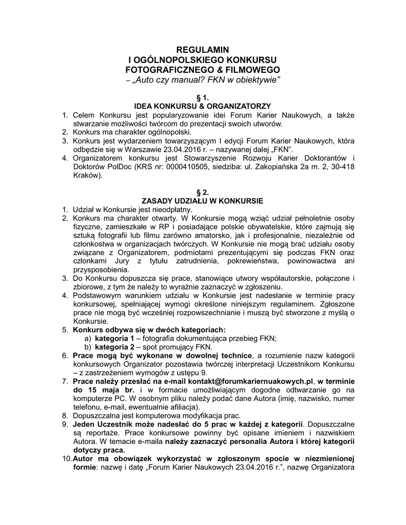REGULAMIN I OGÓLNOPOLSKIEGO KONKURSU FOTOGRAFICZNEGO & FILMOWEGO – „Auto czy manual? FKN w obiektywie” 1. 2. 3. 4. § 1. IDEA KONKURSU & ORGANIZATORZY Celem Konkursu jest popularyzowanie idei Forum Karier Naukowych, a także stwarzanie możliwości twórcom do prezentacji swoich utworów. Konkurs ma charakter ogólnopolski. Konkurs jest wydarzeniem towarzyszącym I edycji Forum Karier Naukowych, która odbędzie się w Warszawie 23.04.2016 r. – nazywanej dalej „FKN”. Organizatorem konkursu jest Stowarzyszenie Rozwoju Karier Doktorantów i Doktorów PolDoc (KRS nr: 0000410505, siedziba: ul. Zakopiańska 2a m. 2, 30-418 Kraków). § 2. ZASADY UDZIAŁU W KONKURSIE 1. Udział w Konkursie jest nieodpłatny. 2. Konkurs ma charakter otwarty. W Konkursie mogą wziąć udział pełnoletnie osoby fizyczne, zamieszkałe w RP i posiadające polskie obywatelskie, które zajmują się sztuką fotografii lub filmu zarówno amatorsko, jak i profesjonalnie, niezależnie od członkostwa w organizacjach twórczych. W Konkursie nie mogą brać udziału osoby związane z Organizatorem, podmiotami prezentującymi się podczas FKN oraz członkami Jury z tytułu zatrudnienia, pokrewieństwa, powinowactwa ani przysposobienia. 3. Do Konkursu dopuszcza się prace, stanowiące utwory współautorskie, połączone i zbiorowe, z tym że należy to wyraźnie zaznaczyć w zgłoszeniu. 4. Podstawowym warunkiem udziału w Konkursie jest nadesłanie w terminie pracy konkursowej, spełniającej wymogi określone niniejszym regulaminem. Zgłoszone prace nie mogą być wcześniej rozpowszechnianie i muszą być stworzone z myślą o Konkursie. 5. Konkurs odbywa się w dwóch kategoriach: a) kategoria 1 – fotografia dokumentująca przebieg FKN; b) kategoria 2 – spot promujący FKN. 6. Prace mogą być wykonane w dowolnej technice, a rozumienie nazw kategorii konkursowych Organizator pozostawia twórczej interpretacji Uczestnikom Konkursu – z zastrzeżeniem wymogów z ustępu 9. 7. Prace należy przesłać na e-mail [email protected], w terminie do 15 maja br. i w formacie umożliwiającym dogodne odtwarzanie go na komputerze PC. W osobnym pliku należy podać dane Autora (imię, nazwisko, numer telefonu, e-mail, ewentualnie afiliacja). 8. Dopuszczalna jest komputerowa modyfikacja prac. 9. Jeden Uczestnik może nadesłać do 5 prac w każdej z kategorii. Dopuszczalne są reportaże. Prace konkursowe powinny być opisane imieniem i nazwiskiem Autora. W temacie e-maila należy zaznaczyć personalia Autora i której kategorii dotyczy praca. 10. Autor ma obowiązek wykorzystać w zgłoszonym spocie w niezmienionej formie: nazwę i datę „Forum Karier Naukowych 23.04.2016 r.”, nazwę Organizatora oraz logotyp FKN i Organizatora (dostępne do pobrania na stronie www.forumkariernaukowych.pl). W zgłoszonej fotografi należy wykorzystać przynajmniej jeden ze wskazanych elementów. 11. Nie będą brane pod uwagę prace konkursowe o treści niezgodnej z prawem lub zasadami współżycia społecznego. 12. Niespełnienie wymogów określonych w regulaminie spowoduje dyskwalifikację nadesłanej pracy, bez jej oceny merytorycznej. 1. 2. 3. 4. 5. 6. 7. § 3. NAGRODY & OGŁOSZENIE WYNIKÓW Organizator przewiduje pulę nagród w postaci zestawów książek nawiązujących tematyką do charakteru wydarzenia (z autografem autora). O przyznaniu i podziale nagród decyduje Jury, powołane przez Organizatora Konkursu. Jury nie jest zobowiązane do wyjaśniania swoich postanowień. Werdykt Jury jest ostateczny. Nagrodzone i wyróżnione prace zostaną nieodpłatnie zaprezentowane na stronie www.poldoc.pl, www.forumkariernaukowych.pl i w mediach społeczniościowych. Jury zastrzega sobie prawo do nieprzyznania nagrody w przypadku, gdy żadna z nadesłanych prac nie spełni wymogów regulaminowych. Wyniki Konkursu zostaną podane na stronach www.poldoc.pl, www.forumkariernaukowych.pl i fanpejdżu Organizatora oraz FKN do 30 czerwca 2016 roku. Ponadto laureaci zostaną poinformowani o nagrodach telefonicznie lub przez e-mail. Nagrody będzie można odebrać do 30 paźdzernika 2016 roku w siedzibie Krajowego Punktu Kontaktowego Programów Badawczych UE w Warszawie. § 4. PRAWA AUTORSKIE 1. Organizatorowi przysługuje wyłączne prawo do rozporządzania prawami autorskimi do materiałów, o których mowa w par. 2 ust. 10. Organizator udziela Uczestnikowi Konkursu niezbywalnej, nieodpłatnej i niewyłącznej licencji na wykorzystanie powyższych materiałów do czasu rozstrzygnięcia Konkursu i jedynie w celu przygotowania pracy konkursowej, zgodnie z niniejszym regulaminem. Po zgłoszeniu pracy Uczestnik nie może korzystać z wymienionych materiałów w żadnym zakresie, w tym rozpowszechnić ani modyfikować. 2. Uczestnik Konkursu, zgłaszając pracę na Konkurs: a) oświadcza, że przysługuje mu pełnia praw autorskich do stworzonej i przekazanej pracy oraz zobowiązuje się do pokrycia kosztów wynikających z ewentualnych roszczeń dochodzonych przez osoby trzecie wobec Organizatora, w związku ze zgłoszoną na Konkurs pracą; b) oświadcza, że praca nie narusza praw osób trzecich, w tym współautorów, jest wolna od wad prawnych, a jego treść jest zgodna z obowiązującym prawem; c) akceptuje postanowienia niniejszego regulaminu; d) wyraża zgodę na przetwarzanie przez Organizatora jego danych osobowych na potrzeby Konkursu zgodnie z ustawą z 29.08.1997 r. o ochronie danych osobowych (Dz. U. Nr 133, poz. 833 z późn. zm.). 3. Uczestnik, przystępując do Konkursu oświadcza, że w razie przyznania jego pracy nagrody lub wyróżnienia przenosi nieodpłatnie na Organizatora autorskie prawa majątkowe do pracy na następujących polach eksploatacji: publikowanie, rozpowszechnianie i zwielokrotnianie wszelkimi dostępnymi środkami przekazu, wystawianie, utrwalanie, wprowadzanie do obrotu, udostępnianie osobom trzecim, publiczne wyświetlanie oryginału lub kopii. 4. Uczestnik Konkursu wyraża zgodę na wykonywanie p