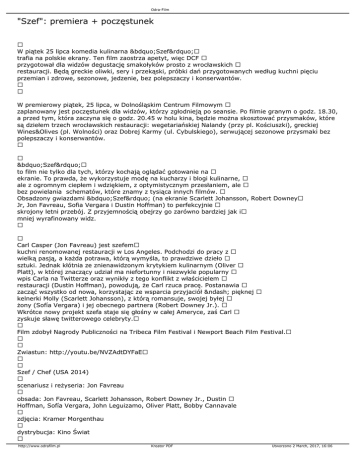 Odra-Film "Szef": premiera + poczęstunek W piątek 25 lipca komedia kulinarna „Szef” trafia na polskie ekrany. Ten film zaostrza apetyt, więc DCF przygotował dla widzów degustację smakołyków prosto z wrocławskich restauracji. Będą greckie oliwki, sery i przekąski, próbki dań przygotowanych według kuchni pięciu przemian i zdrowe, sezonowe, jedzenie, bez polepszaczy i konserwantów. W premierowy piątek, 25 lipca, w Dolnośląskim Centrum Filmowym zaplanowany jest poczęstunek dla widzów, którzy zgłodnieją po seansie. Po filmie granym o godz. 18.30, a przed tym, która zaczyna się o godz. 20.45 w holu kina, będzie można skosztować przysmaków, które są dziełem trzech wrocławskich restauracji: wegetariańskiej Nalandy (przy pl. Kościuszki), greckiej Wines&Olives (pl. Wolności) oraz Dobrej Karmy (ul. Cybulskiego), serwującej sezonowe przysmaki bez polepszaczy i konserwantów. „Szef” to film nie tylko dla tych, którzy kochają oglądać gotowanie na ekranie. To prawda, że wykorzystuje modę na kucharzy i blogi kulinarne, ale z ogromnym ciepłem i wdziękiem, z optymistycznym przesłaniem, ale bez powielania schematów, które znamy z tysiąca innych filmów. Obsadzony gwiazdami „Szef” (na ekranie Scarlett Johansson, Robert Downey Jr, Jon Favreau, Sofia Vergara i Dustin Hoffman) to perfekcyjnie skrojony letni przebój. Z przyjemnością obejrzy go zarówno bardziej jak i mniej wyrafinowany widz. Carl Casper (Jon Favreau) jest szefem kuchni renomowanej restauracji w Los Angeles. Podchodzi do pracy z wielką pasją, a każda potrawa, którą wymyśla, to prawdziwe dzieło sztuki. Jednak kłótnia ze znienawidzonym krytykiem kulinarnym (Oliver Platt), w której znaczący udział ma niefortunny i niezwykle popularny wpis Carla na Twitterze oraz wynikły z tego konflikt z właścicielem restauracji (Dustin Hoffman), powodują, że Carl rzuca pracę. Postanawia zacząć wszystko od nowa, korzystając ze wsparcia przyjaciół – pięknej kelnerki Molly (Scarlett Johansson), z którą romansuje, swojej byłej żony (Sofía Vergara) i jej obecnego partnera (Robert Downey Jr.). Wkrótce nowy projekt szefa staje się głośny w całej Ameryce, zaś Carl zyskuje sławę twitterowego celebryty. Film zdobył Nagrody Publiczności na Tribeca Film Festival i Newport Beach Film Festival. Zwiastun: http://youtu.be/NVZAdtDYFaE Szef / Chef (USA 2014) scenariusz i reżyseria: Jon Favreau obsada: Jon Favreau, Scarlett Johansson, Robert Downey Jr., Dustin Hoffman, Sofía Vergara, John Leguizamo, Oliver Platt, Bobby Cannavale zdjęcia: Kramer Morgenthau dystrybucja: Kino Świat http://www.odrafilm.pl Kreator PDF Utworzono 2 March, 2017, 16:06 Odra-Film czas: 105' http://www.odrafilm.pl Kreator PDF Utworzono 2 March, 2017, 16:06