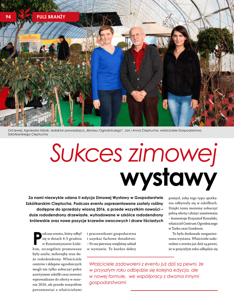 94 PULS BRANŻY Od lewej: Agnieszka Idziak, redaktor prowadząca „Biznesu Ogrodniczego”, Jan i Anna Ciepłucha, właściciele Gospodarstwa Szkółkarskiego Ciepłucha Sukces zimowej wystawy Za nami niezwykle udana II edycja Zimowej Wystawy w Gospodarstwie Szkółkarskim Ciepłucha. Podczas eventu zaprezentowane zostały rośliny dostępne do sprzedaży wiosną 2016, a przede wszystkim nowości – duże rododendrony drzewiaste, wyhodowane w szkółce rododendrony królewskie oraz nowe pozycje krzewów owocowych i drzew liściastych P odczas eventu, który odbył się w dniach 4-5 grudnia w Konstantynowie Łódzkim, szczególnie promowane były azalie, miłorzęby oraz duże rododendrony. Właściciele centrów i sklepów ogrodniczych mogli nie tylko zobaczyć pełen asortyment szkółki oraz nowości wprowadzane do oferty w sezonie 2016, ale przede wszystkim porozmawiać z właścicielami i pracownikami gospodarstwa i uzyskać fachowe doradztwo. – Po raz pierwszy wzięliśmy udział w wystawie. To bardzo dobry pomysł, żeby tego typu spotkania odbywały się w szkółkach. Dzięki temu możemy zobaczyć pełną ofertę i złożyć zamówienia – komentuje Krzysztof Kowalski, właściciel Centrum Ogrodniczego w Turku oraz Gozdowie. To była doskonale zorganizowana wystawa. Właściciele zadowoleni z eventu już dziś są pewni, że w przyszłym roku odbędzie się Właściciele zadowoleni z eventu już dziś są pewni, że w przyszłym roku odbędzie się kolejna edycja, ale w nowej formule, we współpracy z dwoma innymi gospodarstwami REKLAMA Dorota i Krzysztof Kowalscy, właściciele Centrum Ogrodniczego Kowalski Od lewej: Tomasz Sobieraj, właściciel Centrum Ogrodniczego Tomka, Wojciech Wróblewski, prezes ZSzP i Anna Ciepłucha kolejna edycja, ale w nowej formule, we współpracy z dwoma innymi gospodarstwami. – Termin, który wybraliśmy, okazał się idealny, ponieważ to moment, w którym właściciele centrów ogrodniczych już myślą o wiosennym zatowarowaniu. Chcemy w przyszłym roku poszerzyć formułę spotkania, ponieważ wydarzenie okazało się ogromnym sukcesem. Wraz ze Szkółką Zymon oraz Ważyńscy zrobimy wspólną wystawę, najprawdopodobniej w pierwszych trzech dniach grudnia 2016 – mówi Anna Ciepłucha, właścicielka Gospodarstwa Ciepłucha. - W przyszłym roku planujemy także otwarcie centrum ogrodniczego w Konstantynowie Łódzkim, prace już trwają – dodaje Anna Ciepłucha.
