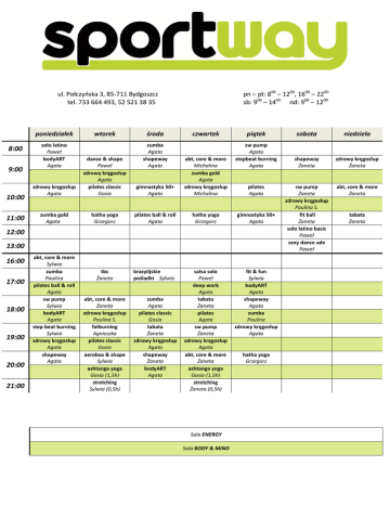 pn – pt: 800 – 1200, 1600 – 2200 sb: 900 – 1400 nd: 900 – 1200 ul. Połczyńska 3, 85-711 Bydgoszcz tel. 733 664 493, 52 521 38 35 poniedziałek 8:00 9:00 10:00 11:00 solo latino Paweł bodyART Agata wtorek środa zumba Agata shapeway Agata czwartek piątek sobota niedziela sw pump Agata stepbeat burning Agata shapeway Żaneta zdrowy kręgosłup Żaneta sw pump Żaneta zdrowy kręgosłup Paulina S. fit ball Żaneta solo latino basic Paweł sexy dance adv Paweł abt, core & more Żaneta zdrowy kręgosłup Agata dance & shape Paweł zdrowy kręgosłup Agata pilates classic Gosia gimnastyka 50+ Agata abt, core & more Michalina zumba gold Agata zdrowy kręgosłup Michalina zumba gold Agata hatha yoga Grzegorz pilates ball & roll Agata hatha yoga Grzegorz gimnastyka 50+ Agata tbc Żaneta brazylijskie pośladki Sylwia abt, core & more Żaneta zdrowy kręgosłup Paulina S. fatburning Agnieszka pilates classic Gosia aerobox & shape Sylwia ashtanga yoga Gosia (1,5h) stretching Sylwia (0,5h) zumba Agata pilates classic Gosia tabata Żaneta zdrowy kręgosłup Agata shapeway Żaneta bodyART Agata salsa solo Paweł deep work Agata tabata Żaneta pilates Agata sw pump Żaneta zdrowy kręgosłup Agata abt, core & more Żaneta ashtanga yoga Gosia (1,5h) stretching Żaneta (0,5h) fit & fun Sylwia bodyART Agata shapeway Agata zumba Paulina zdrowy kręgosłup Agata pilates Agata 12:00 13:00 16:00 17:00 18:00 19:00 20:00 21:00 abt, core & more Sylwia zumba Paulina pilates ball & roll Agata sw pump Sylwia bodyART Agata step beat burning Sylwia zdrowy kręgosłup Agata shapeway Agata Sala ENERGY Sala BODY & MIND hatha yoga Grzegorz tabata Żaneta