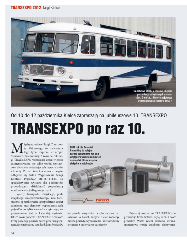 Transexpo 2012 Targi Kielce Dodatkową atrakcję stanowić będzie prezentacja zabytkowych autobusów z Sanoka, z których najstarszy wyprodukowany został w 1959 r. Od 10 do 12 października Kielce zapraszają na jubileuszowe 10. TRANSEXPO TRANSEXPO po raz 10. M iędzynarodowe Targi Transportu Zbiorowego to największa tego typu impreza w Europie Środkowo-Wschodniej. Z roku na rok targi TRANSEXPO wzbudzają coraz większe zainteresowanie nie tylko wśród wystawców, ale także zwiedzających i specjalistów z branży. Po raz trzeci w ramach targów odbędzie się Salon Wyposażenia Stacji Kontroli Pojazdów MOTO-TECH. To specjalistyczna wystawa dla podmiotów prowadzących działalność gospodarczą w zakresie stacji diagnostycznych. Pojazdy transportu miejskiego, podmiejskiego i międzymiastowego, auta turystyczne, specjalistyczne i gospodarcze, części zamienne oraz elementy wyposażenia tych pojazdów to tylko niewielka część tego, co prezentowane jest na kieleckiej wystawie. Jak co roku podczas TRANSEXPO czołowe firmy pokazują pojazdy nowej generacji gwarantujące najwyższy standard, komfort jazdy, 54 2012 rok dla Euro-Vat Consulting to kolejny bardzo dynamiczny rok pod względem wzrostu zamówień na montaż filtrów cząstek stałych do autobusów ale przede wszystkim bezpieczeństwo pasażerów. W halach Targów Kielce zobaczyć można pojazdy, wyposażenie i infrastrukturę związaną z przewozem pasażerów. Najwięcej nowości na TRANSEXPO zaprezentuje firma Solaris. Będą to aż 4 nowe produkty. Warto zatem zobaczyć dwunastometrową wersję autobusu elektryczne- go. Całkowicie bezemisyjny i bardzo cichy pojazd napędzany jest energią elektryczną. Firma z Bolechowa zaprezentuje także Solaris InterUrbino, nowy autobus międzymiastowy, Solaris Urbino Ü (od niemieckiego słowa Überland międzymiastowy) w wersji niskopodłogowej oraz Solaris Urbino 18,75 – najdłuższy z produkowanych przez firmę Solaris pojazdów. Wybrane propozycje wystawowe Auto-CUBY Tradycyjnie w Kielcach nie zabraknie firmy Auto-CUBY. Firma zaprezentuje nowość – autobus turystyczny na bazie MercedesBenz Sprinter z przedłużonym tyłem nadwozia o 400 mm i maksymalną liczbą 24 miejsc siedzących łącznie z kierowcą. Produkcję tego modelu umożliwiło uzyskanie certyfikatu COC 2007/46 na 5,5 tony masy całkowitej bez retardera. Zdaniem szefów firmy jest to optymalne rozwiązanie dla małych i średnich firm transportowych. Auto-CUBY zaprezentuje również sztandarowe zabudowy w wersji VIP oraz City. Euro-Vat Consulting 2012 rok dla Euro-Vat Consulting to kolejny bardzo dynamiczny rok pod względem wzrostu zamówień na montaż filtrów cząstek stałych do autobusów. Największym sukcesem jest jednak wzrost świadomości posiadaczy samochodów osobowych, którzy coraz rzadziej decydują się na usunięcie filtra w sytuacji jego awarii. Zdają sobie oni sprawę z konsekwencji oraz wiedzą, że taniej jest naprawić fap/dpf, niż go usunąć. Nadal jeszcze trudno przekonać do regeneracji tej części pojazdu mechaników serwisów, którzy wolą filtr wymienić na nowy. Groeneveld Podczas jubileuszowej, 10. już edycji Targów Transexpo zwiedzający Halę E będą mogli zobaczyć i zapytać zarówno o nowości, jak i standardowe rozwiązania Groeneveld. Szczególną uwagę ma przykuwać unowocześniona kamera Greensight, mająca swoją premierę na rajdzie Dakar 2012. Kamerę opracowano i wyprodukowano we włoskiej fabryce producenta. W kamerze nowej gene- Szczególną uwagę ma przykuwać unowocześniona kamera Greensight, mająca swoją premierę na rajdzie Dakar 2012 racji zastosowano technologię CMOS, która w połączeniu z wysoką rozdzielczością monitora, zapewnia doskonały obraz zarówno w nocy, jak i w dzień, również w trudnych warunkach pogodowych. Dzięki wprowadzeniu ulepszeń technicznych Greensight przyczynia się jeszcze bardziej do znacznego obniżania wypadkowości w otoczeniu autobusu. Groeneveld zaprezentuje również i te produkty, które uzyskały uznanie użytkowników. Pokazane zostaną systemowe rozwiązania automatycznego smarowania tj. SingleLine na smar EP-0 czy OnePlus na smar klasy EP-2. Będzie można również obejrzeć system dozowania oleju Oilmaster, efektywnie eliminujący ręczną kontrolę poziomu oleju i konieczność jego uzupełniania. Warto dodać, iż w ofercie produktowej Groeneveld znajdziemy różnej klasy, ale nie jakości, smary GreenLube gwarantujące wysoką ochronę elementom smarowanym przed różnorakimi zanieczyszczeniami oraz wilgocią. Jak co roku podczas TRANSEXPO czołowe firmy pokazują pojazdy nowej generacji AUTOSAN Firma z Sanoka w bieżącym roku obchodzi jubileusz 180-lecia. Z tego powodu producent organizuje w Kielcach dwa stoiska: jedno ze swoimi najnowszymi wyrobami, a drugie prezentujące historyczne autobusy rodem z Sanoka. Pierwszym z prezentowanych pojazdów AUTOSAN jest 9-metrowy niskowejściowy SANCITY 9LE, jeden z autobusów w ramach kontraktu na dostawy dla MPK Lublin. Wyposażony jest w silnik Cummins Euro 5 EEV, automatyczną skrzynię biegów ALLISON, 56 miejsc pasażerskich w tym 17 siedzących, klimatyzację, system monitoringu. Drugi eksponat z AUTOSAN to LIDER 9 eco – kolejna, ale jeszcze nieostateczna modernizacja dobrze znanego międzymiastowego TRAMP-a, który łączy w sobie zarówno sprawdzone konstrukcje, jak i nowoczesne rozwiązania. Autobus wyposażony jest w silnik IVECO NEF EEV oraz manualną skrzynię biegów, przewozić może 53 pasażerów, w tym 35 na uchylnych fotelach pasażerskich. Dodatkowe wyposażenie autobusu obejmuje: klimatyzator, tablice elektroniczne, audio-video, system gaszenia pożaru w komorze silnika, alkotester, WiFi i CB Radio. Prezentację uzupełnia międzymiastowy 9-metrowy GEMINI, zakupiony przez firmę Neobus, wyposażony w silnik Cummins Euro 5 EEV, manualną skrzynię biegów oraz 29 foteli pasażerskich. Dodatkową atrakcję stanowić będzie prezentacj