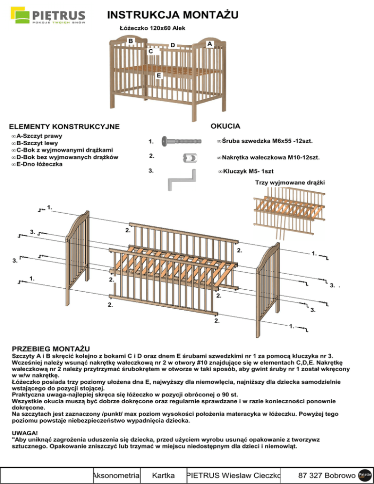 INSTRUKCJA MONTAŻU Łóżeczko 120x60 Alek B B D D C C A A E E OKUCIA ELEMENTY KONSTRUKCYJNE • • • • • A-Szczyt prawy B-Szczyt lewy C-Bok z wyjmowanymi drążkami D-Bok bez wyjmowanych drążków E-Dno łóżeczka 1. • Śruba szwedzka M6x55 -12szt. 2. • Nakrętka wałeczkowa M10-12szt. 3. • Kluczyk M5- 1szt Trzy wyjmowane drążki 1. 1. 1. 2. 2. 2. 3. 3. 3. 2. 2. 2. 1. 1.1. 1. 3. 3. 1.1. 1. 2.2. 2. 3.3. 1. 2. 2. 2. 2. 2.2. 3. 3. 3. 2. 2. 1. 1. 1. PRZEBIEG MONTAŻU Szczyty A i B skręcić kolejno z bokami C i D oraz dnem E śrubami szwedzkimi nr 1 za pomocą kluczyka nr 3. Wcześniej należy wsunąć nakrętkę wałeczkową nr 2 w otwory #10 znajdujące się w elementach C,D,E. Nakrętkę wałeczkową nr 2 należy przytrzymać śrubokrętem w otworze w taki sposób, aby gwint śruby nr 1 został wkręcony w w/w nakrętkę. Łóżeczko posiada trzy poziomy ułożena dna E, najwyższy dla niemowlęcia, najniższy dla dziecka samodzielnie wstającego do pozycji stojącej. Praktyczna uwaga-najlepiej skręca się łóżeczko w pozycji obróconej o 90 st. Wszystkie okucia muszą być dobrze dokręcone oraz regularnie sprawdzane i w razie konieczności ponownie dokręcone. Na szczytach jest zaznaczony /punkt/ max poziom wysokości położenia materacyka w łóżeczku. Powyżej tego poziomu powstaje niebezpieczeństwo wypadnięcia dziecka. UWAGA! "Aby uniknąć zagrożenia uduszenia się dziecka, przed użyciem wyrobu usunąć opakowanie z tworzywz sztucznego. Opakowanie zniszczyć lub trzymać w miejscu niedostępnym dla dzieci i niemowląt. Aksonometria Kartka PIETRUS Wieslaw Cieczko 87 327 Bobrowo