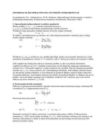 INFORMACJE DO OPRACOWANIA WYNIKÓW POMIAROWYCH (na podstawie: S.Ł. Achnazarowa, W.W. Kafarow, Optymalizacja eksperymentu w chemii i technologii chemicznej, Wydawnictwa Naukowo-Techniczne, Warszawa 1982) 1. Sprawdzanie jednorodności wyników pomiarów Mamy próbkę x1, x2, ..., xn wartości zmiennej losowej x. x max (x min) oznacza największą (najmniejszą) wartość pomiaru. Wielkości maja specjalny rozkład zależny od liczby stopni swobody: (1) f=n–2 W tablicy I przedstawione są wartości υ(υ’) dla różnych poziomów istotności przy różnej liczbie stopni swobody. xmax – xśr υ = (2) Sx√(n-1)/n υ’ = (3) xśr – xmin Sx√(n-1)/n Wielkość xmax (xmin) wyklucza się z próbki jako błąd gruby (na poziomie istotności p), jeśli określone na podstawie wzorów 2 i 3 wartości υ lub υ’ okażą się większe od wartości z tablic. Jeśli wątpliwości budzą dwa lub trzy elementy próbki, to dla wszystkich elementów wątpliwych oblicza się υ(υ’) i badanie rozpoczyna się od elementu mającego najmniejsza wartość υ(υ’). Pozostałe wątpliwe wyniki wyklucza się z próbki. Dla tej zmniejszonej próbki określa się x śr, Sx i nową wartość υ(υ’) dla badanego elementu. Jeśli badany element okaże się obciążony grubym błędem, to tym bardziej do grubych błędów należeć będą wyłączone wcześniej elementy. Jeśli badany element nie należy do grubych błędów, to dołącza się go do próbki i zaczyna badać następny pod względem wielkości υ(υ’) element, przy tym znowu oblicza się nowe wartości x śr, Sx itd. 2. Porównanie dwóch wariancji Obliczyć wariancję powtarzalności metody miareczkowania kulometrycznego z detekcją PK wizualną (S2W) i amperometryczną (S2A). (4) S2x = ∑(xi –xśr)2 n-1 Porównać precyzję metod (5) S2W S2A (6 i 7) f W = nW - 1 > F1 – p (fW/fA) i fA = nA - 1 Stosunek wariancji F należy porównać z wartością odczytaną z tablicy II dla poziomu istotności p = 0,05 i liczb stopni swobody f W i f A. Jeśli stosunek wariancji jest mniejszy od wartości odczytanych z tablic to dane doświadczalne nie pozwalają uważać precyzji obu metod za istotnie różną. Tablica I Wartości υ(υ’) dla poziomu istotności p = 0,05 Liczba stopni Poziom istotności Liczba stopni Poziom istotności swobody f swobody f p = 0,05 p = 0,05 2,426 11 1,412 1 2,461 12 1,689 2 2,493 13 1,869 3 2,523 14 1,996 4 2,551 15 2,093 5 2,577 16 2,172 6 2,600 17 2,237 7 2,623 18 2,294 8 2,644 19 2,343 9 2,664 20 2,387 10 Tablica II Kwantyle rozkładu Fishera F1 – p dla poziomu istotności p = 0,05 fW fA 1 2 3 4 5 6 7 8 9 10 11 12 13 14 15 1 164,4 18,5 10,1 7,7 6,6 6,0 5,6 5,3 5,1 5,0 4,8 4,8 4,7 4,6 4,5 2 199,5 19,0 9,6 6,9 5,8 5,1 4,7 4,5 4,3 4,1 4,0 3,9 3,8 3,7 3,7 3 215,7 19,2 9,3 6,6 5,4 4,8 4,4 4,1 3,9 3,7 3,6 3,5 3,4 3,3 3,3 4 224,6 19,3 9,1 6,4 5,2 4,5 4,1 3,8 3,6 3,5 3,4 3,3 3,2 3,1 3,1 5 230,2 19,3 9,0 6,3 5,1 4,4 4,0 3,7 3,5 3,3 3,2 3,1 3,0 3,0 2,9 6 234,0 19,3 8,9 6,2 5,0 4,3 3,9 3,6 3,4 3,2 3,1 3,0 2,9 2,9 2,8