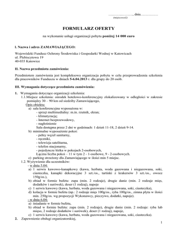 ….……..………, dnia…………… (miejscowość) FORMULARZ OFERTY na wykonanie usługi organizacji pobytu poniŜej 14 000 euro l. Nazwa i adres ZAMAWIAJĄCEGO: Wojewódzki Fundusz Ochrony Środowiska i Gospodarki Wodnej w Katowicach ul. Plebiscytowa 19 40-035 Katowice II. Nazwa przedmiotu zamówienia: Przedmiotem zamówienia jest kompleksowa organizacja pobytu w celu przeprowadzenia szkolenia dla pracowników Funduszu w dniach 5-6.04.2013 r. dla grupy do 20 osób. III. Wymagania dotyczące przedmiotu zamówienia: 1. Wymagania dotyczące organizacji szkolenia: 1.1.Miejsce szkolenia: ośrodek hotelowo-konferencyjny zlokalizowany w odległości w zakresie pomiędzy 30 – 90 km od siedziby Zamawiającego, Opis obiektu: a) sala konferencyjna wyposaŜona w: - sprzęt multimedialny: m.in. rzutnik, ekran; - klimatyzację; - Internet bezprzewodowy, - nagłośnienie Sala dostępna przez 2 dni w godzinach: 1 dzień 11-18, 2 dzień 9-14. b) minimalne wyposaŜenie pokoi: - pełny węzeł sanitarny, - ręczniki, - telewizja satelitarna, - telefon stacjonarny, - pojedyncze łóŜka w pokojach 2-osobowych, Łączna liczba pokoi – 11 w tym 2 - 1-osobowe, 9 - 2-osobowych. c) parking strzeŜony dla Zamawiającego w ilości min 5 miejsc. 1.2. WyŜywienie dla uczestników: - w dniu 5.04: a) 1 serwis kawowo-kanapkowy (kawa, herbata, woda gazowana i niegazowana, soki, ciasteczka, kanapki dekoracyjne 3 szt./os., tartinki z krakersów 3 szt./os., owoce 150g/os.), b) obiad w formie bufetu: zupa (min. 2 rodzaje), drugie danie (min. 2 rodzaje mięs, dodatków i surówek), deser (1 rodzaj), napoje c) 1 serwis kawowy (kawa, herbata, woda gazowana i niegazowana, soki, ciasteczka), d) kolacja w formie bufetu (np.: 2 rodzaje mięs 100g/os., ryba 100g/os., zimna płyta w ilości min. 250g/os. wg propozycji Wykonawcy, pieczywo, dodatki, napoje). - w dniu 6.04: a) śniadanie w formie bufetu, b) obiad w formie bufetu: zupa (min. 2 rodzaje), drugie danie (min. 2 rodzaje: ryba lub mięso, 2 rodzaje dodatków i surówek), deser (1 rodzaj), napoje, c) 1 serwis kawowy (kawa, herbata, woda gazowana i niegazowana, soki, ciasteczka). 2. Zapewnienie obsługi organizatorskiej, 1 3. MoŜliwość korzystania z wyposaŜenia dodatkowego oferowanego przez Wykonawcę w ramach ceny (np. SPA, basen, kręgielnia, bilard, tenis stołowy itp.) wraz z informacją o warunkach (godziny otwarcia, rabaty, rezerwacje). Dodatkowych informacji udziela: Grzegorz Skowron, tel. (32) 6032236. IV. Wymagania związane z wykonaniem zamówienia: 1. Termin wykonania usługi: w dniach 5-6.04.2013 r. - planowany wyjazd w I dniu w godz. 8.30 -9.00, - planowany wyjazd w II dniu w godz. 14.00-15.00. 2. Z wyłonionym Wykonawcą zostanie zawarta pisemna umowa. 3. Podstawą dokonania zapłaty będzie potwierdzenie wykonania usługi w formie protokołu. 4. Zapłata za wykonanie usługi nastąpi w formie przelewu na rachunek bankowy Wykonawcy wskazany w fakturze, w terminie 14 dni od daty dostarczenia Zamawiającemu faktury, po potwierdzeniu wykonania usługi w formie protokołu. 5. Ze strony Zamawiającego osobą upowaŜnioną do podpisania protokołu i odbioru przedmiotu zamówienia jest Kierownik Zespołu AO lub osoba przez niego wskazana. 6. Ostateczna liczba uczestników oraz szczegółowy harmonogram pobytu zostanie przekazany Wykonawcy do dnia 29.03.2013 r. 7. Cena za osobę podana w pkt. VII niniejszego formularza musi zawierać wszystkie koszty pobytu (nocleg, wyŜywienie, bufety, sala, opieka organizatorska). 8. Zamawiający nie dopuszcza moŜliwości składania oferty wariantowej. 9. Wykonawca moŜe złoŜyć tylko jedną ofertę. 10. Przy wyborze najkorzystniejszej oferty Zamawiający kierował się będzie następującymi kryteriami i ich wagą: Lp. Kryterium Waga (punkty) 1. Cena pobytu za osobę 70 2. Dodatkowe wyposaŜenie obiektu udostępnione w ramach zaoferowanej ceny 30 W trakcie oceny ofert kolejno ocenianym ofertom zostaną przyznane dla poszczególnych kryteriów punkty według następujących zasad: Cn Co = ----------------------x waga kryterium COB Cw Co= -------------------- x waga kryterium CWB Co = ocena punktowa Co = ocena punktowa CN = cena najniŜsza wśród złoŜonych ofert Cw = najlepsze wyposaŜenie obiektu i warunki korzystania COB = cena oferty badanej CWB = warunki oferty badanej Punkty wyliczone w kaŜdym z kryteriów zaokrąglone zostaną do 2 miejsc po przecinku, a następnie zsumowane. Zamawiający wybierze ofertę, która uzyska największą ilość punktów. Cena powinna być wyraŜona w złotych (PLN). 11. Zamawiający zastrzega sobie prawo do zamknięcia postępowania bez dokonania wyboru oferty nie podając przyczyny, z zastrzeŜeniem pkt. 12. 12. Zamawiający zamknie postępowanie bez dokonania wyboru, gdy w toku postępowania wpłynie jedna oferta. V. Ofertę naleŜy: 1. ZłoŜyć w formie pisemnej w terminie do dnia 22.03.2013 r. (osobiście, pisemnie - listem, faksem lub e-mailem na adres: [email protected] wraz z równoczesnym przesłaniem wersji papierowej) na Formularzu Oferty(strony 1-3), 2 2. Wraz z ofertą naleŜy: - złoŜyć wpis do Centralnej Ewidencji i Informacji o Działalności Gospodarczej Rzeczpospolitej Polskiej, (w przypadku wpisu do Ewidencji Działalności Gospodarczej dodatkowo NIP i REGON), lub odpis z KRS wraz z NIP i REGON, - opis hotelu (min. pokoje + sala konferencyjna) opis hotelu oraz wyposaŜenia dodatkowego, - propozycje menu. VI. Tryb postępowania: ZAPYTANIE OFERTOWE Udzielenie zamówienia publicznego na podstawie ustawy z dnia 29 stycznia 2004 Prawo zamówień publicznych, zgodnie z Art 4. ust. 8. (ustawy nie stosuje się zamówień i konkursów, których wartość nie przekracza wyraŜonej w złotych równowartości kwoty 14 000 euro) oraz Regulaminu Udzielania Zamówień Publicznych w Wojewódzkim Funduszu Ochrony Środowiska i Gospodarki Wodnej w Katowicach. VII. Nazwa i adres WYKONAWCY NIP ................................................. ……………………………