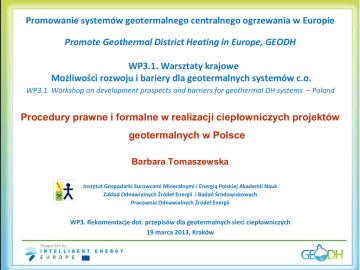Promowanie systemów geotermalnego centralnego ogrzewania w Europie Promote Geothermal District Heating in Europe, GEODH WP3.1. Warsztaty krajowe Możliwości rozwoju i bariery dla geotermalnych systemów c.o. WP3.1. Workshop on development prospects and barriers for geothermal DH systems – Poland Procedury prawne i formalne w realizacji ciepłowniczych projektów geotermalnych w Polsce Barbara Tomaszewska Instytut Gospodarki Surowcami Mineralnymi i Energią Polskiej Akademii Nauk Zakład Odnawialnych Źródeł Energii i Badań Środowiskowych Pracownia Odnawialnych Źródeł Energii WP3. Rekomendacje dot. przepisów dla geotermalnych sieci ciepłowniczych 19 marca 2013, Kraków UWARUNKOWANIA PRAWNE Prawo geologiczne i górnicze Prawo energetyczne Ustawa o planowaniu i zagospodarowaniu przestrzennym Ustawa o zmianie ustawy o warunkach dopuszczalności nadzorowania pomocy publicznej dla przedsiębiorców Prawo ochrony środowiska Ustawa o postępowaniu w sprawach dotyczących pomocy publicznej Ustawa o swobodzie działalności gospodarczej Ustawa o udostępnianiu informacji o środowisku i jego ochronie, (..) ocenach oddziaływania na środowisko Prawo budowlane Prawo wodne Procedury prawne i formalne w realizacji ciepłowniczych projektów geotermalnych bazujących na WODACH TERMALNYCH I ETAP – ZATWIERDZENIE PROJEKTU ROBÓT GEOLOGICZNYCH Projekt robót geologicznych powinien określać: 1) cel zamierzonych prac, sposób jego osiągnięcia, wraz z określeniem rodzaju wymaganej dokumentacji geologicznej; 2) harmonogram prac; 3) przestrzeń, w obrębie której mają być wykonywane prace geologiczne; 4) przedsięwzięcia konieczne ze względu na ochronę środowiska, w tym zwłaszcza wód podziemnych, oraz sposób likwidacji wyrobisk, otworów wiertniczych, rekultywacji gruntów i środki mające na celu zapobieżenie szkodom. 5) wpływ robót na obszary podlegające szczególnej ochronie, w tym Natura 2000 Zatwierdzenie projektu wymaga zasięgnięcia opinii właściwego wójta, burmistrza lub prezydenta miasta. DECYZJA O ŚRODOWISKOWYCH UWARUNKOWANIACH Poszukiwanie lub rozpoznawanie złóż kopalin: połączone z robotami geologicznymi wykonywanymi przy użyciu materiałów wybuchowych, wykonywane metodą otworów wiertniczych o głębokości większej niż 1000 m. Wydobywanie kopalin ze złoża metodą otworów wiertniczych. Ustawa z dnia 3 października 2008 r. o udostępnianiu informacji o środowisku i jego ochronie, udziale społeczeństwa w ochronie środowiska oraz ocenach oddziaływania na środowisko (Dz. U. 08.199.1227 z późn. zm.) Rozporządzenie Rady Ministrów z dnia 09.11.2010 r. w sprawie przedsięwzięć mogących znacząco oddziaływać na środowisko (Dz. U. z 2010 r. Nr 213 poz. 1397 z późn. zm.) II ETAP – REALIZACJA PRAC GEOLOGICZNYCH Plan ruchu zakładu wykonującego roboty geologiczne Prace geologiczne realizowane są na podstawie ustaleń projektu robót geologicznych, w oparciu o plan ruchu zakładu wykonującego roboty geologiczne, sporządzony zgodnie z wymaganiami przepisów PGG. Plan ruchu określa szczegółowo przedsięwzięcia niezbędne w celu zapewnienia: bezpieczeństwa powszechnego, bezpieczeństwa pożarowego, bezpieczeństwa i higieny pracy pracowników zakładu, ochrony środowiska, zapobiegania szkodom i ich naprawiania. III ETAP – DOKUMENTOWANIE WYNIKÓW PRZEPROWADZONYCH PRAC Dokumentacja hydrogeologiczna Wyniki prac geologicznych, wraz z ich interpretacją oraz określeniem stopnia osiągnięcia zamierzonego celu, należy przedstawić w dokumentacji hydrogeologicznej, ustalającej zasoby eksploatacyjne ujęcia oraz właściwości wód termalnych. Dokumentację hydrogeologiczną wykonuje się również w związku z określeniem warunków hydrogeologicznych związanych z zamierzonym wtłaczaniem wód do górotworu. Dokumentację hydrogeologiczną zatwierdza marszałek województwa. Projekt zagospodarowania złoża Projekt zagospodarowania złoża, sporządza ubiegający się o koncesję na wydobywanie kopaliny ze złoża, na podstawie dokumentacji hydrogeologicznej z uwzględnieniem uwarunkowań techniczno-ekonomicznych. Projekt ten powinien określać wymagania w zakresie: racjonalnej gospodarki złożem kopaliny, w szczególności przez kompleksowe i racjonalne wykorzystanie kopaliny głównej i kopalin towarzyszących, technologii eksploatacji zapewniającej ograniczenie ujemnych wpływów na środowisko. IV ETAP – WNIOSEK O KONCESJĘ NA WYDOBYWANIE WÓD TERMALNYCH dowód istnienia prawa do korzystania z informacji geologicznej oraz kopię decyzji zatwierdzającej dokumentację geologiczną, projekt zagospodarowania złoża, decyzję o środowiskowych uwarunkowaniach projektowanego przedsięwzięcia, prawa przysługującego wnioskodawcy do nieruchomości gruntowej, w granicach której ma być wykonywana zamierzona działalność, oznaczenie wnioskodawcy, jego siedziby i adresu, określenie numeru w rejestrze przedsiębiorców lub ewidencji działalności gospodarczej, określenie rodzaju i zakresu wykonywania działalności gospodarczej, na którą ma być udzielona koncesja, IV ETAP – WNIOSEK O KONCESJĘ NA WYDOBYWANIE WÓD TERMALNYCH określenie czasu, na jaki koncesja ma być udzielona, wraz ze wskazaniem daty rozpoczęcia działalności, określenie środków, jakimi dysponuje podmiot ubiegający się o koncesję, złoże kopaliny lub jego część, która ma być przedmiotem wydobycia, wielkość i sposób zamierzonego wydobycia kopaliny, stopień zamierzonego wykorzystania zasobów przemysłowych złoża, w tym kopalin towarzyszących, jak również środki umożliwiające osiągnięcie tego celu, projektowane położenie obszaru górniczego i terenu górniczego oraz ich granic. Koncesji udziela się na czas oznaczony, nie krótszy niż 3 lata i nie dłuższy niż 50 lat, chyba że przedsiębiorca złożył wniosek o udzielenie koncesji na czas krótszy. Umowa o użytkowanie górnicze W granicach określonych przez ustawę or