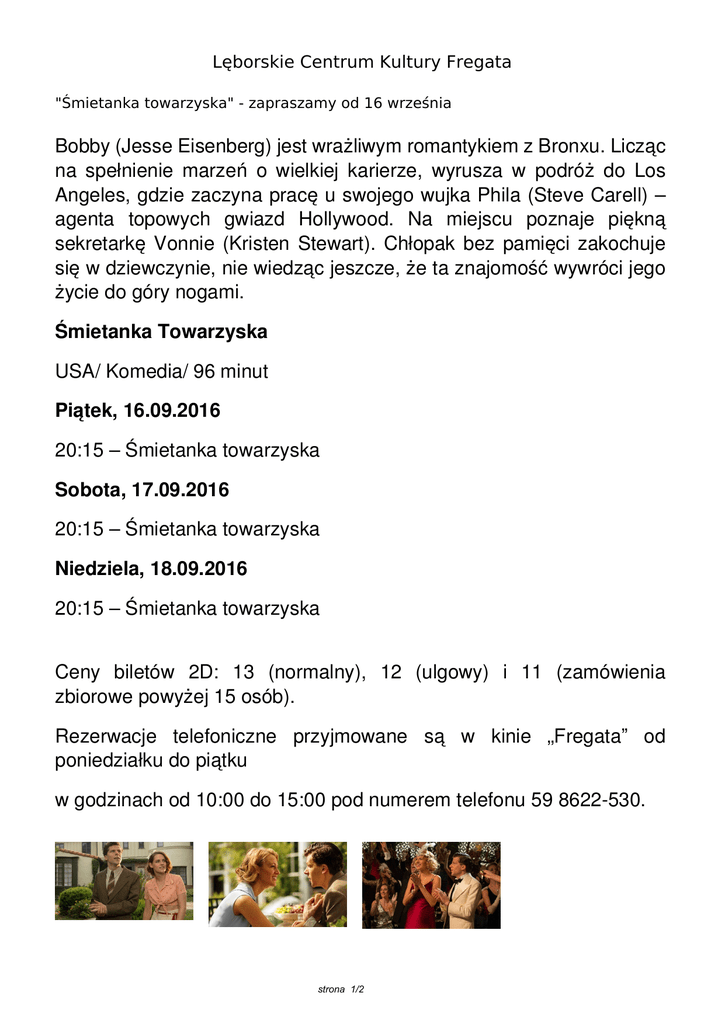 Lęborskie Centrum Kultury Fregata "Śmietanka towarzyska" - zapraszamy od 16 września Bobby (Jesse Eisenberg) jest wrażliwym romantykiem z Bronxu. Licząc na spełnienie marzeń o wielkiej karierze, wyrusza w podróż do Los Angeles, gdzie zaczyna pracę u swojego wujka Phila (Steve Carell) – agenta topowych gwiazd Hollywood. Na miejscu poznaje piękną sekretarkę Vonnie (Kristen Stewart). Chłopak bez pamięci zakochuje się w dziewczynie, nie wiedząc jeszcze, że ta znajomość wywróci jego życie do góry nogami. Śmietanka Towarzyska USA/ Komedia/ 96 minut Piątek, 16.09.2016 20:15 – Śmietanka towarzyska Sobota, 17.09.2016 20:15 – Śmietanka towarzyska Niedziela, 18.09.2016 20:15 – Śmietanka towarzyska Ceny biletów 2D: 13 (normalny), 12 (ulgowy) i 11 (zamówienia zbiorowe powyżej 15 osób). Rezerwacje telefoniczne przyjmowane są w kinie „Fregata” od poniedziałku do piątku w godzinach od 10:00 do 15:00 pod numerem telefonu 59 8622-530. strona 1/2 strona 2/2 Powered by TCPDF (www.tcpdf.org)