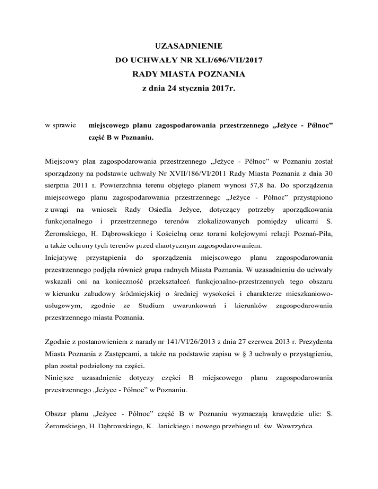 UZASADNIENIE DO UCHWAŁY NR XLI/696/VII/2017 RADY MIASTA POZNANIA z dnia 24 stycznia 2017r. miejscowego planu zagospodarowania przestrzennego „Jeżyce - Północ” w sprawie część B w Poznaniu. Miejscowy plan zagospodarowania przestrzennego „Jeżyce - Północ” w Poznaniu został sporządzony na podstawie uchwały Nr XVII/186/VI/2011 Rady Miasta Poznania z dnia 30 sierpnia 2011 r. Powierzchnia terenu objętego planem wynosi 57,8 ha. Do sporządzenia miejscowego planu zagospodarowania przestrzennego „Jeżyce - Północ” przystąpiono z uwagi na wniosek funkcjonalnego i Rady Osiedla przestrzennego Jeżyce, terenów dotyczący potrzeby zlokalizowanych uporządkowania pomiędzy ulicami S. Żeromskiego, H. Dąbrowskiego i Kościelną oraz torami kolejowymi relacji Poznań-Piła, a także ochrony tych terenów przed chaotycznym zagospodarowaniem. Inicjatywę przystąpienia do sporządzenia miejscowego planu zagospodarowania przestrzennego podjęła również grupa radnych Miasta Poznania. W uzasadnieniu do uchwały wskazali oni na konieczność przekształceń funkcjonalno-przestrzennych tego obszaru w kierunku zabudowy śródmiejskiej o średniej wysokości i charakterze mieszkaniowousługowym, zgodnie ze Studium uwarunkowań i kierunków zagospodarowania przestrzennego miasta Poznania. Zgodnie z postanowieniem z narady nr 141/VI/26/2013 z dnia 27 czerwca 2013 r. Prezydenta Miasta Poznania z Zastępcami, a także na podstawie zapisu w § 3 uchwały o przystąpieniu, plan został podzielony na części. Niniejsze uzasadnienie dotyczy części B miejscowego planu zagospodarowania przestrzennego „Jeżyce - Północ” w Poznaniu. Obszar planu „Jeżyce - Północ” część B w Poznaniu wyznaczają krawędzie ulic: S. Żeromskiego, H. Dąbrowskiego, K. Janickiego i nowego przebiegu ul. św. Wawrzyńca. Obszar planu stanowi przestrzeń już zainwestowaną. Występują tu bardzo zróżnicowane typy zabudowy. W północnej części obszaru – pomiędzy ul. św. Wawrzyńca, ul. K. Janickiego, istniejącą drogą wewnętrzną bez nazwy a ul. S. Żeromskiego – dominują tereny zabudowy mieszkaniowej, głównie jednorodzinnej. Przy ul. M. Rodziewiczówny znajduje się zabudowa mieszkaniowa w układzie szeregowym, natomiast pozostałą zabudowę jednorodzinną stanowią budynki wolno stojące. Przy ul. K. Janickiego oraz przy ul. S. Żeromskiego zlokalizowane są również wolno stojące, wielorodzinne wille miejskie. W części zabudowy mieszkaniowej wydzielono lokale usługowe, m.in. gabinety lekarskie, biura. Przy ul. M. Rodziewiczówny oraz ul. Nad Seganką zlokalizowane są także nieliczne budynki usługowe (oświatowe i służby zdrowia). W środkowej części analizowanego obszaru znajdują się tereny usługowe, w tym budynki oświatowe (Zespół Szkół Ogólnokształcących nr 7 przy ul. S. Żeromskiego, Gimnazjum nr 63 oraz Niepubliczna Szkoła Podstawowa „Galileo” przy ul. K. Janickiego), wraz z terenami boisk szkolnych, a także budynki usługowe położone wzdłuż ul. K. Janickiego: biurowy, warsztatowo-usługowo-handlowy, administracyjny (siedziba Straży Miejskiej). W południowej części analizowanego obszaru – najbliżej ul. H. Dąbrowskiego – znajdują się tereny zabudowy mieszkaniowej wielorodzinnej oraz teren oświatowy (Przedszkole nr 96 „Jarzębinka” przy ul. K. Janickiego). Pierzeję ul. H. Dąbrowskiego tworzy zwarta zabudowa mieszkaniowa, natomiast wewnątrz terenu zlokalizowane są jeszcze dwa wolno stojące budynki mieszkalne. Otoczenie obszaru planu stanowią: • od strony północnej – tereny komunikacyjne (ul. św. Wawrzyńca oraz nasyp z liniami kolejowymi nr 351 Poznań-Szczecin i nr 354 Poznań-Piła, a za nimi tereny mieszkaniowe Sołacza oraz tereny zieleni, współtworzące zachodni (golęciński) klin zieleni, • od strony wschodniej – bliżej ul. H. Dąbrowskiego – tereny produkcyjno-usługowe (Apator Powogaz), natomiast bliżej ul. św. Wawrzyńca tereny mieszkaniowo-usługowe (niska zabudowa wolno stojąca), • od strony południowej – teren komunikacyjny (ul. H. Dąbrowskiego), a za nim tereny mieszkaniowo-usługowe (zwarta zabudowa wielorodzinna z lokalami usługowymi w parterach budynków), • od strony zachodniej – teren komunikacyjny (ul. S. Żeromskiego), a za nim tereny produkcyjno-usługowe oraz bliżej ul. św. Wawrzyńca niewielki teren mieszkaniowy (zabudowa jednorodzinna szeregowa). Plan w znacznej części jest planem regulacyjnym. Utrzymuje dotychczasowy – mieszkaniowo-usługowy – charakter przedmiotowego obszaru, zachowując obecne przeznaczenie większości terenów znajdujących się w jego granicach. Podobnie jak obecnie, w północnej części omawianego obszaru dominować będzie funkcja mieszkaniowa. Plan zachowuje aktualny układ terenów niskiej zabudowy mieszkaniowej jednorodzinnej. Wzdłuż ul. K. Rodziewiczówny, gdzie zlokalizowana jest zabudowa szeregowa, wyznaczono dwa tereny zabudowy mieszkaniowej jednorodzinnej, natomiast na pozostałych terenach, na których obecnie znajdują się budynki jednorodzinne, wyznaczono tereny o funkcji mieszanej – tereny zabudowy mieszkaniowej jednorodzinnej lub zabudowy usługowej o charakterze zabudowy wolno stojącej, z dopuszczeniem lokalizowania budynków na granicy działek budowlanych. Na terenach, na których obecnie zlokalizowane są wielorodzinne wille miejskie, wyznaczono tereny zabudowy mieszkaniowej wielorodzinnej, również z dopuszczeniem lokalizacji funkcji usługowych. Tereny zabudowy mieszkaniowej wielorodzinnej lub usługowej wyznaczono również w południowej części obszaru, w miejscu lokalizacji istniejących budynków wielorodzinnych przy ul. H. Dąbrowskiego i ul. K. Janickiego, w formie zabudowy zwartej. W środkowej części planu wyznaczono tereny zabudowy usługowej, usługowej oświaty oraz dwa tereny zabudowy mieszkaniowej wielorodzinnej lub usługowej. Oznacza to, że obecnie istniejące niskie budynki usługowe, z
