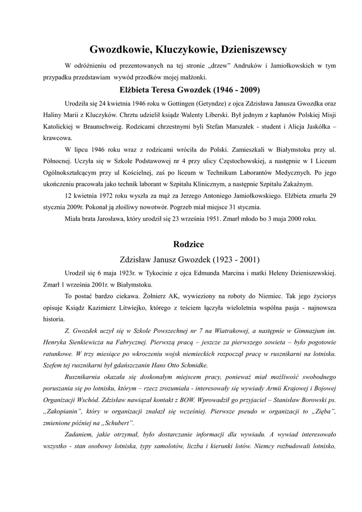 Gwozdkowie, Kluczykowie, Dzieniszewscy W odróżnieniu od prezentowanych na tej stronie „drzew” Andruków i Jamiołkowskich w tym przypadku przedstawiam wywód przodków mojej małżonki. Elżbieta Teresa Gwozdek (1946 - 2009) Urodziła się 24 kwietnia 1946 roku w Gottingen (Getyndze) z ojca Zdzisława Janusza Gwozdka oraz Haliny Marii z Kluczyków. Chrztu udzielił ksiądz Walenty Liberski. Był jednym z kapłanów Polskiej Misji Katolickiej w Braunschweig. Rodzicami chrzestnymi byli Stefan Marszałek - student i Alicja Jaskółka – krawcowa. W lipcu 1946 roku wraz z rodzicami wróciła do Polski. Zamieszkali w Białymstoku przy ul. Północnej. Uczyła się w Szkole Podstawowej nr 4 przy ulicy Częstochowskiej, a następnie w I Liceum Ogólnokształcącym przy ul Kościelnej, zaś po liceum w Technikum Laborantów Medycznych. Po jego ukończeniu pracowała jako technik laborant w Szpitalu Klinicznym, a następnie Szpitalu Zakaźnym. 12 kwietnia 1972 roku wyszła za mąż za Jerzego Antoniego Jamiołkowskiego. Elżbieta zmarła 29 stycznia 2009r. Pokonał ją złośliwy nowotwór. Pogrzeb miał miejsce 31 stycznia. Miała brata Jarosława, który urodził się 23 września 1951. Zmarł młodo bo 3 maja 2000 roku. Rodzice Zdzisław Janusz Gwozdek (1923 - 2001) Urodził się 6 maja 1923r. w Tykocinie z ojca Edmunda Marcina i matki Heleny Dzieniszewskiej. Zmarł 1 września 2001r. w Białymstoku. To postać bardzo ciekawa. Żołnierz AK, wywieziony na roboty do Niemiec. Tak jego życiorys opisuje Ksiądz Kazimierz Litwiejko, którego z teściem łączyła wieloletnia wspólna pasja - najnowsza historia. Z. Gwozdek uczył się w Szkole Powszechnej nr 7 na Wiatrakowej, a następnie w Gimnazjum im. Henryka Sienkiewicza na Fabrycznej. Pierwszą pracą – jeszcze za pierwszego sowieta – było pogotowie ratunkowe. W trzy miesiące po wkroczeniu wojsk niemieckich rozpoczął pracę w rusznikarni na lotnisku. Szefem tej rusznikarni był gdańszczanin Hans Otto Schmidke. Rusznikarnia okazała się doskonałym miejscem pracy, ponieważ miał możliwość swobodnego poruszania się po lotnisku, którym – rzecz zrozumiała - interesowały się wywiady Armii Krajowej i Bojowej Organizacji Wschód. Zdzisław nawiązał kontakt z BOW. Wprowadził go przyjaciel – Stanisław Borowski ps. „Zakopianin”, który w organizacji znalazł się wcześniej. Pierwsze pseudo w organizacji to „Zięba”, zmienione później na „Schubert”. Zadaniem, jakie otrzymał, było dostarczanie informacji dla wywiadu. A wywiad interesowało wszystko - stan osobowy lotniska, typy samolotów, liczba i kierunki lotów. Niemcy rozbudowali lotnisko, budowali bunkry, koszary dla żołnierzy, gniazda karabinów maszynowych. Pracując przy reperacji zdobycznej sowieckiej broni, „Schubert” wyniósł z lotniska 10 naganów, chociaż przy bramie były kontrole i rewizje. Skrytka na prasę konspiracyjną mieściła się w „sławojce” Borowskich przy ul. Krakowskiej. Tam też obaj konspiratorzy czytali „Wschód”, „Na Wschodnim Posterunku”, „Zew”, „Biuletyn Informacyjny” i inne gazetki. Jedyną jednak akcją, w której wziął udział, było naklejanie plakatów na kaplicy św. Rocha oraz na ul. Sosnowej i Angielskiej. W 1943 r. działalność konspiracyjna została przerwana. Zdzisław Gwozdek został wywieziony na roboty do Niemiec. Pracował w gospodarstwie rolnym. W następnym roku został aresztowany przy próbie ucieczki i umieszczony w „Obozie Wychowawczym Gestapo” w Zeichen. Było to już po upadku powstania warszawskiego. Po uwolnieniu z obozu wstąpił do Polskich Sił Zbrojnych na Zachodzie. Przebywał w obozie wojskowym nr138 , najpierw w Northeim, a następnie w Gottingen. (podany w jednym z listów do ojca adres to - Gottingen Polish Military Centre N 138 Blok5, kom 21). Tam poznał przyszłą żonę - łączniczkę z powstania warszawskiego. W lipcu 1946 r. wraz z małżonką i trzymiesięczną córeczką wrócił do kraju. Początkowo miał dużo trudności ze znalezieniem pracy. Później pracował w kilku instytucjach, min. jako księgowy w garbarni. Ostatnie lata do emerytury przepracował w PZU. Odkąd go poznałem (przyp. jj) żył jedną pasją - dokumentowaniem historii białostockiego okręgu AK. Mój teść - jak twierdzi ksiądz Kazimierz Litwiejko - wykonał gigantyczną robotę "przekopując" wszystkie możliwe archiwa. Nikt takiego zbioru ponoć nie ma. Za życia wydał trzy tomy, do wydania pozostało jeszcze siedem. Testamentem zapisał swoje zbiory wnuczkom. Mieszkanie wyglądało jak archiwum, wszystkie ściany to szafy i regały. „Chciał nie chciał wola teścia rzecz święta, trzeba to będzie jakoś wydać" - myślałem z lekkim przerażeniem. Szczęśliwie za moją namową żona postanowiła przekazać zbiory do IPN. Zdzisław miał następujące rodzeństwo: Alina Danuta urodzona w 1922 r. w Tykocinie, zmarła według aktu zgonu na gruźlicę płuc, choć rodzinna legenda mówi, że wskutek przeziębienia (galopujące suchoty), którego nabyła się na Polesiu w zimie z 1941 na 1942r. Wanda urodzona 8 lipca 1928 w Ciechanowcu. Jej mężem był Edward Jan Kucharz, syn Franciszka, urodzony w Bochni. Był Czechem lub pewniej Słowakiem, jego prawdziwe nazwisko Kuchar (z „daszkiem"). Wanda zmarła 10 października 2008 r. Halina Maria Kluczyk (1924-1968) Warszawianka, przed wojną mieszkała na ulicy Grzybowskiej ale ponoć urodziła się (3 lutego 1924 r.) w Paprotni. Córka Tadeusza Kluczyka i Janiny z Kujawów. (Nie prowadziłem kwerendy metrykalnej przodków rodzin Kluczyków i Kujawów, stąd brak w tym opracowaniu o nich informacji– przyp jj) Była łączniczką w powstaniu warszawskim. Wedle rodzinnego przekazu sygnał do powstania zastał ją w sklepie piekarniczym na Senatorskiej, gdzie pracowała jako sprzedawczyni. Zrzuciła fartuch i poszła do swojego oddziału. Przeszła przez obóz w Pruszkowie; 9 października 1944 roku została wywiez