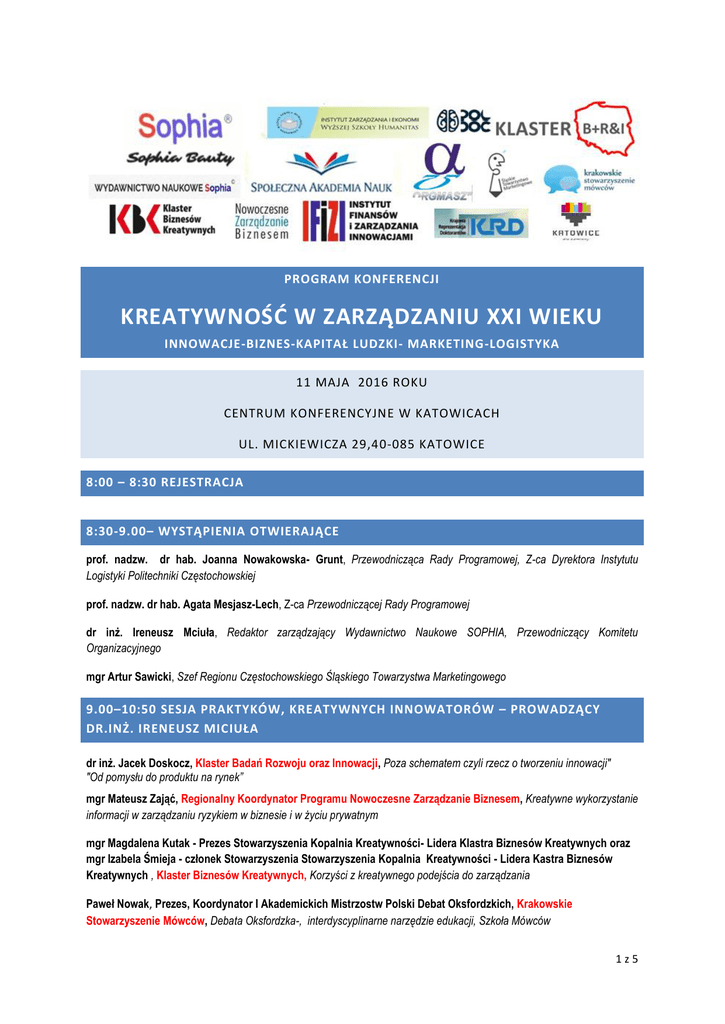 PROGRAM KONFERENCJI KREATYWNOŚĆ W ZARZĄDZANIU XXI WIEKU INNOWACJE-BIZNES-KAPITAŁ LUDZKI- MARKETING-LOGISTYKA 11 MAJA 2016 ROKU CENTRUM KONFERENCYJNE W KATOWICACH UL. MICKIEWICZA 29,40-085 KATOWICE 8:00 – 8:30 REJESTRACJA 8:30-9.00– WYSTĄPIENIA OTWIERAJĄCE prof. nadzw. dr hab. Joanna Nowakowska- Grunt, Przewodnicząca Rady Programowej, Z-ca Dyrektora Instytutu Logistyki Politechniki Częstochowskiej prof. nadzw. dr hab. Agata Mesjasz-Lech, Z-ca Przewodniczącej Rady Programowej dr inż. Ireneusz Mciuła, Redaktor zarządzający Wydawnictwo Naukowe SOPHIA, Przewodniczący Komitetu Organizacyjnego mgr Artur Sawicki, Szef Regionu Częstochowskiego Śląskiego Towarzystwa Marketingowego 9.00–10:50 SESJA PRAKTYKÓW, KREATYWNYCH INNOWATORÓW – PROWADZĄCY DR.INŻ. IRENEUSZ MICIUŁA dr inż. Jacek Doskocz, Klaster Badań Rozwoju oraz Innowacji, Poza schematem czyli rzecz o tworzeniu innowacji" "Od pomysłu do produktu na rynek” mgr Mateusz Zająć, Regionalny Koordynator Programu Nowoczesne Zarządzanie Biznesem, Kreatywne wykorzystanie informacji w zarządzaniu ryzykiem w biznesie i w życiu prywatnym mgr Magdalena Kutak - Prezes Stowarzyszenia Kopalnia Kreatywności- Lidera Klastra Biznesów Kreatywnych oraz mgr Izabela Śmieja - członek Stowarzyszenia Stowarzyszenia Kopalnia Kreatywności - Lidera Kastra Biznesów Kreatywnych , Klaster Biznesów Kreatywnych, Korzyści z kreatywnego podejścia do zarządzania Paweł Nowak, Prezes, Koordynator I Akademickich Mistrzostw Polski Debat Oksfordzkich, Krakowskie Stowarzyszenie Mówców, Debata Oksfordzka-, interdyscyplinarne narzędzie edukacji, Szkoła Mówców 1z5 Mgr Artur Sawicki, Śląskie Towarzystwo Marketingowe, Współczesny marketing. Innowacyjność vs skuteczność 10.50-11.10 – PRZERWA KAWOWA 11.10-11.45 – I SESJA - PROWADZĄCY PROF. LUDOMIŁA SZULGINA GOSPODAROWANIE KAPITAŁEM LUDZKIM dr A. Bęczkowska, dr A. Kańczukowska-Stadnik Znaczenie autorytetu w procesie zarządzania zasobami ludzkimi mgr Łucja Waligóra, Znaczenie rozwoju i doskonalenia zawodowego pracowników dla firmy mgr Milena Grzegorczyk, mgr Sławomir Kozieł ,Depresja jako skutek społeczny zarządzania zasobami ludzkimi w przedsiębiorstwie 11:45 –12:00 DYSKUSJA 12:00 –13:15 II SESJA - PROWADZĄCY PROF. BEATA JAMKA INNOWACYJNOŚĆ WE WSPÓŁCZESNEJ GOSPODARCE dr E. Stańczyk, Transfer wiedzy i technologii w przedsiębiorstwach innowacyjnych w Polsce Angelika Gumieniak, Innowacyjność Polski na tle krajów UE- bariery i czynniki sprzyjające rozwojowi polskiej innowacyjności mgr Marta Putyra, Centrum Innowacji, Transferu Technologii i Rozwoju. Fundacja Uniwersytetu Śląskiego jako symbol nowoczesnej współpracy naukowo-gospodarczej mgr Paulina Szczepaniak, Procesy zarządzania wiedzą w tworzeniu nowych produktów dr Agnieszka Piotrowska- Piątek, mgr inż. Małgorzata Sobieraj, Uwarunkowania rozwoju małych i średnich przedsiębiorstw w Polsce w świetle badań empirycznych dr Katarzyna Bachnik, Design thinking 13:15 –13:35 DYSKUSJA 13:35 14.35 – III SESJA - PROWADZĄCY DR JUDYTA KABUS WSPÓŁPRACA NAUKI Z BIZNESEM Mgr Joanna Kasza, Kreatywność a zarządzanie w XXI wieku Mgr Robert Dyrkacz Teoretyczne podstawy biznesu międzynarodowego jako doskonały przykład współpracy nauki z biznesem Mgr Jan Zacharewicz, Potrzeba kreatywności w biznesie Mgr M. Jankowska, mgr M. Martynoga Współpraca środowiska nauki i biznesu jako determinanta innowacyjności gospodarki w Polsce. Mgr Patrycja Kosiorek, Dochodzenie roszczeń pieniężnych, a postępowanie upominawcze i klauzulowe 2z5 14:35 –15-00 DYSKUSJA 15:00 –15:30 OBIAD 15.30-16.20 – IV SESJA - PROWADZĄCY SZEF REGIONU CZĘSTOCHOWSKIEGO ŚLĄSKIEGO TOWARZYSTWA MARKETINGOWEGO MGR. ARTUR SAWICKI NOWOCZESNE FORMY MARKETINGU mgr A. Pawłowska, Aplikacje mobilne jako nowe narzędzie w informacji turystycznej- wyniki badań przeprowadzonych w województwie małopolskim dr Marika Świeszczak, dr Krzysztof Świeszczak, Nowe podejście do marketingu, czyli jak gry zmieniły oblicze promocji Mgr Leszek Smyrski, Zastosowanie wielowymiarowego modelu komunikacji opartego o media komunikacji Niklasa Luhmanna z teorii systemów społecznych Mgr Karolina Karbownik, Telepraca jako wartość dodana dla przedsiębiorstwa 16:20 –16:35 DYSKUSJA 16.35-17.35 – V SESJA - PROWADZĄCY DR JAROSŁAW CZAJA LOGISTYCZNE ASPEKTY ZARZĄDZANIA, ZRÓWNOWAZONY ROZWÓJ, INTERDYSCYPLINARNE ASPEKTY dr B. Bal Domańska, Monitorowanie zrównoważonego rozwoju z wykorzystaniem narzędzi statystycznych mgr Anna Kurzak, Zrównoważony rozwój w branży hotelarskiej- teoria a rzeczywistość dr Tamara Kyrtlych, Ocena konkurencyjności małych przedsiębiorstw na rynku hurtowym dr inż. Monika Michalska, Edukacja ekologiczna jako element CSR w przedsiębiorstwie mgr Kamil Jakubczak, Nowe zmiany w sprawozdaniu finansowym wykorzystywanym w zarządzaniu finansami 17.35-17.55 – DYSKUSJA 17.55-18.00 – ZAMKNIĘCIE KONFERENCJI DR INŻ. IRENEUSZ MICIUŁA REDAKTOR ZARZĄDZAJĄCY RADA NAUKOWO-PROGRAMOWA Prof. Pcz, dr hab. inż. Joanna Nowakowska- Grunt- Przewodnicząca Rady Programowej Prof.Pcz dr hab. Agata Mesjasz-Lech, Z-ca Przewodniczącej Rady Programowej Dr Małgorzata Smolarek, Przewodnicząca Rady Naukowej, z-ca Dyrektora Instytutu Zarządzania i Ekonomii Wyższej Szkoły Humanitas, Redaktor Naczelna czasopisma Zeszyty Naukowe Wyższej Szkoły Humanitas Zarządzanie Dr Paweł Dec – Dyrektor Instytutu Organizacji i Zarządzania w Przemyśle „ORGMASZ” 3z5 RADA NAUKOWA Prof. P.Cz. dr hab, Roman Olejnik, Politechnika Częstochowska Prof. P.Cz. dr hab, Izabella Krawczyk-Sokołowska, Politechnika Częstochowska Prof. dr hab Ludmiła Szulgina, National Technical University of Ukraine “Kyiv Polytechnic Institute” Prof. dr hab Piotr Pachura, University of Presov, Slovakia Prof. dr hab Olena Kolomytseva, Cherkassy State Technologik University, Ukraine Prof. UTH dr hab. Róża Milic-Czerniak , Uczelnia Techniczno-Handlowa