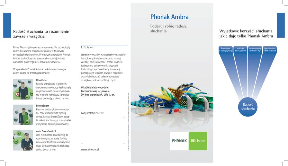 Podaruj sobie radość słuchania Radość słuchania to rozumienie zawsze i wszędzie W aparatach Phonak Ambra unikalna technologia zoom działa na trzech poziomach: UltraZoom Funkcja UltraZoom, w głośnym otoczeniu automatycznie skupia się na głosach osób zwróconych twarzą w stronę rozmówcy, ignorując hałasy docierające z boku i z tyłu. StereoZoom Kiedy w bardzo głośnym otoczeniu chcesz rozmawiać z jedną osobą, funkcja StereoZoom zawęża zakres słuchania, przez co hałas jest jeszcze bardziej redukowany. auto ZoomControl Jeśli nie możesz odwrócić się do rozmówcy, np. w aucie, funkcja auto ZoomControl automatycznie skupi się na dźwiękach dochodzących z boku i z tyłu. Life is on Rozumienie w każdej sytuacji Kontakt ze wszystkimi Zdumiewający rozmiar i styl Jesteśmy wrażliwi na potrzeby wszystkich ludzi, których dobro zależy od naszej wiedzy, pomysłowości i troski. A dzięki twórczemu pokonywaniu wyzwań technologii wprowadzamy innowacje, pomagające ludziom słyszeć, rozumieć oraz doświadczać całego bogactwa dźwięków, w które obfituje życie. Współdziałaj swobodnie. Porozumiewaj się pewnie. Żyj bez ograniczeń. Life is on. Twój protetyk słuchu: www.phonak.pl 028-0537-16/2010-11/WU Wydrukowano w Polsce © Phonak AG Wszystkie prawa zastrzeżone Firma Phonak jako pierwsza wprowadziła technologię zoom, by ułatwić rozumienie mowy w trudnych sytuacjach słuchowych. W nowych aparatach Phonak Ambra technologia ta jeszcze skuteczniej imituje naturalne postrzeganie i odbieranie dźwięku. Wyjątkowe korzyści słuchania jakie daje tylko Phonak Ambra Radość słuchania Spersonalizowane działanie Radość słuchania, zdumiewające rozmiary i styl Radość słuchania to kontakt ze wszystkimi Radość słuchania dzięki spersonalizowanemu działaniu Aparaty Phonak Ambra są dostępne w 14 modelach. Każdy z nich wyróżnia się na tle aparatów innych firm w zakresie miniaturyzacji i wydajności, nie wspominając o solidności i wygodzie. Wszystkie aparaty Phonak Ambra są zabezpieczone przed zawilgoceniem i zanieczyszczeniem, co zapewnia ich długotrwałe i niekłopotliwe użytkowanie. Dzięki akcesoriom bezprzewodowym firmy Phonak korzystanie z multimediów, komunikowanie się oraz praca stały się prawdziwą przyjemnością. Korzystanie z odbiorników TV, telefonów, odtwarzaczy MP3, GPS i komputerów cieszy i nie wymaga wysiłku. Aparaty Phonak Ambra automatycznie dostosowują się do sytuacji - sprawdzają się zarówno podczas prowadzenia cichej rozmowy czy słuchania muzyki, jak i w pełnej zgiełku restauracji. Dyskretne bez względu na wybrany model. Co więcej, aparaty Phonak Ambra mają system DuoPhone, który umożliwia słyszenie głosu rozmówcy w obojgu uszach już w chwili przyłożenia słuchawki do jednego ucha. Czystość brzmienia mowy jest niewiarygodna, a dźwięki tła zostają zredukowane. Zestawienie urządzenia Phonak TV Link z aparatem Ambra umożliwia przesłanie dźwięku z telewizora wprost do uszu użytkownika aparatu. Dzięki temu telewizję można oglądać wspólnie z rodziną, a głośność regulować oddzielnie. aparat zauszny aparat wewnątrzuszny Nikt nie zna wymagań użytkownika aparatu lepiej niż on sam. Czasami chce on skorygować niektóre ustawienia ręcznie. Dzięki funkcji FlexControl jedno przyciśnięcie przycisku wystarcza, by wybrać idealne ustawienie. Aparat Phonak Ambra jest na tyle inteligentny, że następnym razem sam dokona odpowiedniej korekty. Ciesz się, słysząc doskonale zawsze i wszędzie Korzyści Opcje Rozumienie mowy Przyjemność ze słyszenia pełnego spektrum dźwięków SoundRecover Rozumienie w otoczeniu pełnym dźwięków tła Skupianie się na dźwiękach dochodzących z przodu, redukcja dźwięków dochodzących z boku i z tyłu UltraZoom Premium Silniejsze skupienie się na głosie jednej osoby, większa redukcja szumu StereoZoom Dobre słyszenie osób będących poza zasięgiem wzroku auto ZoomControl Doświadczenie wygody słuchania NoiseBlock Rozumienie podczas rozmów telefonicznych i w czasie korzystania z różnych urządzeń Podczas telefonowania rozmówca słyszalny w obojgu uszach DuoPhone Bezpośrednie łączenie z telefonami komórkowymi, odbiornikami TV odtwarzaczami MP3 itp. iCOM, Phonak TV Link, Click‘nTalk Adaptacja do zmieniających się środowisk akustycznych Radość ciągłego i automatycznego dostosowywania się do każdego otoczenia SoundFlow Premium Słyszenie czystych dźwięków w pomieszczeniach z pogłosem EchoBlock Większy komfort słyszenia na otwartej przestrzeni WindBlock Słyszenie bez uciążliwego pisku WhistleBlock