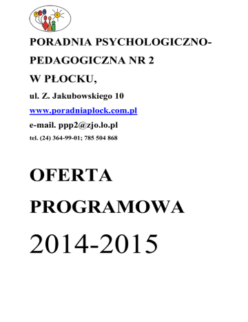 PORADNIA PSYCHOLOGICZNOPEDAGOGICZNA NR 2 W PŁOCKU, ul. Z. Jakubowskiego 10 www.poradniaplock.com.pl e-mail. [email protected] tel. (24) 364-99-01; 785 504 868 OFERTA PROGRAMOWA 2014-2015 Dyrektorzy przedszkoli, szkół podstawowych, gimnazjów i szkół ponadgimnazjalnych z terenu działania PP-P nr 2 w Płocku Wychodząc naprzeciw potrzebom dzieci, młodzieży, ich rodziców i nauczycieli przedstawiamy ofertę pomocy psychologiczno–pedagogicznej realizowanej przez pracowników Poradni Psychologiczno–Pedagogicznej nr 2 w Płocku w roku szkolnym 2014/2015. Zapraszamy na: 1. Badania diagnostyczne psychologiczne, pedagogiczne i logopedyczne zakończone wydaniem opinii lub orzeczenia. 2. Badania wstępne gotowości szkolnej dzieci pięcio- i sześcioletnich, psychologiczne i logopedyczne na terenie przedszkoli. 3. Diagnozę procesów integracji sensorycznej. 4. Indywidualną terapię pedagogiczną, psychologiczną i logopedyczną. 5. Pomoc w sytuacjach kryzysowych. 6. Indywidualne specjalistyczne (w tym seksuologiczne) konsultacje dla rodziców i nauczycieli w Poradni oraz na terenie placówek. 7. Zajęcia grupowe. Dodatkowo możliwy jest udział pracowników merytorycznych w radach pedagogicznych i spotkaniach zespołów specjalistów na terenie placówek, po uprzednim uzgodnieniu terminu (minimum na dwa tygodnie przed planowanym spotkaniem) oraz tematu z dyrektorem Poradni ze szczególnym uwzględnieniem szkół ogólnodostępnych, w których uczą się dzieci posiadające orzeczenia o potrzebie kształcenia specjalnego. Ponadto istnieje możliwość organizacji warsztatów dla dzieci i młodzieży, spotkań z rodzicami na uzgodniony wcześniej temat oraz warsztatów i konsultacji pedagogicznych, psychologicznych i logopedycznych dla nauczycieli i specjalistów pracujących w placówkach. Warunkiem przeprowadzenia diagnozy dziecka lub objęcia go pomocą psychologiczno-pedagogiczną i logopedyczną jest wola rodziców, prawnych opiekunów, lub pełnoletniego ucznia wyrażona w formie wniosku (druk w sekretariacie lub na stronie internetowej). Wnioski należy składać w sekretariacie Poradni w godzinach: poniedziałek, wtorek, czwartek - 8;00-18;00 środa, piątek 8;00-16;00 Procedura zapisów obejmuje złożenie wniosku o objęcie dziecka pomocą psychologiczno–pedagogiczną i logopedyczną (rodzaj zajęć) na terenie Poradni. O terminach spotkań wnioskodawcy zostaną poinformowani telefonicznie. O terminie realizacji wniosków decyduje kolejność zgłoszeń. Zapytania prosimy kierować pod nr tel. (24) 364-99-01; 785 504 868 – sekretariat Warunkiem realizacji zajęć grupowych na terenie placówek jest złożenie wcześniejszego zapotrzebowania pisemnego do dyrektora Poradni. Pierwszeństwo mają placówki, na terenie których nie były realizowane jeszcze dane zajęcia. Z poważaniem Marzenna Czarnecka dyrektor Poradni ZAJĘCIA GRUPOWE DLA DZIECI W WIEKU POMIEWOWLĘCYM Nazwa CEL ADREASAT programu Nasze szkraby TEREN OSOBY ODPOWIE- REALIZACJI DZIALNE Wspieranie rozwoju dzieci dwuletnich i trzyletnich oraz profilaktyka trudności adaptacyjnych w przedszkolu. dzieci w PORADNIA trzecim roku życia pedagog mgr Monika Lewandowska psycholog mgr Ewa Petrykowska DLA DZIECI PRZEDSZKLONYCH Nazwa programu Pszczółki – prowadzony Metodą Dobrego Startu CEL Rozwijanie funkcji językowych i percepcyjno – motorycznych. ADREASAT TEREN REALIZACJI dzieci 4-5 letnie z deficytami funkcji percepcyjno – motorycznych. PORADNIA OSOBY ODPOWIEDZIALNE pedagog mgr Agnieszka Wachowska pedagog mgr Joanna Piłatowicz Myślę, mówię, tworzę…w świecie czterolatka Wspieranie rozwoju dzieci oraz wychowawczej funkcji rodziców Dzieci w czwartym i piątym roku życia zdiagnozowane w Poradni PORADNIA pedagog mgr Monika Smolarek pedagog mgr Marzena Lichomska Hej przygodo! Zajęcia wspomagające rozwój poznawczy i emocjonalnospołeczny Dzieci 6 – letnie z opinią o potrzebie odroczenia spełniania obowiązku szkolnego w roku szkolnym 2014/2015, PORADNIA psycholog -mgr Ewa Petrykowska pedagog -mgr Joanna Piłatowicz PRO - MYK Usprawnianie funkcji percepcyjno – motorycznych Dzieci w wieku 5-6 lat z deficytami funkcji percepcyjno – motorycznych. PORADNIA pedagog mgr Maria Siemiątkowska pedagog. mgr Agnieszka Wachowska Dzieci w wieku od 4 do 6 roku życia, (2 grupy: nadruchliwość, trudności adaptacyjne). Cykl obejmuje 1h w tygodniu przez cały rok szkolny przedszkola (oddzielna sala gimnastyczna) psycholog -mgr Magdalena Chętka psycholog – mgr Magdalena Sobolewska Dzieci 3-6letnie, które sprawiają trudności wychowawcze i ich rodzice (grupa minimum 15 osób): zajęcia będą odbywać się raz w tygodniu (wtorek) i będą trwały 60 minut. Termin realizacji: październik 2014 r.– czerwiec 2015r; dodatkowo, jeżeli zbierze się grupa min. 15 osób, będzie Na terenie przedszkoli;. do realizacji zajęć potrzebna jest sala, która na czas zajęć będzie w pełni udostępniona pedagog mgr Monika Lewandowska psycholog mgr Ewa Petrykowska Fistaszki Wspieranie ogólnego rozwoju dzieci z nadruchliwością i trudnościami adaptacyjnymi Rozwijanie świadomości własnego ciała i usprawnianie ruchowe. Wesołe Wspieranie Przedszkoludki rozwoju emocjonalnego i społecznego dzieci oraz rozwijanie umiejętności wychowawczych rodziców” prowadzona „Szkoła dla rodziców” w formie warsztatowej. Logoludki Logorytmika Drabinka Złota rączka Plastuś Profilaktyka wad wymowy u dzieci. Edukacja rodziców w zakresie zapobiegania wadom wymowy i ich rozpoznawania Zajęcia logopedyczne o charakterze terapeutycznym Zajęcia wspierające rozwój poznawczy i emocjonalnospołeczny Dzieci w wieku 2;6-3;6 i ich rodzice PORADNIA logopeda mgr Karina BelknerMalowaniec Dzieci w wieku przedszkolnym. PORADNIA Dzieci 6 – letnie z opinią o potrzebie odroczenia spełniania obowiązku szkolnego w roku szkolnym 2014/2015, PORADNIA logopeda mgr Karina Belkner Malowaniec pedagog mgr Monika Lewandowska psycholog mgr Magda