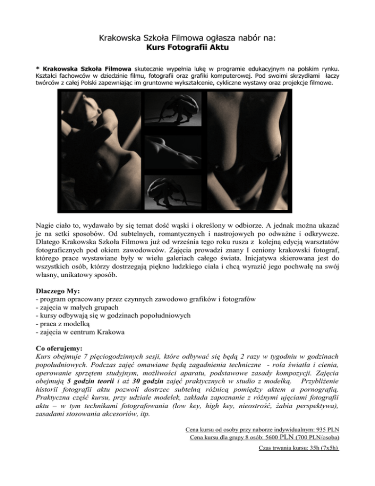 Krakowska Szkoła Filmowa ogłasza nabór na: Kurs Fotografii Aktu * Krakowska Szkoła Filmowa skutecznie wypełnia lukę w programie edukacyjnym na polskim rynku. Kształci fachowców w dziedzinie filmu, fotografii oraz grafiki komputerowej. Pod swoimi skrzydłami łaczy twórców z całej Polski zapewniając im gruntowne wykształcenie, cykliczne wystawy oraz projekcje filmowe. Nagie ciało to, wydawało by się temat dość wąski i określony w odbiorze. A jednak można ukazać je na setki sposobów. Od subtelnych, romantycznych i nastrojowych po odważne i odkrywcze. Dlatego Krakowska Szkoła Filmowa już od września tego roku rusza z kolejną edycją warsztatów fotograficznych pod okiem zawodowców. Zajęcia prowadzi znany I ceniony krakowski fotograf, którego prace wystawiane były w wielu galeriach całego świata. Inicjatywa skierowana jest do wszystkich osób, którzy dostrzegają piękno ludzkiego ciała i chcą wyrazić jego pochwałę na swój własny, unikatowy sposób. Dlaczego My: - program opracowany przez czynnych zawodowo grafików i fotografów - zajęcia w małych grupach - kursy odbywają się w godzinach popołudniowych - praca z modelką - zajęcia w centrum Krakowa Co oferujemy: Kurs obejmuje 7 pięciogodzinnych sesji, które odbywać się będą 2 razy w tygodniu w godzinach popołudniowych. Podczas zajęć omawiane będą zagadnienia techniczne - rola światła i cienia, operowanie sprzętem studyjnym, możliwości aparatu, podstawowe zasady kompozycji. Zajęcia obejmują 5 godzin teorii i aż 30 godzin zajęć praktycznych w studio z modelką. Przybliżenie historii fotografii aktu pozwoli dostrzec subtelną różnicą pomiędzy aktem a pornografią. Praktyczna część kursu, przy udziale modelek, zakłada zapoznanie z różnymi ujęciami fotografii aktu – w tym technikami fotografowania (low key, high key, nieostrość, żabia perspektywa), zasadami stosowania akcesoriów, itp. Cena kursu od osoby przy naborze indywidualnym: 935 PLN Cena kursu dla grupy 8 osób: 5600 PLN (700 PLN/osoba) Czas trwania kursu: 35h (7x5h)
