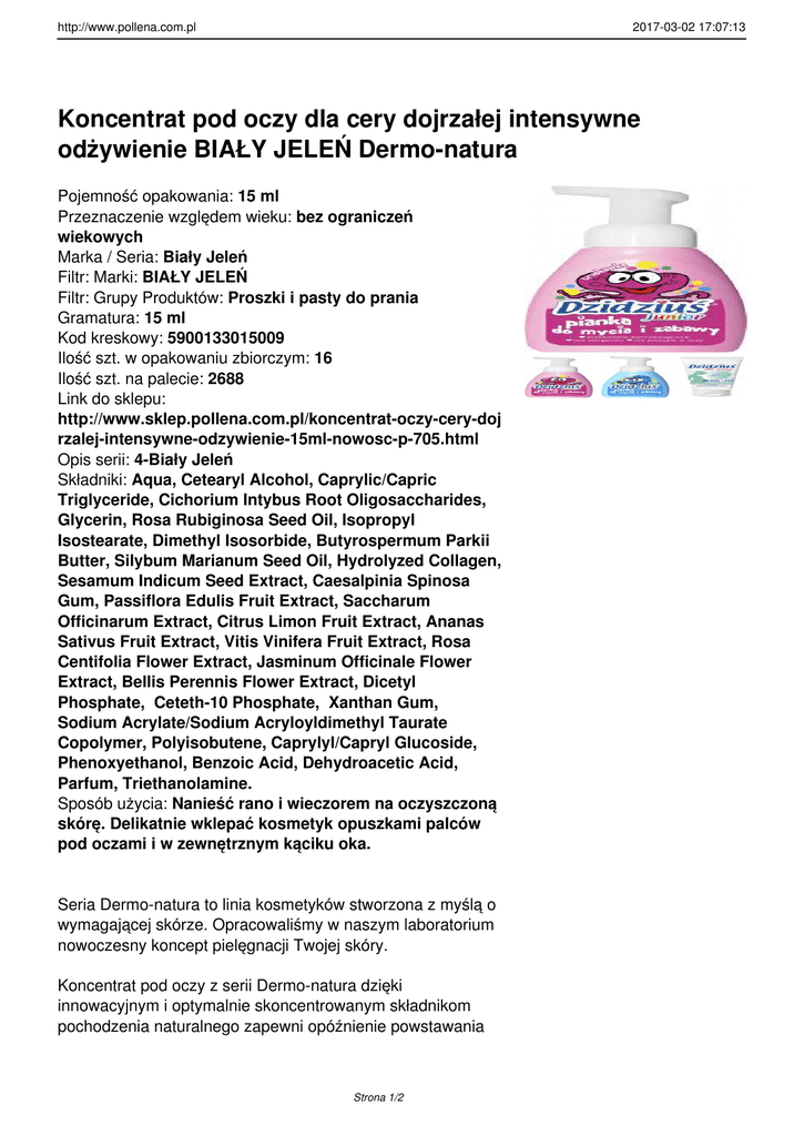 http://www.pollena.com.pl 2017-03-02 17:07:13 Koncentrat pod oczy dla cery dojrzałej intensywne odżywienie BIAŁY JELEŃ Dermo-natura Pojemność opakowania: 15 ml Przeznaczenie względem wieku: bez ograniczeń wiekowych Marka / Seria: Biały Jeleń Filtr: Marki: BIAŁY JELEŃ Filtr: Grupy Produktów: Proszki i pasty do prania Gramatura: 15 ml Kod kreskowy: 5900133015009 Ilość szt. w opakowaniu zbiorczym: 16 Ilość szt. na palecie: 2688 Link do sklepu: http://www.sklep.pollena.com.pl/koncentrat-oczy-cery-doj rzalej-intensywne-odzywienie-15ml-nowosc-p-705.html Opis serii: 4-Biały Jeleń Składniki: Aqua, Cetearyl Alcohol, Caprylic/Capric Triglyceride, Cichorium Intybus Root Oligosaccharides, Glycerin, Rosa Rubiginosa Seed Oil, Isopropyl Isostearate, Dimethyl Isosorbide, Butyrospermum Parkii Butter, Silybum Marianum Seed Oil, Hydrolyzed Collagen, Sesamum Indicum Seed Extract, Caesalpinia Spinosa Gum, Passiflora Edulis Fruit Extract, Saccharum Officinarum Extract, Citrus Limon Fruit Extract, Ananas Sativus Fruit Extract, Vitis Vinifera Fruit Extract, Rosa Centifolia Flower Extract, Jasminum Officinale Flower Extract, Bellis Perennis Flower Extract, Dicetyl Phosphate, Ceteth-10 Phosphate, Xanthan Gum, Sodium Acrylate/Sodium Acryloyldimethyl Taurate Copolymer, Polyisobutene, Caprylyl/Capryl Glucoside, Phenoxyethanol, Benzoic Acid, Dehydroacetic Acid, Parfum, Triethanolamine. Sposób użycia: Nanieść rano i wieczorem na oczyszczoną skórę. Delikatnie wklepać kosmetyk opuszkami palców pod oczami i w zewnętrznym kąciku oka. Seria Dermo-natura to linia kosmetyków stworzona z myślą o wymagającej skórze. Opracowaliśmy w naszym laboratorium nowoczesny koncept pielęgnacji Twojej skóry. Koncentrat pod oczy z serii Dermo-natura dzięki innowacyjnym i optymalnie skoncentrowanym składnikom pochodzenia naturalnego zapewni opóźnienie powstawania Strona 1/2 http://www.pollena.com.pl 2017-03-02 17:07:13 zmarszczek na wrażliwej skórze wokół oczu. Twoje spojrzenie stanie się rozświetlone, a kontur oka ujędrniony. Zauważysz widoczną redukcję zmarszczek, opuchlizny oraz cieni pod oczami. AKTYWNE KOMPONENTY Kompleks kwasów AHA: • zwiększa poziom nawilżenia i elastyczności skóry oraz normalizuje wygląd warstwy rogowej Ekstrakt z nasion sezamu: • widocznie wypełnia zmarszczki i poprawia kontury oka Ekstrakt liftingujący: • działa powierzchniowo napinając skórę, wyraźnie opóźnia procesy starzenia Kompozycja sensoryczna: • daje poczucie niezwykle miękkiej i jedwabistej w dotyku skóry • znacznie redukuje widoczność zmarszczek • zmniejsza szorstkość naskórka Produkt posiada badania okulistyczne i może być stosowany przez osoby noszące szkła kontaktowe. KONCENTRAT rekomendowany dla skóry z pierwszymi oznakami starzenia się, wrażliwej i atopowej. Strona 2/2