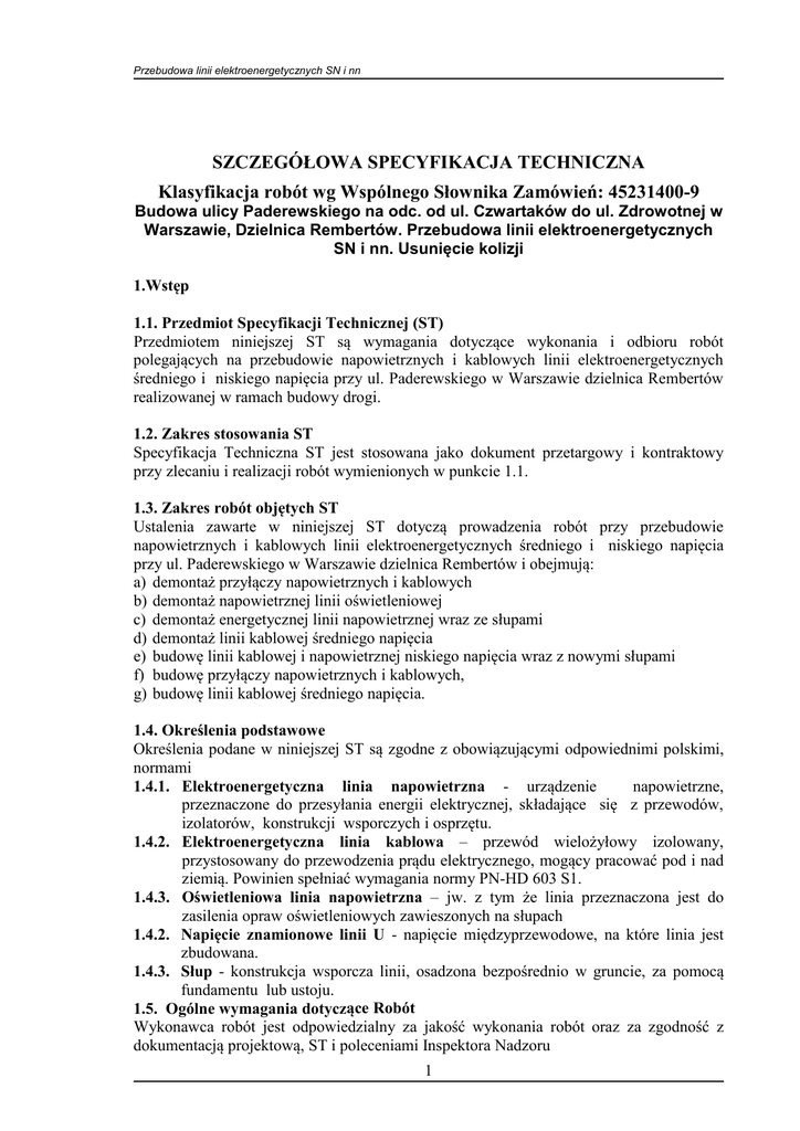 Przebudowa linii elektroenergetycznych SN i nn SZCZEGÓŁOWA SPECYFIKACJA TECHNICZNA Klasyfikacja robót wg Wspólnego Słownika Zamówień: 45231400-9 Budowa ulicy Paderewskiego na odc. od ul. Czwartaków do ul. Zdrowotnej w Warszawie, Dzielnica Rembertów. Przebudowa linii elektroenergetycznych SN i nn. Usunięcie kolizji 1.Wstęp 1.1. Przedmiot Specyfikacji Technicznej (ST) Przedmiotem niniejszej ST są wymagania dotyczące wykonania i odbioru robót polegających na przebudowie napowietrznych i kablowych linii elektroenergetycznych średniego i niskiego napięcia przy ul. Paderewskiego w Warszawie dzielnica Rembertów realizowanej w ramach budowy drogi. 1.2. Zakres stosowania ST Specyfikacja Techniczna ST jest stosowana jako dokument przetargowy i kontraktowy przy zlecaniu i realizacji robót wymienionych w punkcie 1.1. 1.3. Zakres robót objętych ST Ustalenia zawarte w niniejszej ST dotyczą prowadzenia robót przy przebudowie napowietrznych i kablowych linii elektroenergetycznych średniego i niskiego napięcia przy ul. Paderewskiego w Warszawie dzielnica Rembertów i obejmują: a) demontaż przyłączy napowietrznych i kablowych b) demontaż napowietrznej linii oświetleniowej c) demontaż energetycznej linii napowietrznej wraz ze słupami d) demontaż linii kablowej średniego napięcia e) budowę linii kablowej i napowietrznej niskiego napięcia wraz z nowymi słupami f) budowę przyłączy napowietrznych i kablowych, g) budowę linii kablowej średniego napięcia. 1.4. Określenia podstawowe Określenia podane w niniejszej ST są zgodne z obowiązującymi odpowiednimi polskimi, normami 1.4.1. Elektroenergetyczna linia napowietrzna - urządzenie napowietrzne, przeznaczone do przesyłania energii elektrycznej, składające się z przewodów, izolatorów, konstrukcji wsporczych i osprzętu. 1.4.2. Elektroenergetyczna linia kablowa – przewód wielożyłowy izolowany, przystosowany do przewodzenia prądu elektrycznego, mogący pracować pod i nad ziemią. Powinien spełniać wymagania normy PN-HD 603 S1. 1.4.3. Oświetleniowa linia napowietrzna – jw. z tym że linia przeznaczona jest do zasilenia opraw oświetleniowych zawieszonych na słupach 1.4.2. Napięcie znamionowe linii U - napięcie międzyprzewodowe, na które linia jest zbudowana. 1.4.3. Słup - konstrukcja wsporcza linii, osadzona bezpośrednio w gruncie, za pomocą fundamentu lub ustoju. 1.5. Ogólne wymagania dotyczące Robót Wykonawca robót jest odpowiedzialny za jakość wykonania robót oraz za zgodność z dokumentacją projektową, ST i poleceniami Inspektora Nadzoru 1 Przebudowa linii elektroenergetycznych SN i nn 2.Materiały Użyte do budowy wyroby budowlane powinny być oznakowane CE lub znakiem budowlanym zgodnie z „Ustawą o wyrobach budowlanych” (Dz. U. Nr 92 poz. 881 z 2004 r). Materiałami podstawowymi stosowanymi przy wykonywaniu robót wg niniejszej specyfikacji są: 2.1. Słupy strunobetonowe wirowane typu E oraz żerdzie żelbetowe typu ŻN powinny spełniać wymagania PN-B-03265:1987, 2.2. Osprzęt metalowy typu haki , trzony itp. powinny być ocynkowanie na gorąco 2.3. Przewody napowietrzne typu AsXSn powinny być użyte zarówno do budowy linii jak i przyłączy. Przewody powinny spełniać wymagania PN-HD 626 S1:2002/A2:2003 2.4. Ograniczniki przepięć zgodne z PN-EN 60099-4:2005 2.5. Bednarka Do wykonania uziomów taśmowych zastosować bednarkę ocynkowaną o wymiarach 25x4 mm 2.6. Pręty uziomowe. Do wykonania uziemień zastosować pręty o minimalnej średnicy 18 mm ocynkowane ogniowo. 2.6. Oprawa oświetleniowa. Istniejące oprawy należy zdemontować. 2.7. Składowanie materiałów Składowanie materiałów powinno odbywać się w warunkach zapobiegających zniszczeniu, uszkodzeniu lub pogorszeniu ich własności technicznych. 3. Sprzęt Wykonawca przystępujący do przebudowy elektroenergetycznych linii napowietrznych niskiego napięcia winien wykazać się możliwością korzystania z maszyn i sprzętu gwarantujących właściwą jakość robót: • samochodu dostawczego o ładowności 0,9 t, • minikoparki • przyczepy do przewożenia kabli • żurawia samochodowego 6t, • samochodu z podnośnikiem koszowym • ubijak wibracyjny. 4. Transport Materiały mogą być przewożone dowolnymi środkami transportu. Urządzenia transportowe powinny być odpowiednio przystosowane do przewozu elementów, konstrukcji itp. niezbędnych do wykonania robót przy przebudowie napowietrznych linii elektroenergetycznych niskiego napięcia. Przewożone na środkach transportu elementy powinny być zabezpieczone przed ich uszkodzeniem, przemieszczaniem i w opakowaniach zgodnych z wymaganiami producenta. Zaleca się dostarczanie materiałów do stanowisk montażowych bezpośrednio przed ich montażem w celu uniknięcia dodatkowego transportu wewnętrznego z magazynu budowy. 2 Przebudowa linii elektroenergetycznych SN i nn 5. Wykonanie Robót Prace wykonywać zgodnie z PN-75/E-05100, N SEP-E-003, PN-E-05100-1:1998, PN76/E-05125, N SEP-E-004 oraz Rozporządzenia Ministra Gospodarki z dnia 17 września 1999 r. w sprawie bezpieczeństwa i higieny pracy przy urządzeniach i instalacjach energetycznych (Dz. U. Nr 80 poz. 912 z 1999 r.) 5.1. Roboty przygotowawcze W ramach prac wstępnych należy : • przygotować drogę dojazdową do stanowiska pracy z dostosowaniem tego stanowiska do pracy ludzi i sprzętu • przygotować i ustawić sprzęt potrzebny do wykonywania prac zasadniczych, • rozstawić sprzęt ochronny, ostrzegawczy i informacyjny, • uzgodnić z PGE Dystrybucja S.A. Rejon Jeziorna wyłączenie linii przebudowywanej z pod napięcia i ewentualny nadzór z ramienia Zakładu. 5.2. Demontaż przyłączy napowietrznych. Część przyłączy należy całkowicie zdemontować, a część zdemontować jednostronnie i odpowiednio zabezpieczyć do momentu zamontowania na nowych słupach. 5.3. Demontaż oświetleniowej i energetycznej linii napowietrznej. Należy zdemontować przewody z istniej