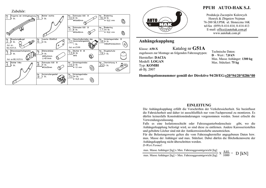 PPUH AUTO-HAK S.J. Zubehör: Produkcja Zaczepów Kulowych Henryk & Zbigniew Nejman 76-200 SŁUPSK ul. Słoneczna 16K tel/fax (059) 8-414-414; 8-414-413 E-mail: [email protected] www.autohak.com.pl Anhängekupplung Art. nrKL1G51A Art. nr-BL1G51A Art. nr-Z100 Klasse: A50-X Katalog nr G51A zugelassen zur Montage an folgenden Fahrzeugtypen: Hersteller: DACIA Modell: LOGAN Typ: KOMBI ab Bj. 2007 Technische Daten: D – Wert : 7,8 kN Max. Masse Anhänger: 1300 kg Max. Stützlast: 75 kg Homologationsnummer gemäß der Direktive 94/20/EG:e20*94/20*0286*00 EINLEITUNG Die Anhängekupplung erfüllt die Vorschriften der Verkehrssicherheit. Sie beeinflusst die Fahrsicherheit und daher ist ausschließlich nur vom Fachpersonal zu montieren. Es dürfen keinesfalls Konstruktionsänderungen vorgenommen werden. Sonst erlischt die Verwendungszulassung. Falls es eine Isolationsschicht oder Fahrzeugunterbodenschutz gibt, wo die Anhängerkupplung befestigt wird, so sind diese zu entfernen. Andere Karosseriestellen und gebohrte Löcher sind mit der Antikorrosionsfarbe anzustreichen. Für die Belastungswerte gelten die vom Fahrzeughersteller angegebenen Daten bzw. max. Masse der Anhänger und max. Stützlast. Dabei dürfen die Höchstkennwerte der Anhängekupplung nicht überschritten werden. D-Wert Formel: max. Masse Anhänger [kg] x Max. Fahrzeuggesamtgewicht [kg] max. Masse Anhänger [kg] + Max. Fahrzeuggesamtgewicht [kg] X 9,81 = 1000 D [kN] MONTAGE - und BETRIEBSANLEITUNG DER ANHÄNGEKUPPLUNG Anbauanleitung 1. 7 18 10 5 11 10 18 7 18 1 10 6 7 8 4 20 ! 9 Das Reserverad demontieren. Den Auspuff aus der letzten Aufhängung herunter lassen, das Hitzeschild abmontieren. 2. Die zwei verschlossenen Löcher an jeder Längsträgerinnseite finden und die Abdeckung entfernen. 3. Die Distanzhülsen (Pos. 7) einschließlich der großen Unterlegscheiben (Pos. 18) mit den Schrauben 10x90mm (Pos. 10) in die Löcher der Längsträger von der inneren Seite her, gemäß der Zeichnung, einsetzen. 4. Die Seitenhalter (Pos. 4 u. 5) von der unteren Seite des Fahrzeuges auf die Schrauben M10 anlegen und anziehen. 5. Den Tragarm (Pos. 1) zwischen die montierten Halter einschieben und mit den Schrauben M10x40mm (Pos. 11), die Schrauben gemäß den Angaben in der Tabelle festdrehen, festziehen. Die rechteckigen Laschen (Pos. 6) rechts nicht vergessen. 6. Das Automatengestell (Pos. 9) und den Steckdosenhalter (Pos. 3) mit den Schrauben M12x25mm (Pos. 8) fixieren und festziehen. Die Kupplungskugel gemäß der Anbauanleitung der Anhängekupplung mit dem schnelldemontierbaren Aufsatz anbringen. 7. Alle Schrauben gemäß den Angaben in der Tabelle festziehen. 8. Die Elektroinstallation gemäß der Bedienungsanleitung des Herstellers anschließen. 9. Falls nötig, den durch die Montage beschädigten Farbanstrich an der Anhängekupplung ausbessern. 10. Das Reserverad montieren. Den Auspuff in die letzten Aufhängung Einhängen und die Wärmeschutzplatte montieren. 3 7 2 11 17 Zeichnung 1 13 10 Die Anhängekupplung (Katalognummer G51A) ist für folgende Fahrzeugtypen zugelassen: DACIA LOGAN KOMBI, ab Bj. 2007 dient zum ziehen der Anhänger mit der Gesamtlast von 1300 kg und der Kugelstützlast von max. 75 kg. 18 Rechter Längsträger Drehmomente für Schrauben und Muttern 8.8: M6 - 11 Nm M 8 - 25 Nm M 10 - 50 Nm M 12 - 87 Nm M 14 - 138 Nm M16 - 210 Nm VON DEM HERSTELLER Die Zuverlässigkeit der Anhängekupplung ist jedoch auch von der ordnungsgemäßen Montage und der richtigen Nutzung abhängig. Daher werden Sie gebeten, sorgfältig die folgende Montageanleitung zu lesen und sich an die entsprechenden Anweisungen zu beachten. Die Anhängekupplung muss an den vom Fahrzeughersteller vorgeschriebenen Befestigungsstellen montiert werden. 15 4 Zeichnung 2 ACHTUNG Nach dem Anbau der Anhängekupplung sind die nationalen Vorschriften zur Anbauabnahme und zur Änderung der Fahrzeugpapiere zu beachten. Das Fahrzeug sollte mit seitlichen Blinkern und Rückspiegeln, deren Abstand mindestens der Anhängerbreite entspricht, ausgestattet werden. Alle Befestigungsschrauben sind nach ca. 1000 km Anhängerbetrieb zu prüfen und nachzuziehen. Die Kugel der Anhängekupplung ist sauber zu halten und zu fetten. Der Freiraum nach Anhang VII, Abbildung 30 der Richtlinie 94/20/EG ist zu gewährleisten Bei zulässigem Gesamtgewicht des Fahrzeuges FITTING INSTRUCTION Clamp mark in acc. with ISO PN 1 L 2 + 3 31 4 R 5 58R 6 54 7 58L Cables joining The instruction of the assembly 7 Left directional lights Rear fog lights Ground Right directional lights Right side parking lights Stoplights Left side parking lights 18 10 5 11 10 18 7 18 1 10 6 7 8 4 9 1. Disassemble a spare wheel unit and remove a muffler from a last rubber handle. 2. Find plugged holes into chassis’ members underneath the car (two per each side). Remove plugs. 3. To holes (from inside) put distance sleeves (pos. 7) with big washers (pos. 18) and bolts M10x90mm (pos. 10) as shown on the drawing 2. 4. From below the car, on protruding bolts M10 put side brackets pos. 4 and 5. Twist loosely. 5. Between mounted side brackets put main bar of the towing hitch (pos. 1) and fix with bolts M10x40mm (pos. 11) according to figure 1. Remember about fish-plates (pos. 6) on the right side! 6. Tighten all bolts according to the torque show in the table. 7. Fix body of the automat (pos. 9) and the socket plate (pos. 3) using bolts M12x25mm (pos. 8) from accessories. Place tow-ball (pos. 2) according to supplied instruction. 8. Connect electric wires of 7-pole socket according to the instruction of the car. (Recommended to make at authorized service station) 9. Complete paint layer damaged during installation. 7 ! 17 3 11 13 Fig. 1 2 10 Fig. 2 This towing hitch is designed to assembly in following car: DACIA LOGAN ESTATE produced since 2007, catalogue number G51A and is prepared to tow trailers max total weight up to 1300 kg and max vertical load 75 kg. From manufacturer Thank you for buying our product. Their reliabil