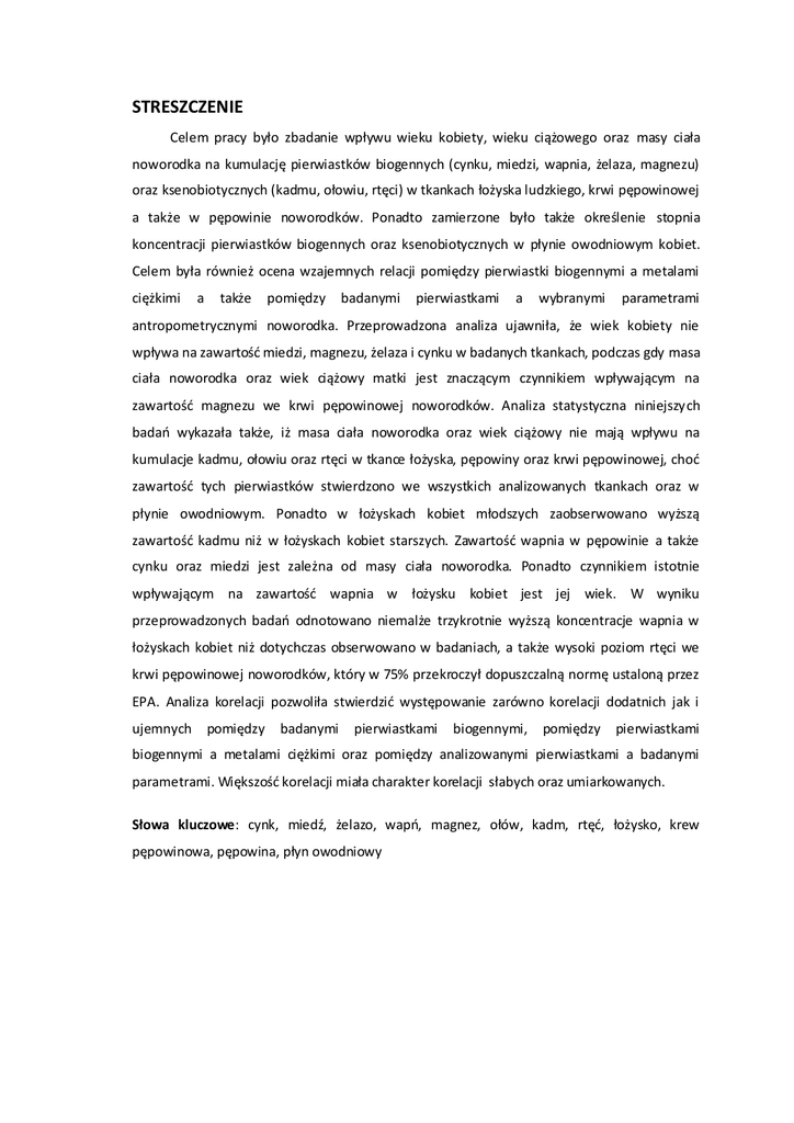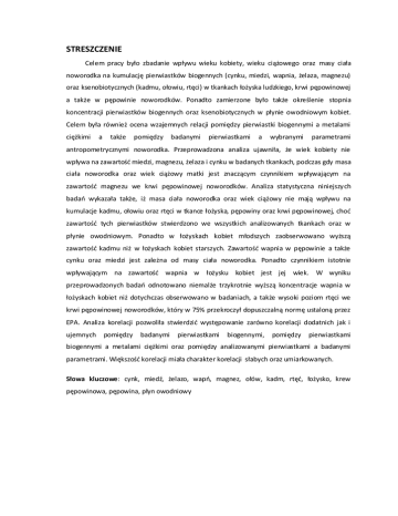 STRESZCZENIE Celem pracy było zbadanie wpływu wieku kobiety, wieku ciążowego oraz masy ciała noworodka na kumulację pierwiastków biogennych (cynku, miedzi, wapnia, żelaza, magnezu) oraz ksenobiotycznych (kadmu, ołowiu, rtęci) w tkankach łożyska ludzkiego, krwi pępowinowej a także w pępowinie noworodków. Ponadto zamierzone było także określenie stopnia koncentracji pierwiastków biogennych oraz ksenobiotycznych w płynie owodniowym kobiet. Celem była również ocena wzajemnych relacji pomiędzy pierwiastki biogennymi a metalami ciężkimi a także pomiędzy badanymi pierwiastkami a wybranymi parametrami antropometrycznymi noworodka. Przeprowadzona analiza ujawniła, że wiek kobiety nie wpływa na zawartość miedzi, magnezu, żelaza i cynku w badanych tkankach, podczas gdy masa ciała noworodka oraz wiek ciążowy matki jest znaczącym czynnikiem wpływającym na zawartość magnezu we krwi pępowinowej noworodków. Analiza statystyczna niniejszych badań wykazała także, iż masa ciała noworodka oraz wiek ciążowy nie mają wpływu na kumulacje kadmu, ołowiu oraz rtęci w tkance łożyska, pępowiny oraz krwi pępowinowej, choć zawartość tych pierwiastków stwierdzono we wszystkich analizowanych tkankach oraz w płynie owodniowym. Ponadto w łożyskach kobiet młodszych zaobserwowano wyższą zawartość kadmu niż w łożyskach kobiet starszych. Zawartość wapnia w pępowinie a także cynku oraz miedzi jest zależna od masy ciała noworodka. Ponadto czynnikiem istotnie wpływającym na zawartość wapnia w łożysku kobiet jest jej wiek. W wyniku przeprowadzonych badań odnotowano niemalże trzykrotnie wyższą koncentracje wapnia w łożyskach kobiet niż dotychczas obserwowano w badaniach, a także wysoki poziom rtęci we krwi pępowinowej noworodków, który w 75% przekroczył dopuszczalną normę ustaloną przez EPA. Analiza korelacji pozwoliła stwierdzić występowanie zarówno korelacji dodatnich jak i ujemnych pomiędzy badanymi pierwiastkami biogennymi, pomiędzy pierwiastkami biogennymi a metalami ciężkimi oraz pomiędzy analizowanymi pierwiastkami a badanymi parametrami. Większość korelacji miała charakter korelacji słabych oraz umiarkowanych. Słowa kluczowe: cynk, miedź, żelazo, wapń, magnez, ołów, kadm, rtęć, łożysko, krew pępowinowa, pępowina, płyn owodniowy SUMMARY The aim of this study was to assess the accumulation of biogenic metals (zinc, copper, calcium, iron, magnesium), xenobiotic metals (cadmium, lead, mercury) in human placenta, umbilical cord blood, umbilical cord and amniotic fluid. Furthermore, it was planned to determine the influence of woman age, gestational age and newborn’s weight on the concentration of these elements in tissues. The aim of this study was also to assess the relationship between the biogenic elements and heavy metals as well as between the analyzed elements and selected anthropometric newborn’s parameters. In result, it was noted that woman's age has no impact on the content of copper, magnesium, iron and zinc in placenta, in umbilical cord blood and umbilical cord, whilst the factors as newborn’s weight and mother's gestational influence significantly on the content of magnesium in cord blood. The statistical analysis of these studies showed that newborn’s weight and gestational age have no effect on the accumulation of cadmium, lead and mercury in the placenta, umbilical cord and umbilical cord blood, however the content of these elements were found in all analyzed tissues and amniotic fluids. In addition, the placentas of younger women had higher cadmium level than the placentas of older women. The content of calcium, zinc and copper in the umbilical cord depends on newborn's weight. The factor that has significant impact on the content of calcium in the human placenta is mother’s age. The results demonstrate that the concentration of calcium in placenta is almost triple higher than has been observed based on other researches. Additionally, it was observed extremely high level of mercury in cord blood of the newborns which exceeded the 75% of limit set by the EPA standard. The analysis of the correlation showed that there were both positive and negative correlations between the studied biogenic elements, between the biogenic elements and heavy metals, and between the analyzed elements and the studied parameters as well. Most of the correlations were weak or moderate correlations. Key words: zinc, copper, iron, calcium, magnsium, lead, cadmium, mercury, human placenta, umbilical cord blood, umbilical cord and amniotic fluid