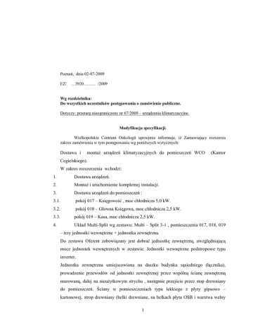 Poznań, dnia 02-07-2009 EZ/ …3920……... /2009 Wg rozdzielnika: Do wszystkich uczestników postępowania o zamówienie publiczne. Dotyczy: przetarg nieograniczony nr 67/2009 – urządzenia klimatyzacyjne. Modyfikacja specyfikacji. Wielkopolskie Centrum Onkologii uprzejmie informuje, iŜ Zamawiający rozszerza zakres zamówienia w tym postępowaniu wg poniŜszych wytycznych: Dostawa i montaŜ urządzeń klimatyzacyjnych do pomieszczeń WCO (Kantor Cegielskiego). W zakres rozszerzenia wchodzi: 1. Dostawa urządzeń. 2. MontaŜ i uruchomienie kompletnej instalacji. 3. Dostawa urządzeń do pomieszczeń : 3.1. pokój 017 – Księgowość , moc chłodnicza 5,0 kW. 3.2. pokój 018 – Głowna Księgowa, moc chłodnicza 2,5 kW. 3.3. pokój 019 – Kasa, moc chłodnicza 2,5 kW. 4. Układ Multi-Split wg zestawu: Multi – Split 3-1 , pomieszczenia 017, 018, 019 – trzy jednostki wewnętrzne + jednostka zewnętrzna. Do zestawu Oferent zobowiązany jest dobrać jednostkę zewnętrzną, uwzględniającą moce jednostek wewnętrznych w zestawie. Jednostki wewnętrzne podstropowe typu inverter. Jednostka zewnętrzna umiejscowiona na daszku budynku sąsiedniego (łącznika), prowadzenie przewodów od jednostki zewnętrznej przez wspólną ścianę zewnętrzną murowaną, dalej na nieuŜytkowym strychu , następnie przejście przez stop drewniany do pomieszczeń. Ściany w pomieszczeniach typu lekkiego z płyty gipsowo – kartonowej, strop drewniany (belki drewniane, na belkach płyta OSB i warstwa wełny 1 mineralnej). Od strony wewnętrznej pomieszczeń w korytarzu (nad trasą kabli i rurek) strop podwieszany rastrowy mocowany do stropu drewnianego, w pomieszczeniach strop gipsowo – kartonowy. Ilość przewodów od jednostki zewnętrznej do pierwszej jednostki wewnętrznej około 12m, do ostatniej około 18m. Uwzględnić naleŜy trzy pompki skroplin. 5. Oferent przed złoŜeniem oferty zobowiązany jest do przeprowadzenia wizji lokalnej, której celem jest zapoznanie się z układem pomieszczeń, ich lokalizacją, sugerowanym przez Zamawiającego miejscem ustawienia jednostki zewnętrznej. Przeprowadzenie wizji musi być pisemnie potwierdzone przez uprawnionego pracownika Działu Inwestycji i Remontów WCO. 6. Zastosowane urządzenia musza posiadać atesty i świadectwa dopuszczenia do obrotu w Polsce, Oferent zobowiązany jest załączyć te atesty i świadectwa oraz szczegółową informację na temat proponowanych urządzeń do oferty. 7. Zastosowane urządzenia musza posiadać instrukcję obsługi w języku polskim. 8. Zastosowane urządzenia muszą posiadać autoryzowany serwis na terenie województwa wielkopolskiego. 9. Doprowadzenie zasilania elektrycznego leŜy po stronie Zamawiającego. 10. Wymagany termin gwarancji – minimum 36 miesięcy. 11. W okresie obowiązywania gwarancji Wykonawca zapewni nieodpłatnie serwis zainstalowanych urządzeń, obejmujący wymagane okresowe przeglądy, czyszczenie, konserwację oraz usuwanie usterek i awarii. UWAGA! Zmienia się równieŜ terminy postępowania. Ustala się: • Termin składania ofert do dnia 15.07.2009 r. do godz. 9.00 • Termin otwarcia ofert w dniu 15.07.2009 r. o godz. 10.00 Z powaŜaniem, 2