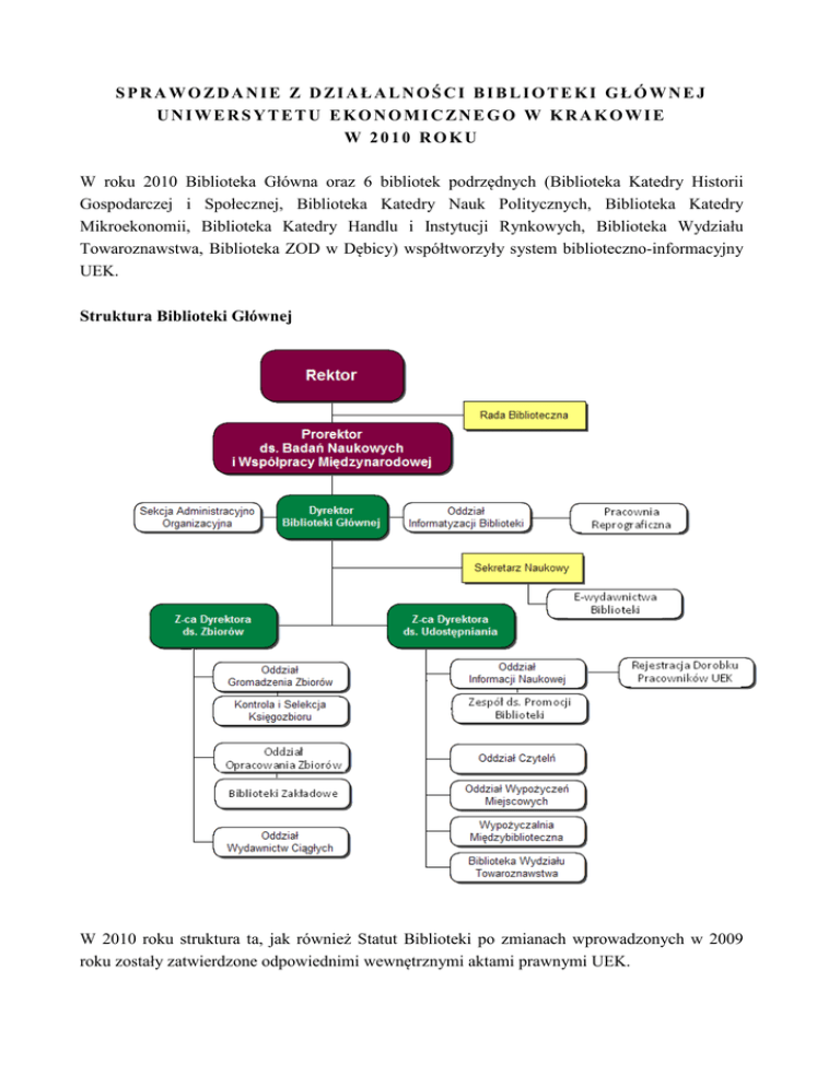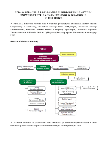 SPRAWOZDANIE Z DZIAŁALNOŚCI BIBLIOTEKI GŁÓWNEJ UNIWERSYTETU EKONOMICZNEGO W KRAKOWIE W 2010 ROKU W roku 2010 Biblioteka Główna oraz 6 bibliotek podrzędnych (Biblioteka Katedry Historii Gospodarczej i Społecznej, Biblioteka Katedry Nauk Politycznych, Biblioteka Katedry Mikroekonomii, Biblioteka Katedry Handlu i Instytucji Rynkowych, Biblioteka Wydziału Towaroznawstwa, Biblioteka ZOD w Dębicy) współtworzyły system biblioteczno-informacyjny UEK. Struktura Biblioteki Głównej W 2010 roku struktura ta, jak również Statut Biblioteki po zmianach wprowadzonych w 2009 roku zostały zatwierdzone odpowiednimi wewnętrznymi aktami prawnymi UEK. 1. Uchwała Senatu Uniwersytetu Ekonomicznego w Krakowie nr 6/2010 z dnia 4 marca 2010 roku w sprawie zmian w Statucie Uniwersytetu Ekonomicznego w Krakowie Uchwała wprowadza Załącznik nr 3 do Statutu Uniwersytetu Ekonomicznego w Krakowie w nowym brzmieniu. Załącznik ten określa organizację systemu biblioteczno-informacyjnego oraz zasady korzystania ze zbiorów Biblioteki (tzw. Statut Biblioteki). Najważniejsze zmiany to: • uzupełnienie zadań Biblioteki Głównej o prowadzenie zajęć z przysposobienia bibliotecznego oraz innych, na zlecenie jednostek organizacyjnych Uczelni Uzasadnienie: Zajęcia z przysposobienia bibliotecznego są niezbędne dla właściwego korzystania ze zbiorów Biblioteki. Są jednym z najskuteczniejszych sposobów informacji o zasadach korzystania z Biblioteki i o zbiorach Biblioteki. Zajęcia takie są prowadzone we wszystkich bibliotekach akademickich. Dla studentów studiów stacjonarnych bibliotekarze prowadzą je w ramach swoich obowiązków służbowych bez dodatkowego wynagrodzenia. uzupełnienie zadań Biblioteki Głównej o prowadzenie cyfrowego repozytorium UEK (biblioteka cyfrowa UEK), w którym gromadzone są kopie zabytków piśmiennictwa ze zbiorów Biblioteki Głównej, wybrane skrypty, monografie, rozprawy doktorskie oraz inne materiały Uzasadnienie: cyfryzacja zbiorów jest ważnym krokiem w kierunku zwiększenia efektywności ich wykorzystania. Umieszczenie tego zapisu w zadaniach statutowych Biblioteki umożliwia przyszłe starania o granty na prowadzenie tej działalności. Rzeczywiście w roku 2010 Uczelnia wystąpiła o grant na informatyzację Uczelni. Z pozyskanych środków zakupione będą dla Biblioteki wysoce zautomatyzowane skanery przeznaczone dla biblioteki cyfrowej. • uzupełnienie zadań Biblioteki Głównej o zadanie promocji i popularyzowania systemu informacyjno-bibliotecznego Uczelni – jego zbiorów, zasobów i usług. Uzasadnienie: Sformalizowanie tych obowiązków zwiększa szansę ich realizacji. Powołany następnie Zespół ds. Promocji czuwa nad wydawnictwami i wydarzeniami na Uczelni, starając się uwidocznić Bibliotekę i jej zbiory (stała rubryka w Kurierze UEK, udział w dniach otwartych Uczelni, itp.) • 2. Zarządzenie Rektora Uniwersytetu Ekonomicznego w Krakowie nr R-0121-51/2010 z dnia 19 lipca 2010 roku w sprawie zmiany w Regulaminie organizacyjnym Uniwersytetu Ekonomicznego w Krakowie Zarządzenie wprowadza Załącznik nr 3 do Regulaminu organizacyjnego Uniwersytetu Ekonomicznego w Krakowie, czyli Regulamin organizacyjny systemu bibliotecznoinformacyjnego Uniwersytetu Ekonomicznego w Krakowie w nowym, ujednoliconym brzmieniu. Najważniejsze zmiany to: • likwidacja zapisu, który zadanie prowadzenia zajęć z przysposobienia bibliotecznego umieszczał jako zadanie pozastatutowe Biblioteki 2 Uzasadnienie: Zadanie Biblioteki wpisano w Statut Biblioteki, zatwierdzony uchwałą Senatu w dniu 4 marca 2010 r. • rezygnacja z wymagania, aby zastępca dyrektora ds. zbiorów pełnił funkcję bibliotekarza systemowego (dawniej §4 ust. 2 pkt. 4). • rezygnacja z wymagania, aby zastępca dyrektora ds. udostępniania pełnił funkcję menedżera systemu ewidencji komputerowej wypożyczeń (dawniej §4 ust. 3 pkt 3). Uzasadnienie: Powiązanie wymienionych stanowisk z innymi funkcjami bibliotecznymi: dla zastępcy dyrektora do spraw zbiorów z funkcją bibliotekarza systemowego oraz dla zastępcy dyrektora do spraw udostępniania z funkcją menedżera systemu VTLS nie istnieje w żadnej bibliotece akademickiej i jest niepotrzebne. Te ważne, ale głęboko specjalistyczne funkcje, pełnią w bibliotekach pojedyncze osoby i tylko w naszej Bibliotece, niepotrzebnie i koniunkturalnie (na potrzeby roku 2006) powiązano je ze stanowiskami zastępców. Obecnie jedynym menedżerem systemu VTLS jest informatyk, osoba która nie spełnia wymagań na zastępcę Dyrektora Biblioteki ds. Udostępniania (nie jest bibliotekarzem). • przeniesienie podległości Oddziału Informacji Naukowej z pionu dyrektora ds. zbiorów w pion dyrektora ds. udostępniania (obecny §8 ust. 3 pkt 4). Uzasadnienie: dotychczasowa działalność OIN obok prowadzenia Czytelni Informacyjnej i Komputerowej (czyli funkcji udostępniających) obejmowała także prowadzenie Bibliotek Depozytowych i opracowanie nabytków tych bibliotek (funkcje związane ze zbiorami). Od roku 2009 najstarsza i najsilniej zaopatrywana w nabytki Biblioteka Depozytowa Banku Światowego decyzją Banku Światowego udostępnia zasoby wyłącznie na platformie cyfrowej. Katalog tej Biblioteki został zatem zamknięty. Biblioteka Depozytowa BŚ w obecnym kształcie gwarantuje UEK bezpłatny dostęp do zasobów cyfrowych (gdybyśmy nie mieli tej biblioteki, za dostęp musielibyśmy zapłacić). Wygasa jednak zupełnie jakakolwiek zasadność funkcjonowania OIN w pionie zbiorów. • rozszerzenie zakresu działania pracowni kserograficznej o skanowanie materiałów do Biblioteki Cyfrowej i przeniesienie nadzoru nad Pracownią Reprograficzną (zmiana nazwy) na Kierownika Oddziału Informatyzacji Biblioteki. W związku z tą zmianą skreśla się dawny §10 punkt 3 i wprowadza się ust. 2 do obecnego §10 Regulaminu. Zmieniono też zakres działań Oddziału Informatyzacji Biblioteki. Wyłączono z niego Sekcję Rejestracji 
