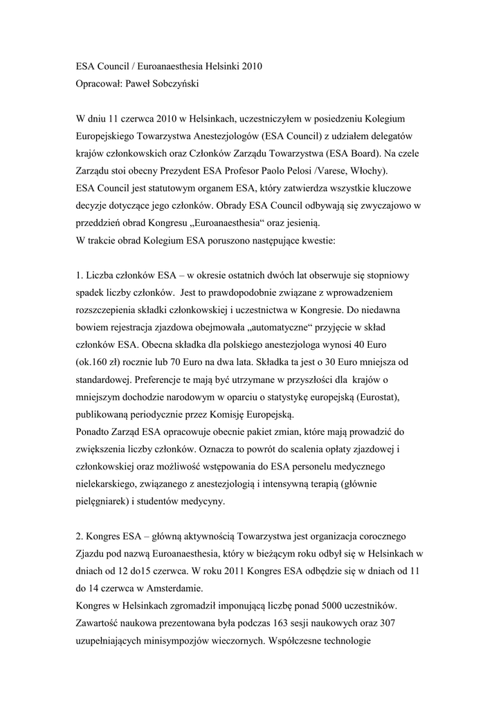 ESA Council / Euroanaesthesia Helsinki 2010 Opracował: Paweł