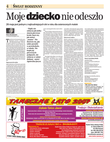 4 Świat rodzinny Głos Wielkopolski, sobota/niedziela 26/27 maja 2007 Moje dzieckonie odeszło 26 maja jest jednym z najtrudniejszych dni w roku dla osieroconych matek Edyta Wasielewska [email protected] ego dnia nie dostaną laurki znarysowanym sercem i podpisem: „Dla ukochanej mamy”. Dla osieroconych rodziców ten dzień jest niezwykle trudny, bo zmarłe dziecko nie przyniesie narysowanego serca, nie zostawi mokrego buziaka na policzku, nie powie wierszyka inie ofiaruje bukiecika samodzielnie uzbieranych kwiatów. Co roku, wPolsce piekło poronienia przeżywa ponad 40.000 kobiet, co roku 2000 rodzi się martwych dzieci. Osiemnastych urodzin nie dożywa blisko 5000 dzieci. Ich rodzice swoim macierzyństwem i ojcostwem mogą nacieszyć się czasem zaledwie przez kilka godzin, dni, czy tygodni. T Zaproszeni do nieba Agnieszka Jarysz z Poznania opowiada o swojej córeczce Julce. Jest osieroconą matką dziecka, którego bliskość czuła przez dziewięć miesięcy i które urodziło się martwe. Nie mogła się doczekać aż przyjdzie naświat. Głaskała brzuch, mówiła do niego. Tyle marzeń, planów. Dziecko przyszło na świat pięć dni po planowanym terminie porodu. Jego śmierć była ogromnym zaskoczeniem. Z sekcji zwłok nie dowiedziała się, dlaczego zmarło. – Pani córka urodziła się zdrowa – powiedział w rozmowie telefonicznej lekarz, a dla niej były to najokrutniejsze słowa, jakie kiedykolwiek usłyszała. – To dlaczego nie żyje? – krzyknęła w słuchawkę. Potem były długie dni, tygodnie pełne bólu icierpienia. Pamięta z nich przede wszystkim płacz, bez końca. Nie poradziłaby sobie, gdyby nie wsparcie najbliższych: męża, rodziny, przyjaciół. I poczucie, że jej córka jest w niebie, jest jej tam dobrze i nad nami – Nigdy nie zobaczę jak Julka stawia pierwsze kroki, bawi się, jak mówi: „mama”. Nie dowiem się, jak sobie poradzi w przedszkolu, w szkole. Nie kupię jej pierwszych podpasek, nie zobaczę w sukni ślubnej – mówi Agnieszka Jarysz czuwa. I jest jej grób, który często odwiedza. Potem kolejny etap przeżywania żałoby. Zrozumienie, że życie się jeszcze nie skończyło, toczy się dalej, choć już nic nie będzie tak jak przedtem. Śmierć dziecka to nie rozbita szklanka, o tym już się nigdy nie zapomina– takie opinie można przeczytać na forum internetowym dla rodziców, którzy stracili swoje dzieci. Niektóre kobiety nie chcą jednak pamiętać, bo z tak bolesnymi wspomnieniami nie potrafią żyć. Nieskutecznie. Potrzebują wsparcia innych. Męża, partnera, przyjaciółki, aczasami też psychologa, psychiatry, księdza. Niekoniecznie, aby pocieszyli, raczej wysłuchali, byli z nimi w tych trudnych chwilach. „Przykro mi zpowodu śmierci twojego dziecka” – to słowa, których oczekują. Pani Agnieszka żałuje, że nie dane jej było dobrze pożegnać się ze swoim dzieckiem. – To jest dla mnie najboleśniejsze. Z mężem widzieliśmy Julkę przez kilka chwil, ale jej nie przytuliłam, nie pocałowałam, choć ten jeden jedyny raz w swoim życiu. Nie wiedziałam, że mogę to zrobić. Nikt mnie nie zapytał: „Czy chce się pani pożegnać ze swoją córeczką?” Ile bym teraz dała, aby mieć choć jedno zdjęcie córki. Jest tylko zapis badania USG – mówi. Po chwili dodaje: – Przed oczami mam jej obraz, a właściwie moje wyobrażenie, jaka by teraz była. Miałaby teraz dziesięć miesięcy... Co mają zrobić matki, którym nie dane było zobaczyć swoje dziecko? W takiej sytuacji jest większość kobiet, które nie wiedzą, że mają prawo zobaczyć i pożegnać swoje dziecko. Ten moment, choć niezmiernie bolesny, paradoksalnie przynosi ulgę w cierpieniu. Dlatego tak ważne jest rozporządzenie ministra zdrowia, które obowiązuje od stycznia tego roku. Pozwala wydać ciało zmarłego dziecka, bez względu na czas trwania ciąży. Rodzice nie muszą już walczyć o prawo do pochowania dziecka, gdy urodziło się ono przedwcześnie, a tego nierzadko doświadczali przed ukazaniem się rozporządzenia. W USA oraz na Zachodzie normą jest, że po narodzinach martwego dziecka ktoś zpersonelu stwarza możliwość zrobienia zdjęć dziecka, odbija ślady stóp i rączek. Osieroceni rodzice Oprócz ogromnej tęsknoty za dzieckiem, które odeszło, rodzicom osieroconym brakuje życzliwości, zrozumienia, ciepła ze strony otoczenia. Najczęściej słyszą opinie, że są młodzi, jeszcze będą mieli kolejne dzieci, że nie zdążyli przyzwyczaić się do dziecka, że może byłoby ono chore i lepiej, że umarło. To boli, bo następne dziecko nigdy nie będzie lekiem na to utracone. Żałoba rodziców, którzy stracili swoje dzieci, czy to ze względu na poronienie, przedwczesny poród, wypadek lub chorobę jest nadal tematem tabu. Mimo iż psycholodzy od dawna wiedzą, że nie dokończona żałoba blokuje uczucia na wiele lat i źle wpływa na stosunek do kolejnego dziecka. Niechętnie mówimy o umieraniu, a śmierć dziecka jest dla nas szczególnie bolesna. To tak, jakby odwrócić porządek świata. Narodziny, dorastanie, dojrzałość, choroba, starość, a tu... Trudno się z tym pogodzić. – Moja przyjaciółka Agnieszka pięć lat temu, kiedy straciła swoją córeczkę, nie wiedziała gdzie szukać pomocy. W końcu udało jej się znaleźć kobietę, która doświadczyła podobnej tragedii. Aby z nią porozmawiać pojechała aż do Częstochowy. Mnie pomogło forum „Dlaczego”, dzięki któremu zrozumiałam, że ze stratą dziecka można nauczyć się żyć, choć jest to bardzo trudne – opowiada A. Jarysz. W grudniu 2004 roku w Warszawie powstało „Dlaczego” (www. dlaczego. org. pl) – Organizacja Rodziców po Stracie oraz Rodziców Dzieci Chorych, działająca przyTowarzystwie Przyjaciół Dzieci. Jej zadaniem jest niesienie pomocy iwsparcia rodzicom osieroconym. Czasami jedynym takim miejscem, gdzie nafo- rum dyskusyjnym mogą opowiedzieć swoją historię, przeczyta