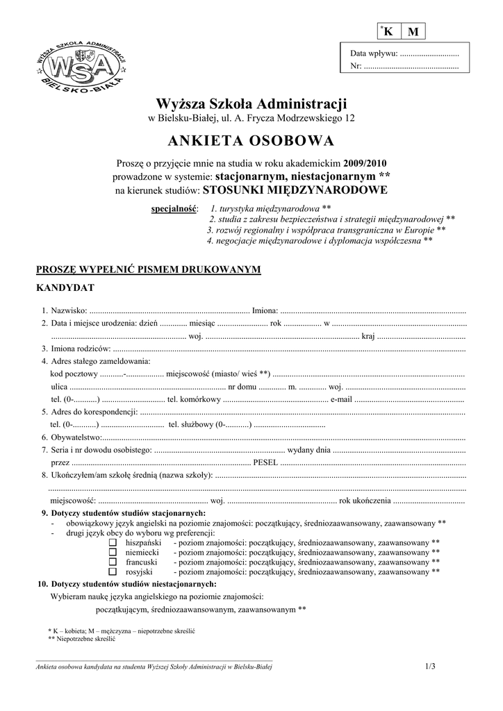 * K M Data wpływu: ............................ Nr: ............................................. WyŜsza Szkoła Administracji w Bielsku-Białej, ul. A. Frycza Modrzewskiego 12 ANKIETA OSOBOWA Proszę o przyjęcie mnie na studia w roku akademickim 2009/2010 prowadzone w systemie: stacjonarnym, niestacjonarnym ** na kierunek studiów: STOSUNKI MIĘDZYNARODOWE specjalność: 1. turystyka międzynarodowa ** 2. studia z zakresu bezpieczeństwa i strategii międzynarodowej ** 3. rozwój regionalny i współpraca transgraniczna w Europie ** 4. negocjacje międzynarodowe i dyplomacja współczesna ** PROSZĘ WYPEŁNIĆ PISMEM DRUKOWANYM KANDYDAT 1. Nazwisko: ............................................................................ Imiona: ........................................................................................ 2. Data i miejsce urodzenia: dzień ............. miesiąc ........................ rok .................. w ................................................................ ................................................................ woj. ......................................................................... kraj .......................................... 3. Imiona rodziców: ....................................................................................................................................................................... 4. Adres stałego zameldowania: kod pocztowy ...........-.................. miejscowość (miasto/ wieś **) ........................................................................................... ulica .......................................................................... nr domu ............. m. ............. woj. ......................................................... tel. (0-...........) .............................. tel. komórkowy .................................................. e-mail .................................................... 5. Adres do korespondencji: .......................................................................................................................................................... tel. (0-...........) .............................. tel. słuŜbowy (0-...........) .................................. 6. Obywatelstwo:............................................................................................................................................................................ 7. Seria i nr dowodu osobistego: .............................................................. wydany dnia ............................................................... przez ..................................................................................... PESEL ........................................................................................ 8. Ukończyłem/am szkołę średnią (nazwa szkoły): ....................................................................................................................... ...................................................................................................................................................................................................... miejscowość: .................................................... woj. .................................................... rok ukończenia .................................. 9. Dotyczy studentów studiów stacjonarnych: - obowiązkowy język angielski na poziomie znajomości: początkujący, średniozaawansowany, zaawansowany ** - drugi język obcy do wyboru wg preferencji: hiszpański - poziom znajomości: początkujący, średniozaawansowany, zaawansowany ** niemiecki - poziom znajomości: początkujący, średniozaawansowany, zaawansowany ** francuski - poziom znajomości: początkujący, średniozaawansowany, zaawansowany ** rosyjski - poziom znajomości: początkujący, średniozaawansowany, zaawansowany ** 10. Dotyczy studentów studiów niestacjonarnych: Wybieram naukę języka angielskiego na poziomie znajomości: początkującym, średniozaawansowanym, zaawansowanym ** * K – kobieta; M – męŜczyzna – niepotrzebne skreślić ** Niepotrzebne skreślić ______________________________________________________________________ Ankieta osobowa kandydata na studenta WyŜszej Szkoły Administracji w Bielsku-Białej 1/3 11. Podstawowe źródło utrzymania rodziny (właściwe zaznaczyć krzyŜykiem): - stosunek pracy □, - własna działalność gospodarcza □, - emerytura □, - renta □, - zasiłek dla bezrobotnych □ 12. Wypełniają osoby o orzeczonym stopniu niepełnosprawności (właściwe zaznaczyć krzyŜykiem): - stopień niepełnosprawności: lekki □, umiarkowany □, znaczny □ Proszę załączyć kserokopię orzeczenia (informacja zostanie wykorzystana tylko i wyłącznie do celów sprawozdawczych PFRON. Osoby o orzeczonym stopniu niepełnosprawności mogą starać się o stypendium specjalne). Prawidłowość danych zawartych w podaniu stwierdzam własnoręcznym podpisem Bielsko-Biała, dnia ................ 2009 r. ......................................................................... /czytelny podpis kandydata/ Do podania załączam: Lp. Spis dokumentów 1. Świadectwo dojrzałości w oryginale ukończenia ........................................ Pokwitowanie w przypadku odbioru dokumentów przez kandydata ....................................................................................................................... Odebrałem/am dnia: ................................... ........................................................ w .......................................................... ..................................................................... nr .......................................................... z dnia .......... ............ ............... r . ..................................................................... 2. Kserokopia świadectwa dojrzałości 3. Kserokopia świadectwa ukończenia szkoły średniej (do