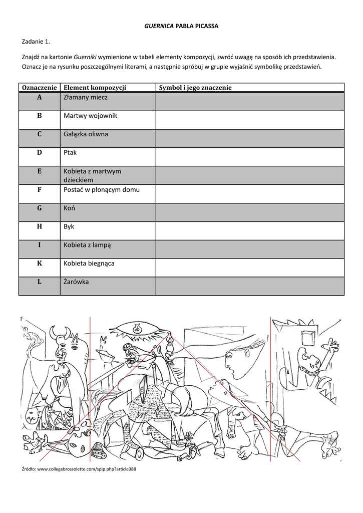 GUERNICA PABLA PICASSA Zadanie 1. Znajdź na kartonie Guerniki wymienione w tabeli elementy kompozycji, zwród uwagę na sposób ich przedstawienia. Oznacz je na rysunku poszczególnymi literami, a następnie spróbuj w grupie wyjaśnid symbolikę przedstawieo. Oznaczenie Element kompozycji A Złamany miecz B Martwy wojownik C Gałązka oliwna D Ptak E F Kobieta z martwym dzieckiem Postad w płonącym domu G Koo H Byk I Kobieta z lampą K Kobieta biegnąca L Żarówka Źródło: www.collegebrossolette.com/spip.php?article388 Symbol i jego znaczenie Zadanie 2. Po lewej i prawej stronie Guerniki znajdują się szkice przygotowawcze do dzieła. Obejrzyjcie je uważnie i spróbujcie odnaleźd rysunki: 1. Konia 2. Głowy byka 3. Kobiety z dzieckiem 4. Wojownika 5. Dłoni. Porównajcie je z kartonem gobelinu. Pablo Picasso niemal dokładnie jak w szkicach ukazał w Guernice dłonie. Przyjrzyj się dokładnie dziełu i szkicom. Do przedstawienia czyich rąk posłużył artyście szkic? Czy należą do różnych postaci czy do jednej? Uczniowie mogą byd podzieleni na dwie grupy – jedna pracuje przy szkicach z lewej strony, druga grupa przy szkicach z prawej strony. Następnie uczniowie pod opieką nauczyciela wymieniają się informacjami. Zadanie 3. Projekt kartonu Guerniki do gobelinu powstawał w porozumieniu z artystą – Pablem Picasso. Oryginalny obraz znajduje się w Muzeum Narodowym Królowej Zofii w Madrycie w Hiszpanii. Obraz ma wymiary 349 cm × 776cm, niemal identyczne jak prezentowany w Muzeum i jest namalowany farbami olejnymi na płótnie. Prezentowany na wystawie karton jest pracą przygotowawczą do gobelinu, rodzajem szkicu, według którego artystka Jaquline Renom de la Baume pracowała. Gobelin, inaczej nazywany arrasem albo tapiserią, to tkanina do oglądania z jednej strony, która przedstawia jakąś scenę, tak jak obraz, ale nie jest stworzona przy użyciu farb, tylko tkana z kolorowych nici. Proces ten wymaga dużo cierpliwości i czasu. Stworzenie tak wielkiego tkanego obrazu wymagało podzielenia szkicu na taką szerokośd pasów, by mogły zmieścid się pod krosnem. Ile pasów pionowych dostrzegasz w kartonie Guerniki? Po lewej stronie Guerniki znajdują się zdjęcia z warsztatu tkackiego oraz fotografie Picassa przyjaźniącego się z autorką gobelinu. Propozycja: uczniowie pracują w zespołach dwuosobowych bądź większych. Czy szkice i karton Guerniki się różnią kolorystycznie? Jakich kolorów artysta użył, szkicując, a jakich malując Guernikę? Wymieo kolory występujące w szkicach oraz w kartonie Guerniki wpisując je do tabelki. Szkice do Guerniki barwy Karton Guerniki barwy Jaka jest temperatura barw w szkicach do Guerniki, a jaka w kartonie do tapiserii – zimne czy ciepłe? Czy biel i szarości jako kolory mogą byd odbierane jako chłodne lub ciepłe barwy? Uzupełnij tabelkę, wstawiając „+”, jeśli zaobserwujesz ciepły kolor, a „-‘’, jeśli uznasz, że jest on zimny. Każdy zauważony przez Ciebie kolor odpowiednio oznacz plusem bądź minusem. Szkice do Guerniki temperatura barw Karton Guerniki temperatura barw Zadanie 4. Profesor Eduardo Camacho, zafascynowany tragedią i historią Guerniki Picassa, namalował cztery prace nawiązujące do tamtych wydarzeo. Jedna z nich prezentowana jest poniżej. Jak myślisz, którą z przedstawionych w Guernice postaci ona przypomina najbardziej? „Eduarda CamachoHommage dla Guerniki". Źródło: www.culture.pl/pl/wydarzenie/eduardo-camacho-hommage-a-guernica-i-picasso Zadanie 5. Jak Picasso ukazał ptaka w Guernice? Ptak jest symbolem wolności, również pokoju. Przedstawiany jest z gałązką oliwną w dzióbku. Picasso lubił malowad gołębie, również jako symbol pokoju na świecie. Nauczyciel może pokazad rysunek Picassa ukazujący gołębia pokoju, np. „La colombe de l'avenir” oraz porozmawiad z dziedmi na temat przedstawienia. Naszkicuj przy użyciu szerokiego pędzla swoją interpretację symbolu pokoju – gołębia. Przygotowały: Elżbieta Kazaoska Ewa Obara–Grączewska