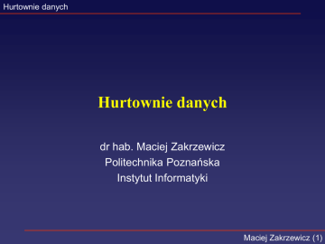 Hurtownie danych Hurtownie danych dr hab. Maciej Zakrzewicz Politechnika Poznańska Instytut Informatyki Maciej Zakrzewicz (1) Hurtownie danych Plan wykładu • • • • • • Wprowadzenie do Business Intelligence (BI) Hurtownia danych Zasilanie hurtowni danych (ETL) Przetwarzanie OLAP Projektowanie hurtowni danych Podsumowanie Maciej Zakrzewicz (2) Hurtownie danych Business Intelligence • Technologia informatyczna służąca przekształcaniu dużych wolumenów danych w informacje, a następnie przekształcaniu tych informacji w wiedzę • Adresowana do pracowników szczebla kierowniczego, wspomagająca podejmowanie ich decyzji • Stawia drastyczne wymagania wydajnościowe,przede wszystkim z powodu ogromnych rozmiarów danych, które podlegają przetwarzaniu • Skupiona wokół technologii hurtowni danych Maciej Zakrzewicz (3) Hurtownie danych Business Intelligence - przykłady zastosowań Maciej Zakrzewicz (4) Hurtownie danych Środowisko Business Intelligence model podstawowy systemy starej generacji decydent aplikacje analityczne operacyjne bazy danych korporacyjna hurtownia danych (Enterprise Data Warehouse) pliki zewnętrzne Maciej Zakrzewicz (5) Hurtownie danych Środowisko Business Intelligence z obszarem składowania decydent systemy starej generacji operacyjne bazy danych obszar składowania aplikacje analityczne korporacyjna hurtownia danych pliki zewnętrzne Maciej Zakrzewicz (6) Hurtownie danych Środowisko Business Intelligence z obszarem składowania i składnicami danych korporacyjna hurtownia danych decydent systemy starej generacji operacyjne bazy danych pliki zewnętrzne obszar składowania aplikacje analityczne oddziałowe składnice danych (data marts) Maciej Zakrzewicz (7) Hurtownie danych Hurtownia danych - definicja • „Hurtownia danych to tematyczna baza danych, która trwale przechowuje zintegrowane dane opisane wymiarem czasu” [Inmon96] • „Tematyczna baza danych” – dane dotyczą głównych obszarów działalności przedsiębiorstwa • „trwale przechowuje” – dane nie są zmieniane ani usuwane; hurtownia danych ma charakter przyrostowy • „zintegrowane dane” – dane dotyczące tego samego podmiotu stanowią całość • „opisane wymiarem czasu” – dane opisują zdarzenia historyczne, a nie tylko stan aktualny Maciej Zakrzewicz (8) Hurtownie danych Porównanie hurtowni danych z systemami klasycznymi Cecha System klasyczny Hurtownia danych czas odpowiedzi aplikacji ułamki sekundy – sekundy sekundy – godziny wykonywane operacje DML select czasowy zakres danych 30-60 dni 2-10 lat organizacja danych według aplikacji tematyczna rozmiar małe – duże duże – wielkie intensywność operacji dyskowych mała – średnia wielka Maciej Zakrzewicz (9) Hurtownie danych Porównanie hurtowni danych ze składnicami danych Cecha Hurtownia danych Składnica danych zasięg wykorzystywania przedsiębiorstwo wydział zakres tematyczny wielotematyczna jednotematyczna liczba źródeł danych wiele 1 – kilka czas implementacji i miesiące – lata wdrożenia miesiące Maciej Zakrzewicz (10) Hurtownie danych ETL: Extraction, Transformation, Loading • Ekstrakcja: odczyt źródłowych danych z operacyjnych baz danych, systemów starej generacji, plików zewnętrznych • Transformacja: łączenie danych, ich weryfikacja, walidacja, czyszczenie i znakowanie czasowe • Wczytywanie: wprowadzanie danych do docelowej hurtowni danych • Realizacja ETL jest najtrudniejszym zadaniem implementacji hurtowni danych (pochłania nawet 70% czasu) Maciej Zakrzewicz (11) Hurtownie danych Dwa tryby pracy hurtowni danych • Ładowanie danych – zwykle wykonywane w regularnych odstępach czasu, w porze niskiej aktywności użytkowników • Realizacja zapytań analitycznych – podstawowy rodzaj obciążenia systemu hurtowni danych ETL Zapytania ETL Zapytania ETL Zapytania czas Zmienność charakterystyki obciążenia systemu hurtowni danych to poważny problem konfiguracyjny Maciej Zakrzewicz (12) Hurtownie danych On-Line Analytical Processing (OLAP) • W środowisku BI konstruuje się aplikacje, które w wydajny sposób realizują złożone analizy danych • Umożliwiają analizę danych w trybie ad-hoc • Użytkownicy określają swoje żądania, co do analizy danych, a system bezpośrednio je realizuje • Przetwarzanie OLAP (ang. On-Line Analytical Processing), w odróżnieniu od klasycznego przetwarzania transakcyjnego OLTP (ang. On-Line Transaction Processing) • Bezpośrednio wspomagają pracę pracowników szczebla kierowniczego Maciej Zakrzewicz (13) Hurtownie danych Wielowymiarowy model danych • Dane na potrzeby przetwarzania OLAP są w naturalny sposób przedstawiane w postaci wielowymiarowej • Logiczne kostki stanowią sposób organizacji miar mających te same wymiary czas 1997 1996 1995 - 321 6mln 232 4mln 117 3mln 854 8mln 567 7mln 98 1mln 56 1mln 126 2mln 119 3mln Thriller Comedy sklep - Dallas - Denver - Seattle produkt Drama Maciej Zakrzewicz (14) Hurtownie danych Miary i wymiary • Fakty (ang. facts), miary (ang. measures) – Wartości ciągłe, numeryczne – Typowe miary: wartość sprzedaży, koszt, zysk • Wymiary (ang. dimensions) – Wartości dyskretne, niezmienne lub rzadko zmienne – Nadają znaczenie danym (miarom, faktom) – Typowe wymiary: klient, czas, produkt, sklep – Hierarchie (ang. hierarchies) umożliwiają organizację danych na różnych poziomach agregacji – Poziom (ang. level) reprezentuje pozycję w hierarchii – Atrybuty (ang. attributes) dostarczają dodatkowych informacji o danych, np. kolor, smak, dzień tygodnia Maciej Zakrzewicz (15) Hurtownie danych Agregacja, konsolidacja, zwijanie wymiaru • Przejście na ogólniejszy poziom wymiaru • Wybór operacji agregującej miarę, np. suma, średnia • Aggregation, consolidation, roll-up Maciej Zakrzewicz (16) Hurtownie danych Rozwijanie wymiaru • Przejście na bardziej szczegółowy poziom wymiaru • Roll-down, drill-down Maciej Zak