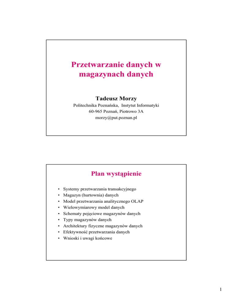 Przetwarzanie danych w magazynach danych Tadeusz Morzy 3ROLWHFKQLND3R]QDVND,QVW\WXW,QIRUPDW\NL 60-3R]QDPiotrowo 3A [email protected] 3ODQZ\VWSLHQLH • • • • • • • • • Systemy przetwarzania transakcyjnego Magazyn (hurtownia) danych Model przetwarzania analitycznego OLAP Wielowymiarowy model danych 6FKHPDW\SRM FLRZHPDJD]\QyZGDQ\FK Typy magazynów danych Architektury fizyczne magazynów danych (IHNW\ZQRüSU]HWZDU]DQLDGDQ\FK :QLRVNLLXZDJLNRFRZH 1 Systemy przetwarzania transakcyjnego • Celem systemów przetwarzania transakcyjnego (OLTP) jest usprawnienie ELH*FHM dziaáalnoci operacyjnej SU]HGVL ELRUVWZD • Komercyjnie dost pne systemy OLTP (systemy zarzdzania bazami danych SZBD) dostarczaj efektywnych rozwiza dla: – – – – efektywnego i bezpiecznego przechowywania danych, transakcyjnego odtwarzania danych, optymalizacji dost pu do danych, zarzdzania wspóábie*noci. Przetwarzanie analityczne • Systemy OLTP charakteryzuj si krótkimi i prostymi transakcjami, które operuj na niewielkiej cz ci danych przechowywanych w bazie danych • 0LDURFHQ\G]LDáDQLDV\VWHPX2/73MHVWSU]HSXVWRZRü transakcji • Systemy OLTP nie wspomagDM procesów analizy danych, JG\*Z]QDF]QLHPQLHMV]\Pstopniu wspomagaj operacje agregacji danych, wykonywania podsumowa czy te* optymalizacji záo*onych zapyta formuáowanych ad hoc 2 Przetwarzanie analityczne • Potrzeba przetwarzania analitycznego danych: – DQDOL]DG]LDáDOQRFLSU]HGVL ELRUVWZD – analiza trendów i anomalii – ]DU]G]DQLHSU]HGVL ELRUVWZHP – opracowywanie strategii marketingowej – DQDOL]DUHQWRZQRFLLQZHVW\FMLLWS • $SOLNDFMHDQDOLW\F]QHZ\PDJDM – integracji danych – ]áR*RQHMDQDOL]\GDQ\FK – eksploracji danych 3U]\NáDGRZHDSOLNDFMHDQDOLW\F]QH • 3U]\NáDG\ – bankowoü (np. identyfikacja czynników ryzyka wskazujcych, którzy klienci gwarantuj bezpieczne spáacanie udzielonego kredytu), – rynki finansowe (np. identyfikacja trendów w zakresie akcji spóáek gieádowych), – telekomunikacja (np. identyfikacja klientów zainteresowanych nowymi usáugami i nowymi warunkami wspóápracy z firm), – medycyna (np. analiza efektywnoci procedur leczenia pacjentów) 3 Pytania • Dane przechowywane w bazie danych zawieraj olbrzymi iloü potencjalnie u*ytecznej wiedzy, która mo*e zostaü u*yta w procesie podejmowania decyzji strategicznych dotyczcych dziaáalnoci przedsi biorstwa: – Czym ró*ni si klienci supermarketu w Poznaniu i Warszawie? – Jakie oddziaáy supermarketu miaáy „anormaln” sprzeda* w pierwszym kwartale 2002 r? – Jakie produkty miaáy najwi ksz dynamik sprzeda*y w roku 2001? – Jakie produkty klienci supermarketu kupuj najcz ciej razem? Architektura danych wiedza uzyskana z danych agregaty dla: kto, co, kiedy, gdzie,... Wiedza model logiczny opis danych (struktury danych) Metadane Schematy danych Agregaty kto, co, kiedy, gdzie Dane operacyjne 4 Magazyn (hurtownia) danych Magazyn danych jest „(...) zorientowan tematycznie, zintegrowan, zmienn w czasie i trwaá, kolekcj (baz) danych zaprojektowan i zaimplementowan dla potrzeb wspomagania podejmowania decyzji, w której dane odnosz si do okrelonej chwili czasowej” -- (W. H. Inmon, Building the Data Warehouse, QED Tech. Pub. Group, 1992) Magazyn danych • Zorientowany tematycznie - struktura danych w magazynie danych jest zorganizowana odpowiednio do podstawowego obszaru dziaáalnoci danego przedsi biorstwa: klienci, typy ubezpiecze, polisy, konta, *dania wypáat, itp. • Zintegrowany - magazyn danych musi zawieraü mo*liwie peány zbiór danych opisujcych dziaáalnoü danego przedsi biorstwa; dane opisujce dziaáalnoü przedsi biorstwa s najcz ciej rozproszone niezb dna staje si integracja danych z wielu heterogenicznych (ródeá. 5 Magazyn danych • 7UZDá\ - dane operacyjne s regularnie aktualizowane i zmieniane; magazyny danych s natomiast trwaáe - po zaáadowaniu danych do magazynu, dane nie s z magazynu usuwane. Po dezaktualizacji dane s archiwizowane • Zmienny w czasie - horyzont czasowy magazynu danych jest znaczco wi kszy ni* horyzont czasowy operacyjnych baz danych. Magazyny danych przechowuj caá histori danych (czyli zbiór migawek zrobionych w pewnych odst pach czasowych) i czas stanowi zawsze jeden z podstawowych elementów skáadowych magazynu danych 'ODF]HJRQLH]DOH*Q\PDJD]\QGDQ\FK • :]JO G\IXQNFMRQDOQH: • EUDNXMFH GDQH V\VWHP\ '&6 Z\PDJDM GDQ\FK KLVWRU\F]Q\FKNWyU\FKV\VWHP\2/73QLHSU]HFKRZXM • integracja danychV\VWHP\'&6Z\PDJDMLQWHJUDFMLL DJUHJDFMLGDQ\FK]Uy*Q\FKKHWHURJHQLF]Q\FK(UyGHá • MDNRüGDQ\FKUy*QH(UyGáDVWRVXMUy*QHUHSUH]HQWDFMH danych, kody, formaty, nazewnictwo 6 'ODF]HJRQLH]DOH*Q\PDJD]\QGDQ\FK • :]JO G\HIHNW\ZQRFLRZH: – =áR*RQH]DS\WDQLD2/$3]QDF]FRREQL*M HIHNW\ZQRüSU]HWZDU]DQLDWUDQVDNF\MQHJR – 6SHFMDOQHVWUXNWXU\GDQ\FKPHWRG\GRVW SX materializowane perspektywy i agregaty, specjalne PHWRG\LPSOHPHQWDFMLRSHUDFMLZVSLHUDMF\FK wielowymiarowy model danych – %UDNPHFKDQL]PXWUDQVDNFML]DU]G]DQLD ZVSyáELH*QRFLRGWZDU]DQLDSRDZDULL Architektura Aplikacje PDJD]\QGDQ\FK Data mart Metadane Data mart LQWHJUDWRU NRQZHUWHUPRQLWRU NRQZHUWHUPRQLWRU NRQZHUWHUPRQLWRU (UyGáRGDQ\FK (UyGáRGDQ\FK (UyGáRGDQ\FK 7 ,PSOHPHQWDFMDLSLHO JQDFMD magazynu • • • • • • • • Ekstrakcja danych Transformacja danych Czyszczenie danych Integracja danych àDGRZDQLHGDQ\FK Monitorowanie zmian 2GZLH*DQLHGDQ\FK Metadane i ich repozytorium ,PSOHPHQWDFMDLSLHO JQDFMD magazynu (1) • Ekstrakcja danych SRELHUDQLHGDQ\FK]H(UyGHáGDQ\FKEUDPNLVWDQGDUGRZH LQWHUIHMV\SURFHGXU\ZáDVQHPHFKDQL]Preplikacji) • Konwersja danych transformowanie danych z formatu wykorzystywanego w (ródle, do formatu wykorzystywanego w magazynie 8 ,PSOHPHQWDFMDLSLHO JQDFMD magazynu (2) • Czyszczenie danych proces ten ma na celu zapewnienie jakoci i poprawnoci danych w magazynie (dane z wielu (ródeá b d zawieraáy bá dy i anomalie: niespójne dáugoci pól, niespójne opisy atrybutów, ró*ne formaty danych, wartoci puste, naruszone ograniczenia integralnociowe; (ród