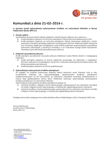 Komunikat z dnia 21-02-2014 r. w sprawie zasad optymalizacji wykorzystania środków na rachunkach Klientów w Biurze Maklerskim Banku BPH S.A. 1. Zasady ogólne Sprawdzanie pokrycia zleceń zakupu papierów wartościowych odbywa się w oparciu o: a) środki pieniężne zapisane na rachunku pieniężnym Klienta (koncie podstawowym) i/lub b) środki pieniężne zapisane na rachunku pieniężnym Klienta stanowiące należności z tytułu zawartych transakcji sprzedaży papierów wartościowych (koncie należności) jeżeli rozliczenie tych transakcji objęte jest zarządzanym przez KDPW systemem gwarantującym prawidłowe wykonanie zobowiązań z zawartych transakcji, a ich rozliczenie nastąpi przed rozliczeniem transakcji kupna dla której sprawdzane jest pokrycie. 2. Kolejność sprawdzania pokrycia Środki pieniężne są zaliczane na poczet pokrycia składanych przez Klienta zleceń w następującej kolejności: a) środki pieniężne zapisane na koncie należności poczynając od należności o najdalszym terminie rozliczenia nie późniejszym od terminu rozliczenia potencjalnej transakcji kupna, dla której sprawdzane jest pokrycie, b) środki pieniężne zapisane na koncie podstawowym. 3. Optymalizacja wykorzystania środków pieniężnych Ze względu na możliwe scenariusze realizacji zleceń złożonych przez Klientów oraz w celu umożliwienia Klientom jak najwcześniejszego dysponowania środkami pieniężnymi ewidencjonowanymi na Ich rachunkach, po rozliczeniu wszystkich transakcji zrealizowanych w trakcie sesji giełdowej/dnia obrotu Biuro Maklerskie wykonuje optymalizację wykorzystania środków pieniężnych na rachunkach Klientów. Optymalizacja wykorzystania środków pieniężnych polega na: a) zamianie środków z Rejestru Konta Operacyjnego wykorzystanych do rozliczenia transakcji na środki z Rejestru Konta Operacyjnego o możliwie jak najpóźniejszej dacie rozliczenia, b) zamianie środków z konta podstawowego wykorzystanych do rozliczenia transakcji na środki z Rejestru Konta Operacyjnego o możliwie jak najpóźniejszej dacie rozliczenia. Niniejszy Komunikat zastępuje Komunikat Dyrektora Biura Maklerskiego z dnia 2 listopada 2009 roku. Mariusz Bieńkowski Dyrektor Biura Maklerskiego Banku BPH S.A. Biuro Maklerskie Banku BPH SA ul. prof. Michała Życzkowskiego 16 31-864 Kraków infolinia: 801 377 933 (koszt jak za połączenie lokalne) e-mail: [email protected] Internet: www.bm.bph.pl