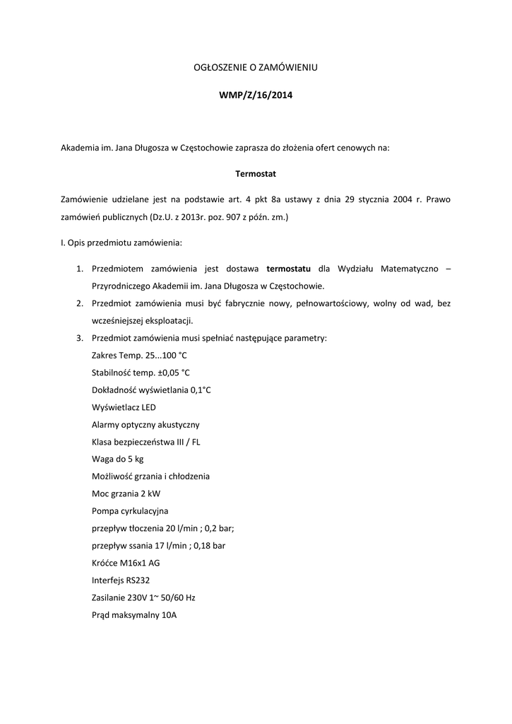 OGŁOSZENIE O ZAMÓWIENIU WMP/Z/16/2014 Akademia im. Jana Długosza w Częstochowie zaprasza do złożenia ofert cenowych na: Termostat Zamówienie udzielane jest na podstawie art. 4 pkt 8a ustawy z dnia 29 stycznia 2004 r. Prawo zamówień publicznych (Dz.U. z 2013r. poz. 907 z późn. zm.) I. Opis przedmiotu zamówienia: 1. Przedmiotem zamówienia jest dostawa termostatu dla Wydziału Matematyczno – Przyrodniczego Akademii im. Jana Długosza w Częstochowie. 2. Przedmiot zamówienia musi być fabrycznie nowy, pełnowartościowy, wolny od wad, bez wcześniejszej eksploatacji. 3. Przedmiot zamówienia musi spełniać następujące parametry: Zakres Temp. 25...100 °C Stabilność temp. ±0,05 °C Dokładność wyświetlania 0,1°C Wyświetlacz LED Alarmy optyczny akustyczny Klasa bezpieczeństwa III / FL Waga do 5 kg Możliwość grzania i chłodzenia Moc grzania 2 kW Pompa cyrkulacyjna przepływ tłoczenia 20 l/min ; 0,2 bar; przepływ ssania 17 l/min ; 0,18 bar Króćce M16x1 AG Interfejs RS232 Zasilanie 230V 1~ 50/60 Hz Prąd maksymalny 10A 4. Przedmiot zamówienia obejmuje dostarczenie do Zamawiającego zamawianego sprzętu, na koszt i ryzyko Wykonawcy. Miejsce dostawy: Instytut Chemii, Ochrony Środowiska i Biotechnologii Al. Armii Krajowej 13/15, 42-200 Częstochowa. 5. Termin realizacji: w ciągu 3 tygodni licząc od dnia otrzymania zamówienia. II. Składanie ofert Oferty cenowe wraz ze specyfikacją oferowanego sprzętu należy składać za pośrednictwem poczty elektronicznej na adres: [email protected] (Barbara Dondela) Termin składania ofert upływa dnia 16 lipca 2014 o godz. 12:00 III. Kryteria wyboru 1. Dokonując wyboru oferty Zamawiający będzie kierował się kryterium najniżej ceny brutto z wagą 100%. Zamawiający wybierze ofertę najkorzystniejszą, za którą zostanie uznana oferta z najniższą ceną (brutto) realizacji całości zamówienia spośród ofert spełniających wymagania określone przez Zamawiającego. 2. W przypadku, gdy niemożliwy będzie wybór oferty najkorzystniejszej, z uwagi na to, iż zostały złożone oferty o takiej samej cenie, Zamawiający wezwie Wykonawców, którzy złożyli te oferty do złożenia ofert dodatkowych. Wykonawcy składając oferty dodatkowe nie mogą zaoferować cen wyższych niż w złożonych ofertach. IV. Osoby do kontaktu 1. Wykonawca może kontaktować się z Zamawiającym: [email protected] Barbara Dondela , Tel. 603 783 774 2. Wszelkie zmiany oraz wyjaśnienia dotyczące niniejszego zamówienia, mogące mieć wpływ na złożenie oferty o udzieleniu zamówienia będą publikowane na stronie Biuletynu Informacji Publicznej Akademii im. Jana Długosza w Częstochowie.