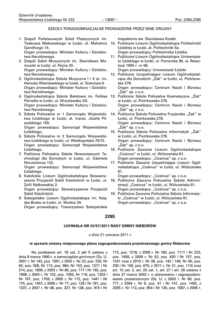 Dziennik Urzędowy Województwa Łódzkiego Nr 222 – 13097 – Poz. 2284,2285 SZKOŁY PONADGIMNAZJALNE PROWADZONE PRZEZ INNE ORGANY 2284 1. Zespół Państwowych Szkół Plastycznych im. Tadeusza Makowskiego w Łodzi, ul. Mahatmy Gandhiego 14. Organ prowadzący: Minister Kultury i Dziedzictwa Narodowego. 2. Zespół Szkół Muzycznych im. Stanisława Moniuszki w Łodzi, ul. Rojna 20. Organ prowadzący: Minister Kultury i Dziedzictwa Narodowego. 3. Ogólnokształcąca Szkoła Muzyczna I i II st. im. Henryka Wieniawskiego w Łodzi, ul. Sosnowa 9. Organ prowadzący: Minister Kultury i Dziedzictwa Narodowego. 4. Ogólnokształcąca Szkoła Baletowa im. Feliksa Parnella w Łodzi, ul. Wrocławska 3/5. Organ prowadzący: Minister Kultury i Dziedzictwa Narodowego. 5. Szkoła Policealna nr 1 Samorządu Województwa Łódzkiego w Łodzi, al. marsz. Józefa Piłsudskiego 159. Organ prowadzący: Samorząd Województwa Łódzkiego. 6. Szkoła Policealna nr 2 Samorządu Województwa Łódzkiego w Łodzi, ul. Wielkopolska 70/72. Organ prowadzący: Samorząd Województwa Łódzkiego. 7. Publiczna Policealna Szkoła Nowoczesnych Technologii dla Dorosłych w Łodzi, ul. Gabriela Narutowicza 122. Organ prowadzący: Samorząd Województwa Łódzkiego. 8. Katolickie Liceum Ogólnokształcące Stowarzyszenia Przyjaciół Szkół Katolickich w Łodzi, ul. Zofii Nałkowskiej 2. Organ prowadzący: Stowarzyszenie Przyjaciół Szkół Katolickich. 9. Salezjańskie Liceum Ogólnokształcące im. Księdza Bosko w Łodzi, ul. Wodna 34. Organ prowadzący: Towarzystwo Salezjańskie Inspektoria ņw. Stanisława Kostki. 10. Publiczne Liceum Ogólnokształcące Politechniki Łódzkiej w Łodzi, al. Politechniki 6a. Organ prowadzący: Politechnika Łódzka. 11. Publiczne Liceum Ogólnokształcące Uniwersytetu Łódzkiego w Łodzi, ul. Pomorska 96, ul. Rewolucji 1905 r. nr 66. Organ prowadzący: Uniwersytet Łódzki. 12. Publiczne Uzupełniające Liceum Ogólnokształcące dla Dorosłych „ʼnak” w Łodzi, ul. Piotrkowska 278. Organ prowadzący: Centrum Nauki i Biznesu „ʼnak” sp. z o.o. 13. Publiczna Szkoła Policealna Kosmetyczna „ʼnak” w Łodzi, ul. Piotrkowska 278. Organ prowadzący: Centrum Nauki i Biznesu „ʼnak” sp. z o.o. 14. Publiczna Szkoła Policealna Fryzjerska „ʼnak” w Łodzi, ul. Piotrkowska 278. Organ prowadzący: Centrum Nauki i Biznesu „ʼnak” sp. z o.o. 15. Publiczna Szkoła Policealna Informatyki „ʼnak” w Łodzi, ul. Piotrkowska 278. Organ prowadzący: Centrum Nauki i Biznesu „ʼnak” sp. z o.o. 16. Publiczne Zaoczne Liceum Ogólnokształcące „Cosinus” w Łodzi, ul. Wólczańska 81. Organ prowadzący: „Cosinus” sp. z o.o. 17. Publiczne Zaoczne Uzupełniające Liceum Ogólnokształcące „Cosinus” w Łodzi, ul. Wólczańska 81. Organ prowadzący: „Cosinus” sp. z o.o. 18. Publiczna Zaoczna Policealna Szkoła Administracji „Cosinus” w Łodzi, ul. Wólczańska 81. Organ prowadzący: „Cosinus” sp. z o.o. 19. Publiczna Zaoczna Policealna Szkoła Informatyki „Cosinus” w Łodzi, ul. Wólczańska 81. Organ prowadzący: „Cosinus” sp. z o.o. 2285 2285 UCHWAŁA NR XI/57/2011 RADY GMINY NIEBORÓW z dnia 21 czerwca 2011 r. w sprawie zmiany miejscowego planu zagospodarowania przestrzennego gminy Nieborów Na podstawie art. 18 ust. 2 pkt 5 ustawy z dnia 8 marca 1990 r. o samorządzie gminnym (Dz. U. 2001 r. Nr 142, poz. 1591, z 2002 r. Nr 23, poz. 220, Nr 62, poz. 558, Nr 113, poz. 984, Nr 153, poz. 1271 i Nr 214, poz. 1806, z 2003 r. Nr 80, poz. 717 i Nr 162, poz. 1568, z 2004 r. Nr 102, poz. 1055, Nr 116, poz. 1203 i Nr 167, poz. 1759, z 2005 r. Nr 172, poz. 1441 i Nr 175, poz. 1457, z 2006 r. Nr 17, poz. 128 i Nr 181, poz. 1337, z 2007 r. Nr 48, poz. 327, Nr 138, poz. 974 i Nr 173, poz. 1218, z 2008 r. Nr 180, poz. 1111 i Nr 223, poz. 1458, z 2009 r. Nr 52, poz. 420 i Nr 157, poz. 1241 oraz z 2010 r. Nr 28, poz. 142 i 146, Nr 40, poz. 230 i Nr 106, poz. 675, z 2011 r. Nr 21, poz. 113) oraz art. 15 ust. 2, art. 20 ust. 1, art. 27 i art. 29 ustawy z dnia 27 marca 2003 r. o planowaniu i zagospodarowaniu przestrzennym (Dz. U. z 2003 r. Nr 80, poz. 717, z 2004 r. Nr 6, poz. 41 i Nr 141, poz. 1492, z 2005 r. Nr 113, poz. 954 i Nr 130, poz. 1087, z 2006 r. Dziennik Urzędowy Województwa Łódzkiego Nr 222 – 13098 – Nr 45, poz. 319 i Nr 225, poz. 1635, z 2007 r. Nr 127, poz. 880, z 2008 r. Nr 199, poz. 1227, Nr 201, poz. 1237 i Nr 220, poz. 1413, z 2010 r. Nr 24, poz. 124, Nr 75, poz. 474, Nr 106, poz. 675, Nr 119, poz. 804, Nr 130, poz. 871, Nr 149, poz. 996, Nr 155, poz. 1043 oraz z 2011 r. Nr 32, poz. 159) w nawiązaniu do Uchwały Nr LIX/283/2010 z dnia 29 paňdziernika 2010 r. w sprawie przystąpienia do sporządzenia zmiany miejscowego planu zagospodarowania przestrzennego gminy Nieborów, fragmenty obszarów wsi: Arkadia, Bednary Kolonia, Bednary Wieņ, Bełchów, Bobrowniki, Dzierzgów, Dzierzgówek, Janowice, Julianów, Karolew, Kompina, Michałówek, Mysłaków, Nieborów, Patoki, Piaski i Sypień, Rada Gminy Nieborów uchwala, co następuje: Rozdział 1 Przepisy ogólne § 1. Nie sformułowano rozstrzygnięcia w zakresie nie uwzględnionych uwag do projektu uchwały w sprawie zmiany miejscowego planu zagospodarowania przestrzennego gminy Nieborów, fragmenty obszarów wsi: Arkadia, Bednary Kolonia, Bednary Wieņ, Bełchów, Bobrowniki, Dzierzgów, Dzierzgówek, Janowice, Julianów, Karolew, Kompina, Michałówek, Mysłaków, Nieborów, Patoki, Piaski i Sypień - uwagi nie wpłynęły. § 2. Stwierdza się, Ŋe treņć projektu uchwały w sprawie zmiany miejscowego planu zagospodarowania przestrzennego gminy Nieborów, fragmenty obszarów wsi: Arkadia, Bednary Kolonia, Bednary Wieņ, Bełchów, Bobrowniki, Dzierzgów, Dzierzgówek, Janowice, Julianów, Karolew, Kompina, Michałówek, Mysłaków, Nieborów, Patoki, Piaski i Sypień nie narusza ustaleń studium uwarunkowań i kierunków zagospodarowania przestrzennego gminy Nieborów. § 3. 1. Us