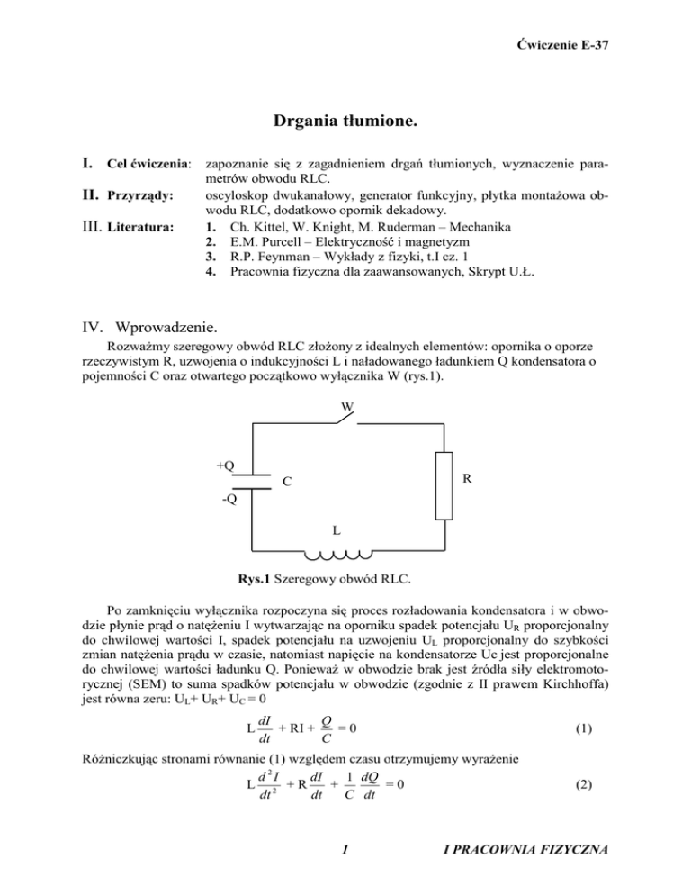 Ćwiczenie E-37 Drgania tłumione. I. Cel ćwiczenia: zapoznanie się z zagadnieniem drgań tłumionych, wyznaczenie paraII. Przyrządy: III. Literatura: metrów obwodu RLC. oscyloskop dwukanałowy, generator funkcyjny, płytka montaŜowa obwodu RLC, dodatkowo opornik dekadowy. 1. Ch. Kittel, W. Knight, M. Ruderman – Mechanika 2. E.M. Purcell – Elektryczność i magnetyzm 3. R.P. Feynman – Wykłady z fizyki, t.I cz. 1 4. Pracownia fizyczna dla zaawansowanych, Skrypt U.Ł. IV. Wprowadzenie. RozwaŜmy szeregowy obwód RLC złoŜony z idealnych elementów: opornika o oporze rzeczywistym R, uzwojenia o indukcyjności L i naładowanego ładunkiem Q kondensatora o pojemności C oraz otwartego początkowo wyłącznika W (rys.1). W +Q R C -Q L Rys.1 Szeregowy obwód RLC. Po zamknięciu wyłącznika rozpoczyna się proces rozładowania kondensatora i w obwodzie płynie prąd o natęŜeniu I wytwarzając na oporniku spadek potencjału UR proporcjonalny do chwilowej wartości I, spadek potencjału na uzwojeniu UL proporcjonalny do szybkości zmian natęŜenia prądu w czasie, natomiast napięcie na kondensatorze Uc jest proporcjonalne do chwilowej wartości ładunku Q. PoniewaŜ w obwodzie brak jest źródła siły elektromotorycznej (SEM) to suma spadków potencjału w obwodzie (zgodnie z II prawem Kirchhoffa) jest równa zeru: UL+ UR+ UC = 0 L dI Q + RI + =0 dt C (1) RóŜniczkując stronami równanie (1) względem czasu otrzymujemy wyraŜenie d 2I dI 1 dQ L 2 +R + =0 dt C dt dt 1 (2) I PRACOWNIA FIZYCZNA Ćwiczenie E-37 Po uwzględnieniu, iŜ natęŜenie prądu równe jest pochodnej ładunku względem czasu i dokonaniu prostych przekształceń otrzymujemy równanie róŜniczkowe rzędu drugiego, opisujące zaleŜność natęŜenia prądu od czasu d 2I R dI 1 + + I=0 2 L dt LC dt lub wprowadzając wielkość zwaną współczynnikiem tłumienia R δ= 2L i wielkość będącą częstością kątową drgań swobodnych (tj. drgań w obwodzie LC) 1 ω 02 = LC równanie w postaci (3) (4) (5) d 2I dI + 2δ + ω 02 I = 0 (6) 2 dt dt Jeśli współczynnik tłumienia spełnia warunek tzw. słabego tłumienia δ < ω 0 , to rozwiązaniem równania ( 6 ) jest funkcja I(t) = Ioe −δt sin(ωt) gdzie ω jest częstością drgań natęŜenia prądu ω= (7) ω 02 − δ 2 (8) a Io nazywamy amplitudą początkową natęŜenia prądu. Jak wynika ze wzoru ( 7 ) drgania natęŜenia prądu w obwodzie RLC przy słabym tłumieniu mają charakter drgań harmonicznych tłumionych czyli drgań harmonicznych o eksponencjalnie malejącej w czasie amplitudzie Ioexp ( -δ t). W szczególności okres tych drgań T = 1/f, gdzie 2 1 R − (9) LC 2 L nie zaleŜy od wartości początkowej ładunku Qo (takŜe amplitudy początkowej drgań Io) i słabo zaleŜy od R dla δ << ωo ( tj. ω = ωo). Przypadek, gdy δ=ω0 nazywamy przypadkiem tłumienia krytycznego – w obwodzie nie powstają drgania harmoniczne, a natęŜenie prądu maleje eksponencjalnie wraz z czasem I(t) = Ioexp( -δt). Dla δ > ωo czyli R2 > 4L/C równanie róŜniczkowe opisujące drgania w obwodzie nie posiada rozwiązania w dziedzinie funkcji rzeczywistych, co oznacza iŜ fizycznie w obwodzie nie powstają drgania harmoniczne, a kondensator szybko rozładowuje się. Współczynnikowi tłumienia δ przypisać moŜna prostą interpretację fizyczną. Wprowadźmy w tym celu parametr τ = 1/δ zwany czasem relaksacji lub charakterystycznym czasem tłumienia. Łatwo wówczas zauwaŜyć, iŜ w czasie τ amplituda natęŜenia prądu maleje e – krotnie. A zatem porównanie współczynnika tłumienia δ z częstością drgań swobodnych ωo (drgań dla R = 0) sprowadza się w istocie rzeczy do porównania czasu τ, w którym amplituda natęŜenia prądu maleje e – krotnie wskutek wydzielania ciepła w oporniku, a okresem T (ściśle mówiąc okresem podzielonym przez 2π, gdyŜ ω = 2π/T ) drgań polegających na bezstratnym procesie przechodzenia energii pola elektrycznego w naładowanym kondensatorze w energię pola magnetycznego w uzwojeniu, przez które przepływa prąd i procesie odwrotnym. Jeśli charakterystyczny czas tłumienia τ jest odpowiednio krótki w porównaniu z okresem 1 f= 2π 2 I PRACOWNIA FIZYCZNA Ćwiczenie E-37 drgań dla R = 0, to w obwodzie nie powstają drgania – rozładowanie kondensatora nie ma charakteru oscylacyjnego. V. Metoda pomiaru. Bezpośrednia obserwacja drgań harmonicznych tłumionych w obwodzie RLC o typowych parametrach jest moŜliwa pod warunkiem zastosowania oscyloskopu cyfrowego lub odpowiedniego interfejsu pomiarowego sprzęŜonego z komputerem, gdyŜ mamy do czynienia z szybko przebiegającym w czasie zjawiskiem nieperiodycznym – natomiast zwykły oscyloskop analogowy przeznaczony jest do obserwacji zjawisk powtarzających się w czasie ze sto- R C L Rys.2a Szeregowy obwód RLC ze źródłem SEM w postaci fali prostokątnej . SEM czas 0 T/2 T 3/2T Rys.2b Prostokątna fala napięcia. SEM − + RG R C RL Rys.2c Schemat zastępczy szeregowego obwodu RLC. 3 I PRACOWNIA FIZYCZNA Ćwiczenie E-37 sunkowo znaczną częstością. Dlatego teŜ najprostszym sposobem obserwacji drgań tłumionych jest wzbudzanie ich prostokątną, symetryczną falą napięcia. JeŜeli w szeregowy obwód RLC włączymy źródło SEM w postaci generatora prostokątnej fali napięcia (rys.2a i 2b) to schemat zastępczy powstałego w ten sposób układu przyjmie postać ukazaną na rys.2c, o ile rozwaŜać będziemy przedział czasu [0, T / 2], gdzie T jest okresem fali prostokątnej. Opór RG oznacza na tym schemacie rzeczywisty opór wyjściowy (wewnętrzny) generatora, a RL opór rzeczywisty (dla prądu stałego) uzwojenia o indukcyjności L. Na podstawie powyŜszego schematu moŜemy napisać równania : dI Q dI Q E=L + + (R + RG + RL) I = L + + RZ I = const ( 10 ) dt C dt C dE d 2I 1 dI = L 2 + RZ + I=0 ( 11 ) dt C dt dt E – wartość stałej w czasie siły elektromotorycznej (SEM). Postać równania ( 11 ) jest identyczna z postacią r