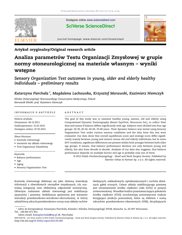 otolaryngologia polska 66 (2012) 274–279 Dostępne online www.sciencedirect.com journal homepage: www.elsevier.com/locate/otpol Artykuł oryginalny/Original research article Analiza parametrów Testu Organizacji Zmysłowej w grupie normy otoneurologicznej na materiale własnym – wyniki wste˛pne Sensory Organization Test outcomes in young, older and elderly healthy individuals – preliminary results Katarzyna Pierchała *, Magdalena Lachowska, Krzysztof Morawski, Kazimierz Niemczyk Klinika Otolaryngologii Warszawskiego Uniwersytetu Medycznego, Poland Kierownik Kliniki: prof. Kazimierz Niemczyk informacje o artykule abstract Historia artykułu: The goal of this study was to examine healthy young, mature, old and elderly using Otrzymano: 06.12.2011 Computerized Dynamic Posturography (Smart EquiTest, Neurocom Int,), to collect their Zaakceptowano: 31.01.2012 data and assess if balance differs significantly with age. Subjects were divided into four age Doste˛pne online: 07.05.2012 groups: 20–30, 40–50, 60–69, 70–80 years. Their dynamic balance was tested using Sensory Organization Test under various sensory conditions and the data from this test were Słowa kluczowe: kontrola równowagi evaluated. Our data show that overall equilibrium score and strategy score differ signifi- starzenie sie˛ układu równowagi Test Organizacji Zmysłowej SOT conditions, significant differences are present within both younger between both older cantly mainly between young and mature versus old and elderly individuals, but in some age groups. It means, that balance performance declines not only between young and elderly, but also from decade to decade. Analysis of our data also suggests, that balance Keywords: Balance performance Age performance depends on multiple factors and age is probably only one of them. © 2012 Polish Otorhinolaryngology - Head and Neck Surgery Society. Published by Elsevier Urban & Partner Sp. z o.o. All rights reserved. Aging Sensory Organization Test Kontrole˛ równowagi definiuje sie˛ jako złożona˛ interakcje˛ informacji z obwodowych narza˛dów zmysłowych, ich centralna˛ integracje˛ oraz efektywna˛ odpowiedź motoryczna˛. Głównym zadaniem układu równowagi jest stabilizacja spojrzenia i postawy. Stabilizacja spojrzenia jest wyrazem interakcji przedsionkowo-wzrokowo-okoruchowej, w której udział biora˛ odruch przedsionkowo-oczny oraz układy ruchów śledza˛cych, sakkadowych, optokinetycznych i ruchów zbieżnych gałek ocznych. Celem układu stabilizuja˛cego postawe˛ jest utrzymywanie środka cie˛żkości ciała (COG) w pozycji zrównoważonej. Wszelkie bodźce przemieszczaja˛ce położenie środka cie˛żkości (COG) uruchamiaja˛ automatyczne reakcje koryguja˛ce (reakcje posturalne), które sa˛ efektem i suma˛ odruchów przedsionkowo-rdzeniowych (VSR), decyduja˛cych * Adres do korespondencji: Katarzyna Pierchała, Katedra i Klinika Otolaryngologii WUM, Banacha 1a, 02-097 Warszawa. Tel.: +48 604 471 951. Adres email: [email protected] (K. Pierchała). 0030-6657/$ – see front matter © 2012 Polish Otorhinolaryngology - Head and Neck Surgery Society. Published by Elsevier Urban & Partner Sp. z o.o. All rights reserved. http://dx.doi.org/10.1016/j.otpol.2012.05.005 otolaryngologia polska 66 (2012) 274–279 o właściwym napie˛ciu w mie˛śniach antygrawitacyjnych, odruchów miotatycznych, powstaja˛cych na skutek pobudzenia proprioceptorów mie˛śni kontroluja˛cych zasadnicze dla strategii ruchowych stawy, oraz ośrodkowych odruchów długope˛tlowych. Narza˛dem wykonawczym dla odruchów posturalnych jest układ kostno-szkieletowy wraz z zaopatruja˛cymi je mie˛śniami. Definicja równowagi w poje˛ciu czynnościowym oznacza możliwość utrzymania stabilnej pozycji stoja˛cej i wykonywania ruchów zamiarowych podczas stałych i zmiennych warunków otoczenia, tj. na ruchomym lub niestabilnym podłożu lub przy zmieniaja˛cym sie˛ otoczeniu kontrolowanym wzrokiem (nazywanym dalej otoczeniem wzrokowym lub ruchomym otoczeniem wzrokowym), a także zdolność generowania automatycznych odpowiedzi motorycznych na zewne˛trzne bodźce destabilizuja˛ce. Jedna˛ z kluczowych dolegliwości wieku podeszłego sa˛ zaburzenia równowagi, postawy i chodu. Procesy starzenia obejmuja˛ce wszystkie układy i narza˛dy, choć w różnym stopniu i w różnym czasie u różnych osób, dotycza˛ także układu równowagi. Stwierdza sie˛ zaburzenia funkcji narza˛dów zmysłowych [1–8], obniżenie sprawności układu nerwowo-mie˛śniowego i szkieletowego [9–11], a także zaburzenia integracji na poziomie ośrodkowego układu nerwowego [12, 13]. Skutkiem zmian zwyrodnieniowych w poszczególnych składowych układu równowagi sa˛ zmiany postawy i zaburzenia kontroli równowagi, co oznacza rosna˛cy wraz z wiekiem zakres wychyleń ciała, potwierdzony licznymi badaniami [14–18]. Wiadomo także, że osoby starsze maja˛ mniejsza˛ zdolność kontroli równowagi przy oczach zamknie˛tych lub podczas szybko zmieniaja˛cych sie˛ warunków otoczenia wzrokowego oraz na niestabilnym podłożu [19–21]. Badaniem pozwalaja˛cym na ocene˛ zmian w układzie równowagi zachodza˛cych z wiekiem jest Test Organizacji Zmysłowej (Sensory Organization Test; SOT), opisany przez Nashnera [22]. Możliwość badania w warunkach konfliktów sensorycznych umożliwia także ocene˛ udziału poszczególnych składowych układu równowagi, tj. narza˛du przedsionkowego, narza˛du wzroku i receptorów czucia głe˛bokiego w procesie kontroli równowagi. Cel pracy Celem pracy była analiza przydatności Testu Organizacji Zmysłowej dla oceny zmian w układzie równowagi zachodza˛cych z wiekiem, na materiale własnym. Materiał i metody Materiał pracy stanowia˛ wyniki SOT 52 osób z otoneurologicznego punktu widzenia uważanych za zdrowe. Osoby te nigdy nie zgłaszały zawrotów głowy, zaburzeń równowagi ani upadków. Nie stwierdzano u tych chorych także chorób uszu i
