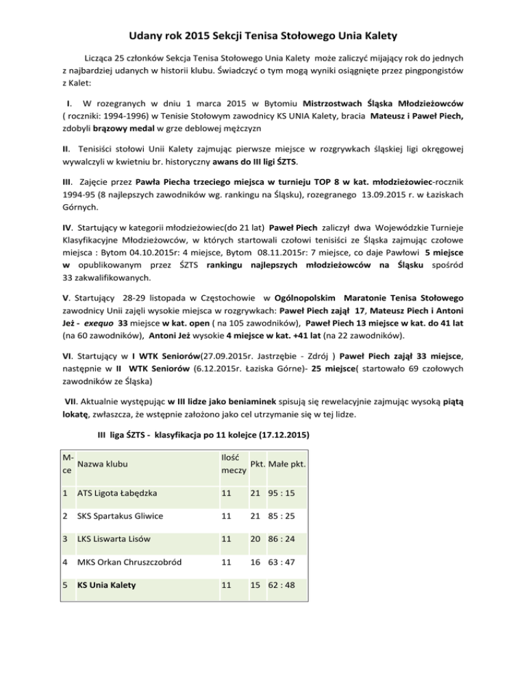 Udany rok 2015 Sekcji Tenisa Stołowego Unia Kalety Licząca 25 członków Sekcja Tenisa Stołowego Unia Kalety może zaliczyć mijający rok do jednych z najbardziej udanych w historii klubu. Świadczyć o tym mogą wyniki osiągnięte przez pingpongistów z Kalet: I. W rozegranych w dniu 1 marca 2015 w Bytomiu Mistrzostwach Śląska Młodzieżowców ( roczniki: 1994-1996) w Tenisie Stołowym zawodnicy KS UNIA Kalety, bracia Mateusz i Paweł Piech, zdobyli brązowy medal w grze deblowej mężczyzn II. Tenisiści stołowi Unii Kalety zajmując pierwsze miejsce w rozgrywkach śląskiej ligi okręgowej wywalczyli w kwietniu br. historyczny awans do III ligi ŚZTS. III. Zajęcie przez Pawła Piecha trzeciego miejsca w turnieju TOP 8 w kat. młodzieżowiec-rocznik 1994-95 (8 najlepszych zawodników wg. rankingu na Śląsku), rozegranego 13.09.2015 r. w Łaziskach Górnych. IV. Startujący w kategorii młodzieżowiec(do 21 lat) Paweł Piech zaliczył dwa Wojewódzkie Turnieje Klasyfikacyjne Młodzieżowców, w których startowali czołowi tenisiści ze Śląska zajmując czołowe miejsca : Bytom 04.10.2015r: 4 miejsce, Bytom 08.11.2015r: 7 miejsce, co daje Pawłowi 5 miejsce w opublikowanym przez ŚZTS rankingu najlepszych młodzieżowców na Śląsku spośród 33 zakwalifikowanych. V. Startujący 28-29 listopada w Częstochowie w Ogólnopolskim Maratonie Tenisa Stołowego zawodnicy Unii zajęli wysokie miejsca w rozgrywkach: Paweł Piech zajął 17, Mateusz Piech i Antoni Jeż - exequo 33 miejsce w kat. open ( na 105 zawodników), Paweł Piech 13 miejsce w kat. do 41 lat (na 60 zawodników), Antoni Jeż wysokie 4 miejsce w kat. +41 lat (na 22 zawodników). VI. Startujący w I WTK Seniorów(27.09.2015r. Jastrzębie - Zdrój ) Paweł Piech zajął 33 miejsce, następnie w II WTK Seniorów (6.12.2015r. Łaziska Górne)- 25 miejsce( startowało 69 czołowych zawodników ze Śląska) VII. Aktualnie występując w III lidze jako beniaminek spisują się rewelacyjnie zajmując wysoką piątą lokatę, zwłaszcza, że wstępnie założono jako cel utrzymanie się w tej lidze. III liga ŚZTS - klasyfikacja po 11 kolejce (17.12.2015) MNazwa klubu ce Ilość Pkt. Małe pkt. meczy 1 ATS Ligota Łabędzka 11 21 95 : 15 2 SKS Spartakus Gliwice 11 21 85 : 25 3 LKS Liswarta Lisów 11 20 86 : 24 4 MKS Orkan Chruszczobród 11 16 63 : 47 5 KS Unia Kalety 11 15 62 : 48 6 Klub Olimpijczyka Mysłowice 11 13 64 : 46 7 KKS Kolejarz Gliwice 11 12 61 : 49 8 KU AZS UŚ Katowice 11 12 56 : 54 9 MKS Skarbek II Tarnowskie Góry 11 10 53 : 57 10 UKS Wolej Ruda Śląska 11 9 54 : 56 11 LKS Strażak Mikołów 11 9 47 : 63 12 MKS Skarbek III Tarnowskie Góry 11 8 46 : 64 13 UKS Huragan II Sosnowiec 11 6 31 : 79 14 ULKS Ruch Pniów 11 2 33 : 77 15 TRS Millenium Myszków 11 2 23 : 87 16 AKS II Mikołów 11 0 21 : 89 Wyniki meczy: 30.09.15: KS Unia Kalety - KU AZS UŚ Katowice 7:3 07.10.15: SKS Spartakus Gliwice - KS Unia Kalety 7:3 15.10.15: KS Unia Kalety - Klub Olimpijczyka Mysłowice 6:4 21.10.15: TRS Millenium Myszków - KS Unia Kalety 1:9 29.10.15: KS Unia Kalety - UKS Wolej Ruda Śląska 6:4 04.11.15: LKS Liswarta Lisów - KS Unia Kalety 7:3 19.11.15: KS Unia Kalety - MKS Orkan Chruszczobród 6:4 25.22.15: LKS Strażak Mikołów - KS Unia Kalety 3:7 03.12.15: KS Unia Kalety - MKS Kolejarz Gliwice 6:4 09.12.15: ULKS Ruch Pniów - KS Unia Kalety 4:6 17.12.15: KS Unia Kalety - MKS Skarbek II Tarnowskie Góry 5:5 Wysokie 5 miejsce nasz zespół zajmuje głównie dzięki wspaniałej grze najmłodszego zawodnika Pawła Piecha, który na 22 gry indywidualne wygrał 17, a przegrał tylko 5 pojedynków. Ranking punktowy zawodników Unii: Paweł Piech – 17 pkt (22), Jakub Michalski -14 pkt (22), Krystian Mnich -10pkt (19), Antoni Jeż -5pkt (13), Mateusz Piech – 3pkt (12). Do rozegrania I rundy pozostały mecze: 14.01.15: KS Unia Kalety - UKS Huragan II Sosnowiec 20.01.15: ATS Ligota Łabędzka KS Unia Kalety 28.01.15: KS Unia Kalety - MKS Skarbek III Tarnowskie Góry 03.02.15: AKS II Mikołów KS Unia Kalety. VIII. Startująca w rozgrywkach o Puchar Polski (eliminacje wojewódzkie-) drużyna Unii awansowała do czwartej rundy (najlepszych 16 drużyn na 57 startujących). W I rundzie Unia miała wolny los, w II rundzie pokonała na wyjeździe JKTS Jastrzębie Zdrój 4:0, w III rundzie u siebie wygrała 4:2 z LITS Meble Anders II Żywiec. 12 stycznia 2016 Unia zmierzy się u siebie z TTS Polonia Bytom - drużyną zajmującą aktualnie 3 miejsce w II lidze. Mecz odbędzie się w sali gimnastycznej PSP 1 w Kaletach o 18.00. IX. Sukcesami może pochwalić się również grupa młodzików KS Unia Kalety utworzona we wrześniu br: - w rozegranych 21 listopada Otwartych Mistrzostwach Gminy Boronów w kat. szkół podstawowych Dawid Pająk zajął 2 miejsce, w kat. gimnazjum Aleksy Walczak 2, a Paweł Lebek 3 miejsce. – w Grand Prix Kalet do 16 lat ( 4 sobotnie turnieje we wrześniu i październiku) Aleksy Walczak zajął 1 miejsce, Jakub Skorupa( Lubsza)-2 m, Jakub Olszewski – 3 m, Maksymilian Biadacz – 4 m. Puchary ufundował Antoni Jeż. – w rozegranym 5 grudnia Mikołajkowym Turnieju Tenisa Stołowego w kat. szkół podstawowych zwyciężył Bartosz Wojtal, 2 m zajął Dawid Pająk, a 3 m – Jakub Olszewski. Nagrody dla wszystkich zawodników ufundowały szkoły: PSP 1 i Gimnazjum w Kaletach oraz działacz KS Unia Kalety-Grzegorz Guder. Ogółem w turnieju startowało 22 zawodników.