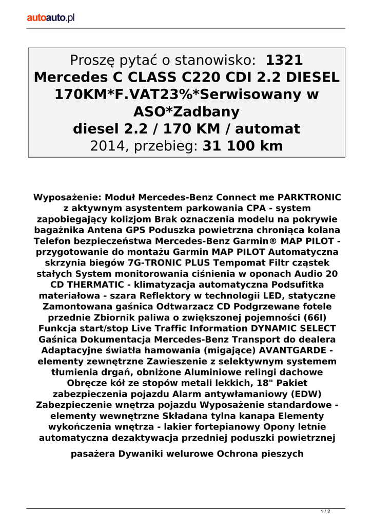 Proszę pytać o stanowisko: 1321 Mercedes C CLASS C220 CDI 2.2 DIESEL 170KM*F.VAT23%*Serwisowany w ASO*Zadbany diesel 2.2 / 170 KM / automat 2014, przebieg: 31 100 km Wyposażenie: Moduł Mercedes-Benz Connect me PARKTRONIC z aktywnym asystentem parkowania CPA - system zapobiegający kolizjom Brak oznaczenia modelu na pokrywie bagażnika Antena GPS Poduszka powietrzna chroniąca kolana Telefon bezpieczeństwa Mercedes-Benz Garmin® MAP PILOT przygotowanie do montażu Garmin MAP PILOT Automatyczna skrzynia biegów 7G-TRONIC PLUS Tempomat Filtr cząstek stałych System monitorowania ciśnienia w oponach Audio 20 CD THERMATIC - klimatyzacja automatyczna Podsufitka materiałowa - szara Reflektory w technologii LED, statyczne Zamontowana gaśnica Odtwarzacz CD Podgrzewane fotele przednie Zbiornik paliwa o zwiększonej pojemności (66l) Funkcja start/stop Live Traffic Information DYNAMIC SELECT Gaśnica Dokumentacja Mercedes-Benz Transport do dealera Adaptacyjne światła hamowania (migające) AVANTGARDE elementy zewnętrzne Zawieszenie z selektywnym systemem tłumienia drgań, obniżone Aluminiowe relingi dachowe Obręcze kół ze stopów metali lekkich, 18" Pakiet zabezpieczenia pojazdu Alarm antywłamaniowy (EDW) Zabezpieczenie wnętrza pojazdu Wyposażenie standardowe elementy wewnętrzne Składana tylna kanapa Elementy wykończenia wnętrza - lakier fortepianowy Opony letnie automatyczna dezaktywacja przedniej poduszki powietrznej pasażera Dywaniki welurowe Ochrona pieszych 1/2 Cena: 124 900 PLN netto Opiekun: Krzysztof Pomorski +48519022435 Al. Krakowska 178, Punkt C 2/2