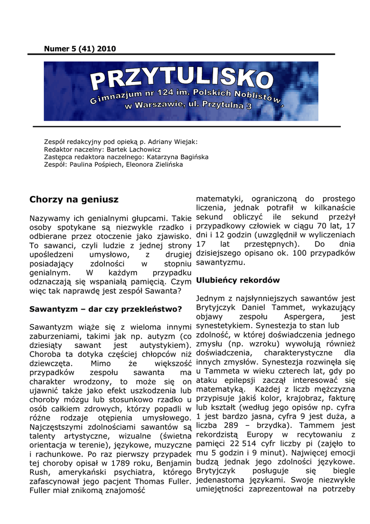 Numer 5 (41) 2010 Zespół redakcyjny pod opieką p. Adriany Wiejak: Redaktor naczelny: Bartek Lachowicz Zastępca redaktora naczelnego: Katarzyna Bagińska Zespół: Paulina Pośpiech, Eleonora Zielińska Chorzy na geniusz matematyki, ograniczoną do prostego liczenia, jednak potrafił w kilkanaście sekund obliczyć ile sekund przeżył przypadkowy człowiek w ciągu 70 lat, 17 dni i 12 godzin (uwzględnił w wyliczeniach 17 lat przestępnych). Do dnia dzisiejszego opisano ok. 100 przypadków sawantyzmu. Nazywamy ich genialnymi głupcami. Takie osoby spotykane są niezwykle rzadko i odbierane przez otoczenie jako zjawisko. To sawanci, czyli ludzie z jednej strony upośledzeni umysłowo, z drugiej posiadający zdolności w stopniu genialnym. W każdym przypadku odznaczają się wspaniałą pamięcią. Czym Ulubieńcy rekordów więc tak naprawdę jest zespół Sawanta? Jednym z najsłynniejszych sawantów jest Brytyjczyk Daniel Tammet, wykazujący Sawantyzm – dar czy przekleństwo? objawy zespołu Aspergera, jest synestetykiem. Synestezja to stan lub Sawantyzm wiąże się z wieloma innymi zaburzeniami, takimi jak np. autyzm (co zdolność, w której doświadczenia jednego dziesiąty sawant jest autystykiem). zmysłu (np. wzroku) wywołują również charakterystyczne dla Choroba ta dotyka częściej chłopców niż doświadczenia, dziewczęta. Mimo że większość innych zmysłów. Synestezja rozwinęła się przypadków zespołu sawanta ma u Tammeta w wieku czterech lat, gdy po charakter wrodzony, to może się on ataku epilepsji zaczął interesować się ujawnić także jako efekt uszkodzenia lub matematyką. Każdej z liczb mężczyzna choroby mózgu lub stosunkowo rzadko u przypisuje jakiś kolor, krajobraz, fakturę osób całkiem zdrowych, którzy popadli w lub kształt (według jego opisów np. cyfra różne rodzaje otępienia umysłowego. 1 jest bardzo jasna, cyfra 9 jest duża, a Najczęstszymi zdolnościami sawantów są liczba 289 – brzydka). Tammem jest talenty artystyczne, wizualne (świetna rekordzistą Europy w recytowaniu z orientacja w terenie), językowe, muzyczne pamięci 22 514 cyfr liczby pi (zajęło to i rachunkowe. Po raz pierwszy przypadek mu 5 godzin i 9 minut). Najwięcej emocji tej choroby opisał w 1789 roku, Benjamin budzą jednak jego zdolności językowe. posługuje się biegle Rush, amerykański psychiatra, którego Brytyjczyk jedenastoma językami. Swoje niezwykłe zafascynował jego pacjent Thomas Fuller. umiejętności zaprezentował na potrzeby Fuller miał znikomą znajomość filmu dokumentalnego, miał nauczyć się mówić po islandzku w siedem dni. Ostatniego dnia miał występ na żywo w islandzkiej telewizji i ku zdumieniu wszystkich Daniel był w stanie rozmawiać z islandzkimi redaktorami bez żadnych problemów. Zapytany w jaki sposób tak szybko się uczy, odpowiada: ,, Mam synestezję, co pomaga. Jeśli istnieje związek między tym, jak wizualizuję dane słowo i jego znaczeniem, łatwiej mi je zapamiętać. Dla przykładu, jeśli słowo oznaczające „ogień” w nowym języku wygląda dla mnie jakby było pomarańczowe, pomaga mi to je zapamiętać. Jednak bardziej istotna jest moja pamięć i zdolność do zauważania wzorców i znajdowania związków między słowami. (...)”. Tammem swoją ogromną zdolnośc matematyczną przypisuje ,,łagodnemu” autyzmowi: ,, Kiedy dorastałem, nie miałem przyjaciół z powodu swojego autyzmu. Liczby wypełniły lukę. Liczby stały się żywe. Mój umysł był w stanie wyłapać wzorce i znaleźć w nich sens.”. Więcej na temat tego niesamowitego człowieka możemy przeczytać w jego autobiografii ,,Urodzony niebieskiego dnia” (gdyż środa kojarzy mu się z barwą niebieską). Innym znanym sawantem jest Kim Peek. Odznaczał się wspaniałą pamięcią i zdolnościami matematycznymi. Mimo ogólnym zaburzeń rozwoju i umysłowych, znał na pamięć 12 000 książek, a także Znał historię każdego kraju, każdego władcy, jego daty panowania, małżonka i historię. Na podstawie podanej daty urodzenia, w ciągu kilku sekund obliczał dzień tygodnia, w którym dana osoba skończy 65 lat. Rozpoznawał ze słuchu większość utworów muzycznych, podając jednocześnie datę i miejsce ich powstania oraz datę urodzenia i śmierci kompozytora. Postać Kima Peeka posłużyła w 1988 twórcom filmu Rain Man jako pierwowzór postaci Raymonda Babbita. Sekrety mózgu Naukowcy od lat próbowali zbadać to niezwykłe zjawisko, stosując różne metody. Hipotezy dotyczące sawantyzmu formułowane przez naukowców sugerują przyczynę upośledzenia jako uszkodzenia lewej półkuli mózgu i dominujących w niej procesów pobudzające prawą do zwiększenia aktywności w nadrobienia utraconych funkcji - wtedy dochodzi do ekspresji niezwykłych zdolności sawantów. Do końca niewiadomo jednak, co wpływa na tak niesamowite cechy i zdolności sawantów. Trudne życie geniusza Można by pomyśleć, że sawanci, choć są często niedorozwinięci lub autystykami, mają życie usłane różami. Świetnie orientują się w terenie, mają doskonałą pamięć, niezwykłe talenty malarskie czy muzyczne… kto z nas nie chciałby znać kilkunastu języków? Jednak ludziom tym trudno jest wykorzystywać swoje talenty do celów naukowych, często ich niesamowite zdolności mają negatywne odbicie w codziennym życiu. Na przykład Tammetowi z trudem przychodzą tak proste czynności jak zakupy w supermarkecie. Mówi: ,,Muszę patrzeć na każdy kształt i fakturę. Każda cena, każdy układ owoców i warzyw od razu zaprząta mi umysł. Więc zamiast myśleć:" Co miałem kupić oprócz sera?” zaczynam liczyć owoce na stoisku”. Codzienne czynności są wykonywane ze ścisłym harmonogramem, każde osunięcie w czasie czy zmiana nawet miejsca tak drobnej rzeczy jak grzebień, bardzo irytuje Tammeta. ,,Próbowałem być bardziej elastyczny i nie zwracać uwagi na takie drobnostki, ale to silniejsze od