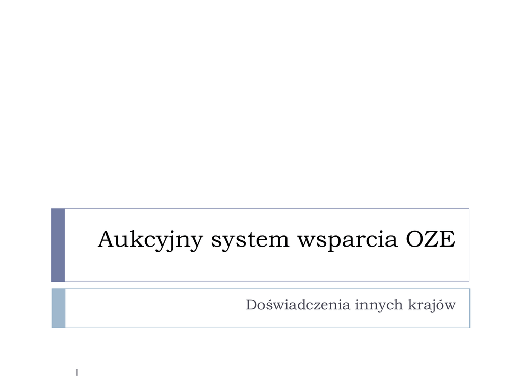Aukcyjny system wsparcia OZE Doświadczenia innych krajów 1 Brazylia 2 System aukcyjny w Brazylii (1) Aukcje dla dużych instalacji, głównie wiatr i energia wodna; Dla poszczególnych technologii, lub neutralne technologicznie; Szkolenia dla firm dotyczące przeprowadzania aukcji żeby zwiększyć konkurencję; Wsparcie w postaci gwarancji zakupu po określonej cenie przez 15 (biomasa), 20 (PV, wiatr) i 30 (energia wodna) lat; Możliwy handel uprawnieniami do korzystania ze wsparcia na rynku wtórnym (30%). 3 System aukcyjny w Brazylii (2) System kwalifikacji: Dokumentacja (pozwolenia środowiskowe, warunki przyłączenia) Kaucja w wysokosci 1% wartości inwestycji dla pierwszego etapu i 5% dla drugiego. Kary: W przypadku zawinionego opóźnienia o ponad rok: Anluowanie kontraktu i utrata kaucji (dotychczas nie wykorzystane w praktyce) Produkcja energii powinna się mieścić w granicach 90130% zakontraktowanej mocy (bilansowanie 5-roczne). 4 System aukcyjny w Brazylii (3) Skutki aukcji Ceny dla energii wiatrowej w 2010 roku na poziomie €58.63/MWh, ale…. 5 Inwestorzy korzystają z ulg podatkowych w wysokości do 30% wartości inwestycji; Preferencyjne oprocentowanie kredytów Narodowego Banku Rozwoju Gospodarczego i Socjalnego; W wielu miejscach doskonałe warunki do rozwoju energetyki wiatrowej; Chęć inwestorów do wejścia na rynek brazylijski nawet w obliczu ewentualnych strat. Mniejsi gracze wypchnięci z rynku W 2012 roku pomiędzy 40-65% projektów nie zostało zrealizowanych. Holandia 6 System aukcyjny w Holandii Wprowadzony w 2011 roku – SDE+; Dotyczy ciepła, gazu i energii elektrycznej z OZE; Granicę wsparcia stanowi budżet (2013 - €3 mld), nie moc, Osobne rundy ze wzrastającą ceną – ryzyko wyczerpania budżetu; Osobne wsparcie na B&R dla nowych i drogich technologii. 7 System aukcyjny w Holandii Wymagania przedaukcyjne Licencja środowiskowa Business plan Kary za niezrealizowanie tylko dla projektów o wartości powyżej €400 mln; Stopień realizacji projektow z 2011 roku – 40% (początek 2014); Ceny uzyskane na giełdzie – pomiędzy 7 - 9 eurocentów/ kWh 8 Dania 9 System aukcyjny w Danii Aukcje dla morskiej energetyki wiatrowej; Dwie fazy: Faza wstępna – oferty niewiążące Faza finalna – oferty wiążące Dla projektów „near offshore“ conajmniej 20% wartości projektu musi być w posiadaniu społeczności lokalnych mieszkających w pobliżu planowanego projektu; Stałe taryfy („sliding feed-in premium“) dla 50 000 pełnych godzin pracy (50.000 MWh/MW); Ogromne wsparcie władz dla realizacji projektów – 10 brak zbędnej biurokracji, przewidywalność wsparcia, wszystkie pozwolenia do uzyskania w jednym miejscu. Francja 11 System aukcyjny dla małej fotowoltaiki Przedmiotem aukcji są instalacje będące częścią budynku o mocy100-250 kW; Wielokrotne aukcje w ciągu roku (5 w 2012); Wymagania Żadnych gwarancji finansowych Inwestor musi być właścicielem budynku Inwestor musi przedstawić: Szacunkowy wpływ instalacji na redukcję dwutlenku węgla Informację o recyclingu instalacji po jej deinstalacji Cena uzyskana w 2012 roku: pomiędzy 19-23 eurocentów/kWh (Niemcy: około 15 eurocentów). 12 Porównanie kosztu kapitału we Francji i w Niemczech Źródło:Thilo Grau (2014) „Comparison of Feed-in Tariffs and Tenders to Remunerate Solar Power Generation”, DIW Discussion Papers 13 Niemcy 14 Projekty pilotażowe w Niemczech Według propozycji Ministerstwa Gospodarki z lipca 2014 roku: Pierwsze aukcje pilotażowe już w roku 2015; Aukcje powinny się odbywać wielokrotnie w ciągu roku – w roku 2015 conajmniej 2-3 razy; Aukcji zostanie poddane 600 MW rocznie – oczekuje się, że nie wszystkie projekty, ktore wygrają aukcję, zostaną zrealizowane; Zmiana systemu wsparcia powinna umożliwić zachowanie „rożnorodności aktorów“ inwestujących w OZE 15 Projekty pilotażowe w Niemczech Forma aukcji: „Pay-as-Bid“ – niejawne, wiążące oferty zgłaszane w określonym terminie; Inwestorzy będą proponowali określoną ilość zainstalowanej mocy (max 25 MW dla PV) przy odpowiedniej cenie; Zostanie ogłoszona cena maksymalna żeby przy braku konkurencji uniknąć zbyt wysokich kosztów; Nie będzie ceny minimalnej. 16 Projekty pilotażowe w Niemczech – kwalifikacja ofert Przewiduje się mix kryteriów „materialnych“ i finansowych Kryteria materialne: Kryteria finansowe: 17 Uwzględnienie projektu w planie zagospodarowania terenu Promesa przyłączenia do sieci. Kaucja gwarantująca zapłatę ewentualnej kary w wysokości pomiędzy €25-50 za kW niezrealizowanej inwestycji Dla niektórych aktorów, takich jak spółdzielnie, wysokość kaucji może zostać znacznie obiniżona, jeżeli spełnią one kryteria materialne. Projekty pilotażowe w Niemczech - kryteria decydujace o wygraniu aukcji Najniższe oferty (cena za kWh) otrzymają wsparcie w postaci zmiennej premii zależnej od ceny energii elektrycznej => de facto FiTs; Początkowo kwestie systemowe i obszar geograficzny nie będą brane pod uwagę; Prawo do otrzymania określonego wsparcia będzie ograniczone do danego projektu lub osoby fizycznej (nie „osoby prawnej“). 18 Projekty pilotażowe w Niemczech – zachowanie „różnorodności aktorów“ 19 Projekty pilotazowe w Niemczech – zachowanie „różnorodności aktorów“ Żeby zachować różnorodność aktorów, rozważano: Zdecydowano się na: Zachowanie istniejącego modelu wsparcia dla istniejących aktorów; Przeprowadzanie dla niektórych z nich (np. spółdzielnie) osobnych aukcji; Preferencyjne traktownaie niektórych rodzajów aktorów Wprowadzenie najprostszego z możliwych rodzajów aukcji; Możliwość wyboru pomiędzy kryteriami materialnymi i finansowymi dostępu do aukcji Oczekuje się bowiem, że zwłaszcza społdzielnie i firmy lokalne będą miały mniejsze problemy z uzyskaniem niezbędnych pozwoleń Decyzja ta nie jest ostateczna – BWMi prosi o sugestie dotyczące możl